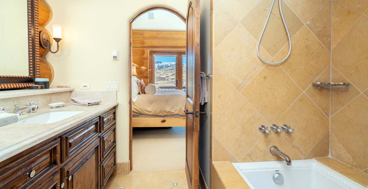 The great room upstairs has sky high ceilings and a wall full of windows facing the mountains. Imagine yourself sitting around the huge gas fireplace after a long day of skiing, or sitting on one of the north facing decks in the summer enjoying the mountain breeze. There is a convenient powder room located off the entertaining area.