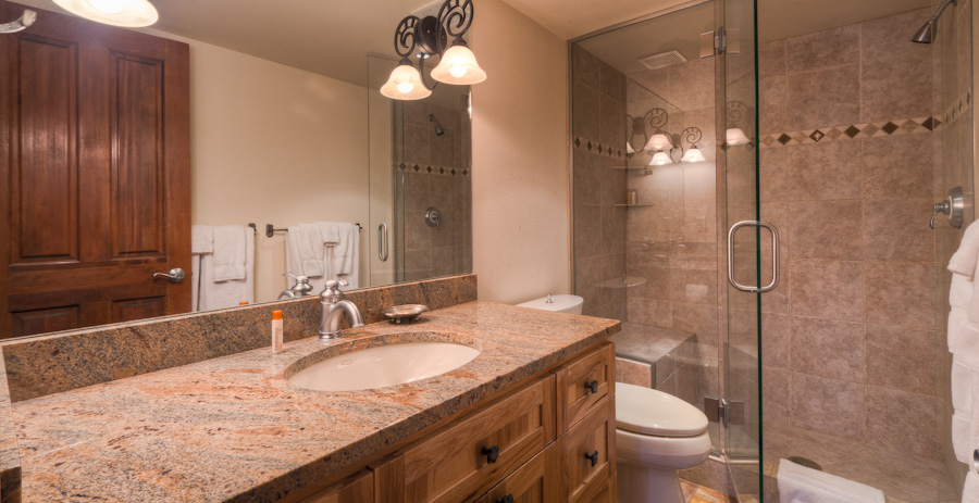 The gourmet kitchen is open to the adjacent dining area and the living room a half level below it. The living room level has a deck with a grill facing the Mountain views. Two twin bedrooms are on the entry level, with one of the bedrooms able to convert to a King. A Queen Guest room is on the level above. The King Master Suite features a separate sitting area, and full en-suite bath with a steam shower.