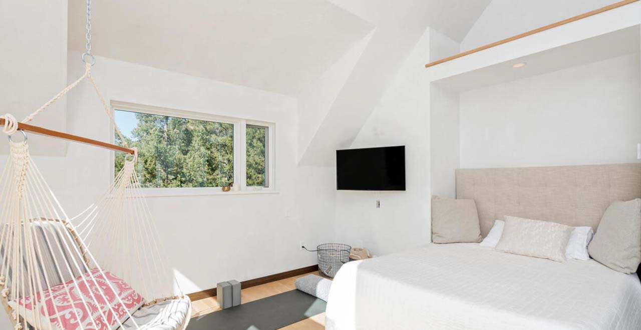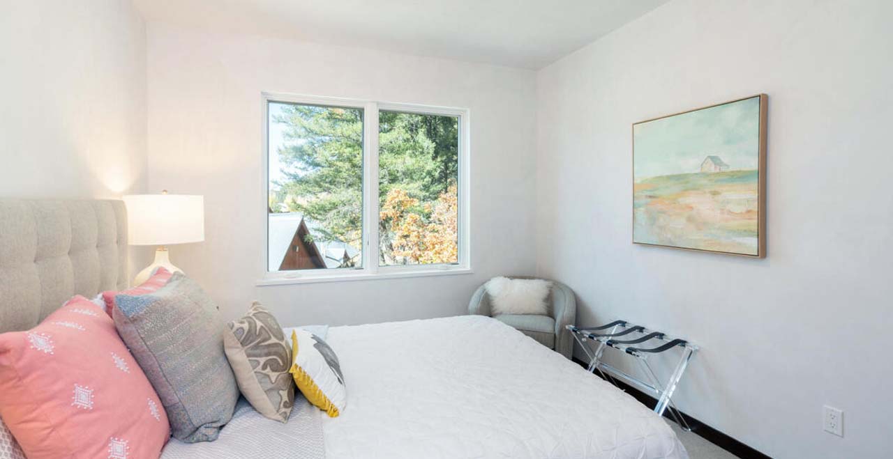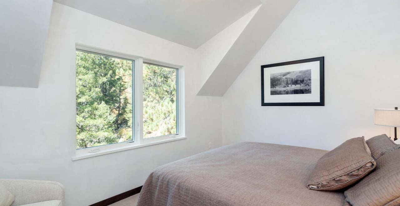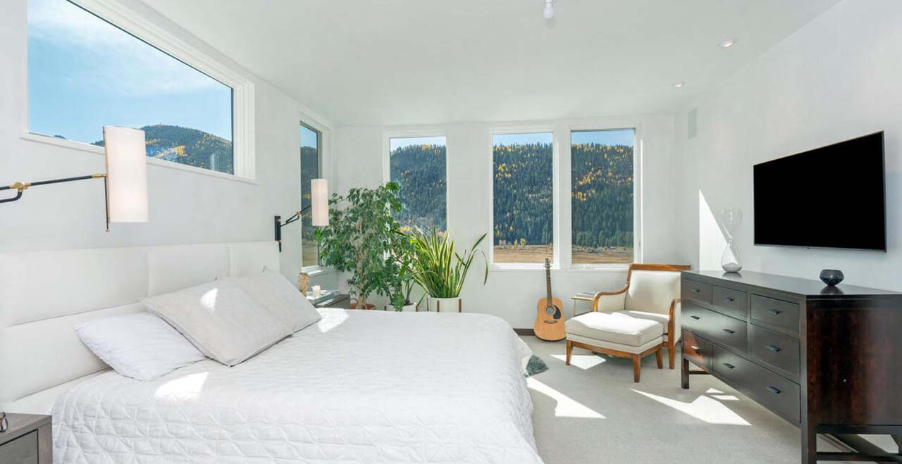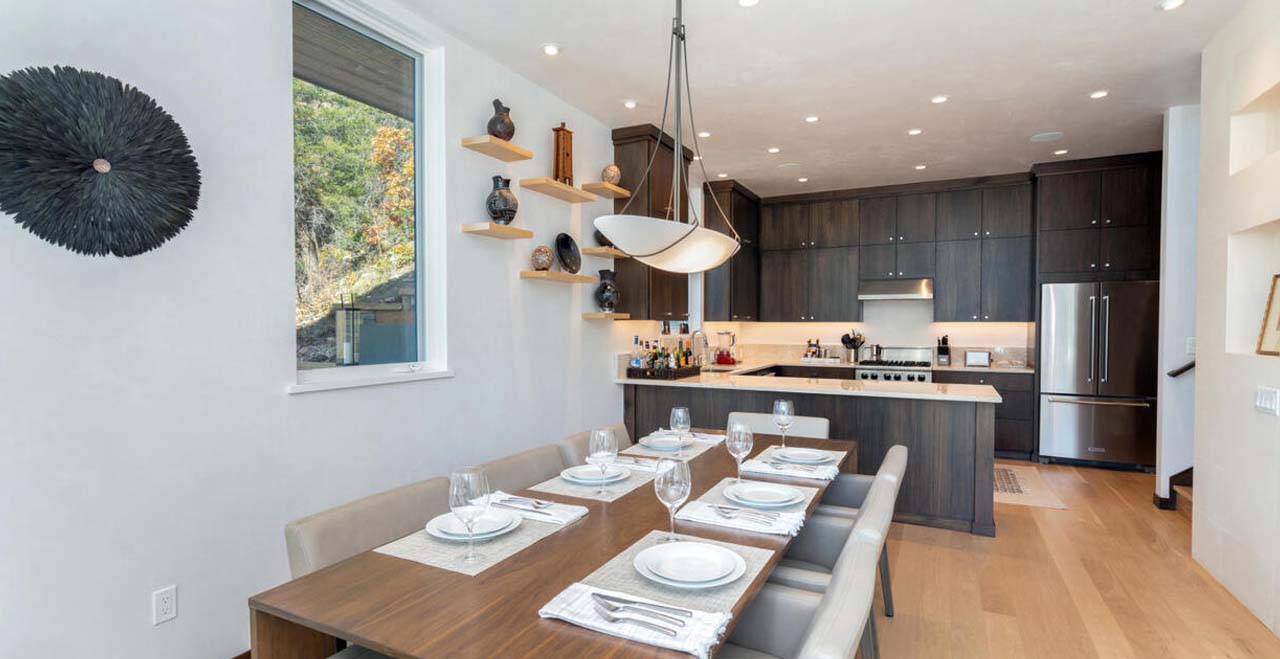 Built in 2018 with luxurious finishes throughout including white oak floors, hand-troweled plaster walls, walnut trim and cabinets, and high-end appliances, this home was refurnished in October of 2020 with all new furniture, bedding, kitchenware and linens (new pictures coming soon!) From the entry level, take a flight of stairs to the spacious main living area, including a fully-equipped kitchen, powder bath, dining and living areas, complete with a smart TV with surround sound and a Bluetooth sound system, and a powder bath. From there, head out to the spacious, furnished patio, featuring a new grill and dining area to relax, entertain and enjoy incredible mountain, valley and sunset views. A second flight of stairs leads to the spacious master bedroom featuring a King bed, smart TV, large closet and Ensuite bathroom. Next to the Master is the laundry area, with full size washer and dryer, and a guest room featuring a Queen bed and bathroom with a full size tub and shower. Another flight of stairs leads to the third guest room featuring a King bed, lofted ceilings and incredible views, a full bathroom, and the fourth guest room. The fourth, large guest room features a Queen bed, a Queen sleeper sofa, an adjustable desk, and a second furnished patio – combining a perfect place to work or exercise with amazing views. There is a parking space in the spacious, heated garage and another in front of the home.