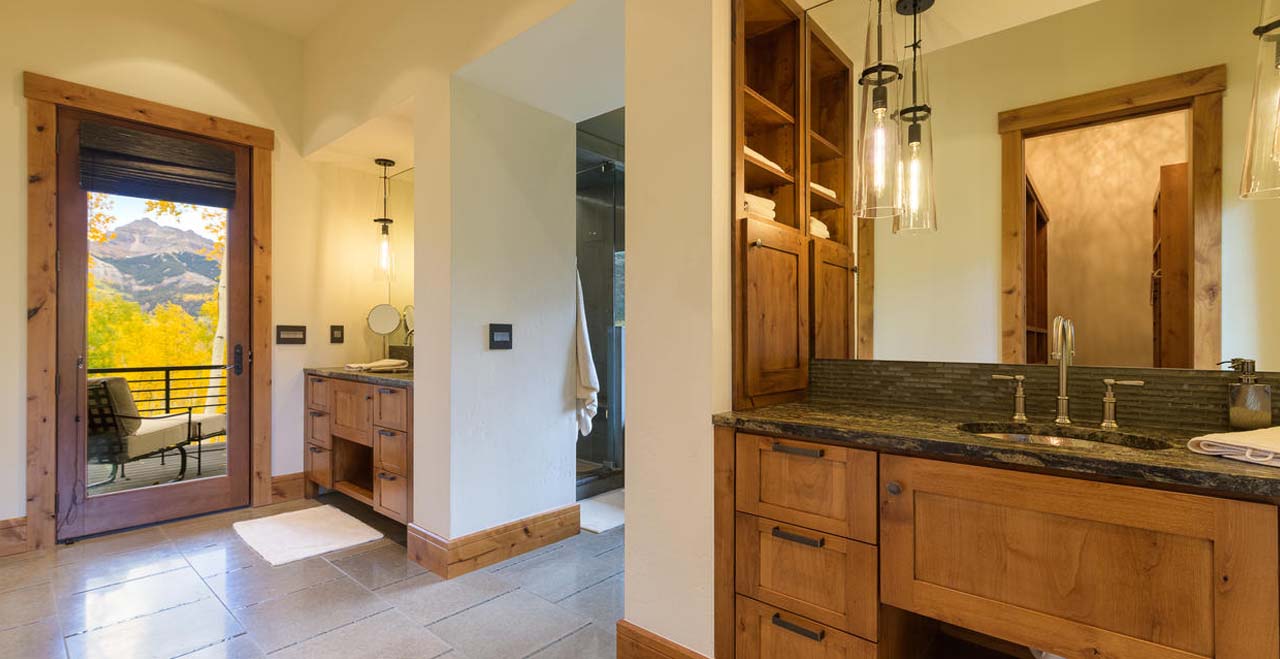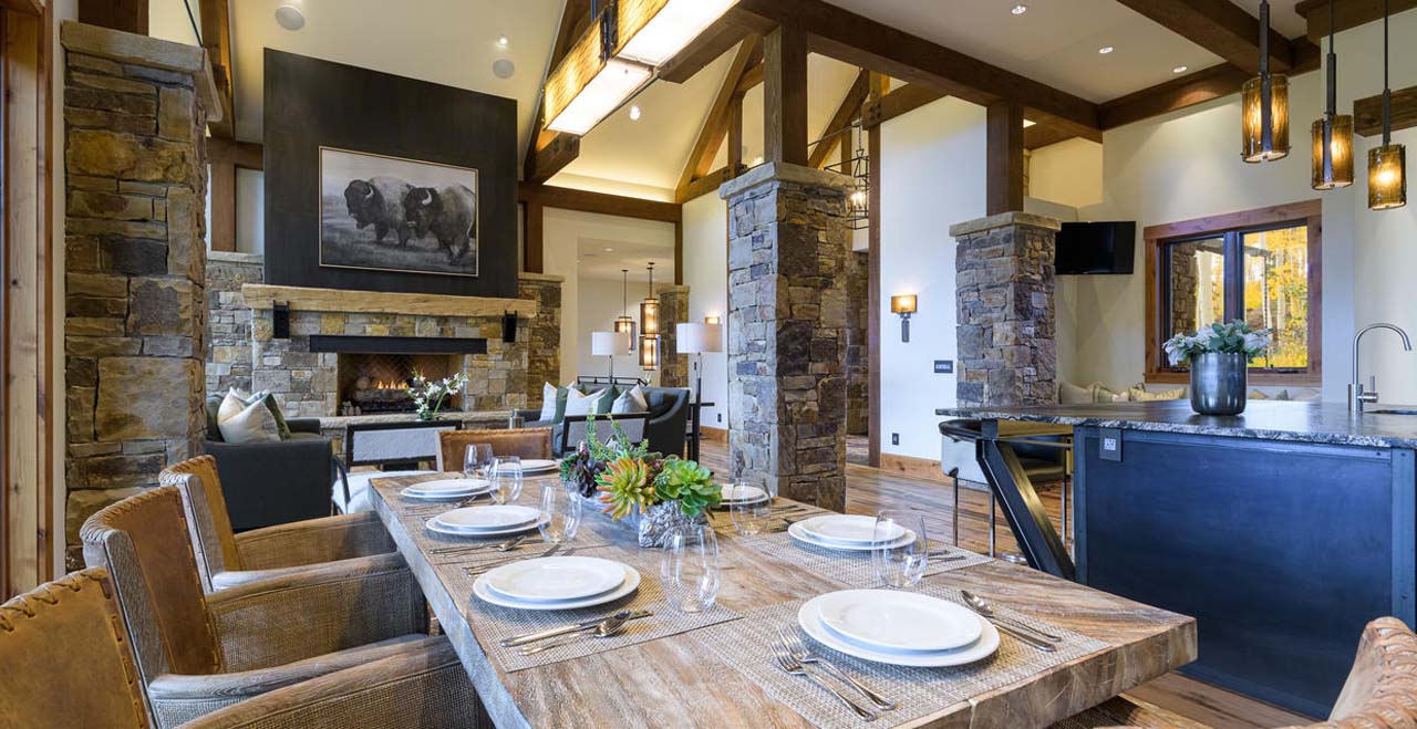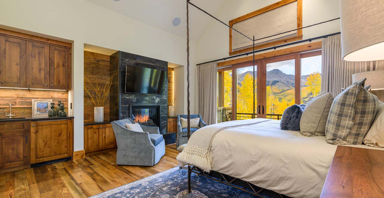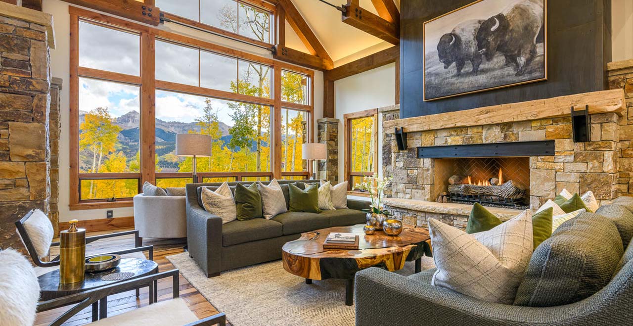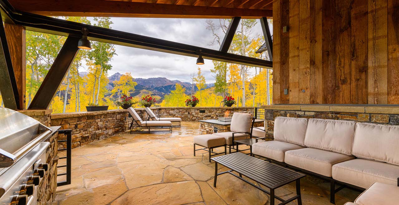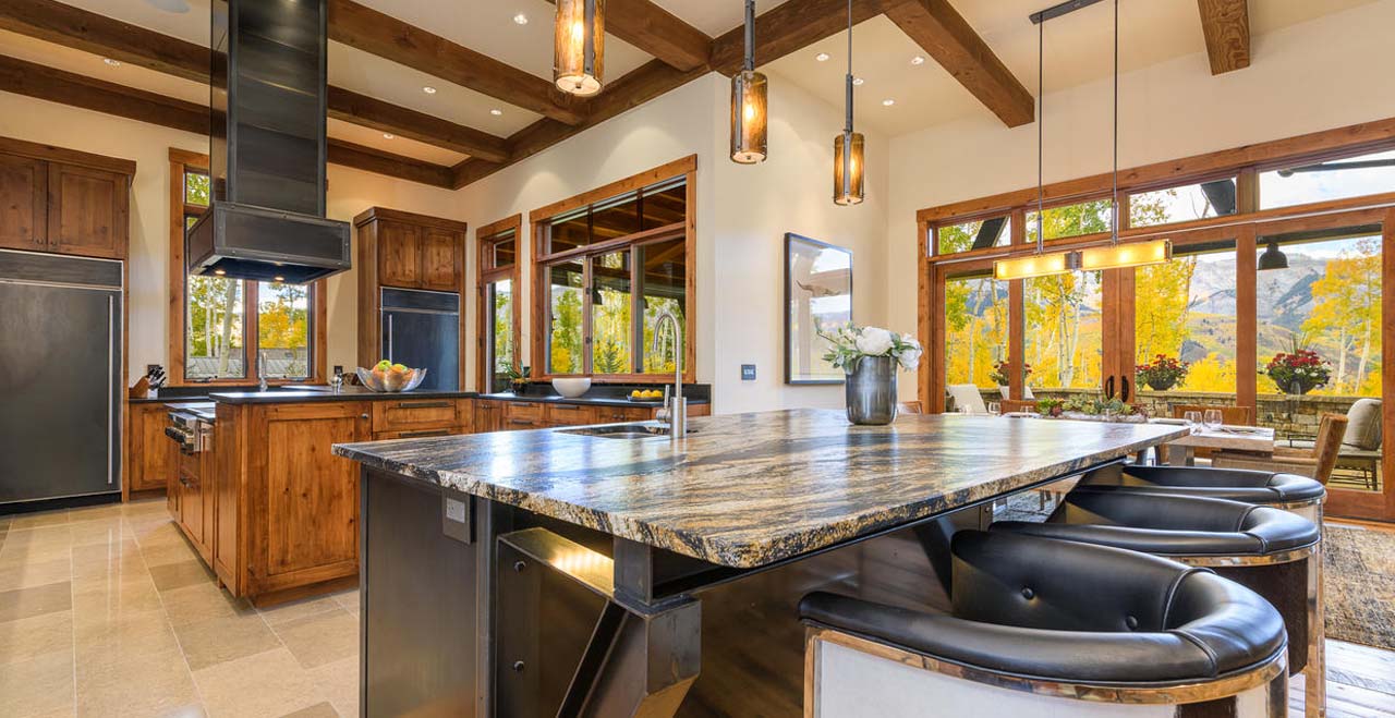 Guests can take in extraordinary views from just about every room in the house. An expansive patio extends from a covered breezeway to an open-air terrace with a fire table that allows for year-round enjoyment. From the outdoor hot tub, guests can look out over the soaring aspens to Telluride’s famous ridgelines. The interior living spaces are perhaps just as breathtaking as the surrounding scenery. Exposed wood beams, chiseled granite, and live-edge furnishings give the space a rustic flair without compromising its refined feel.