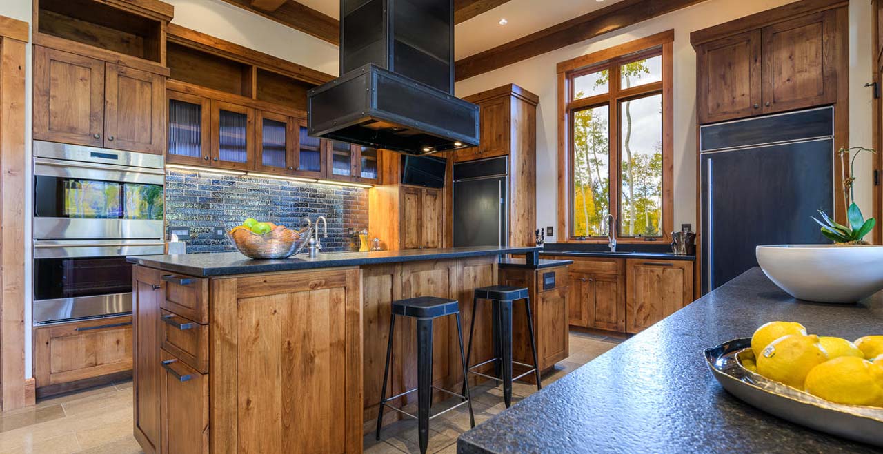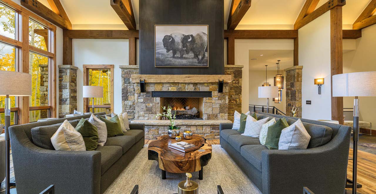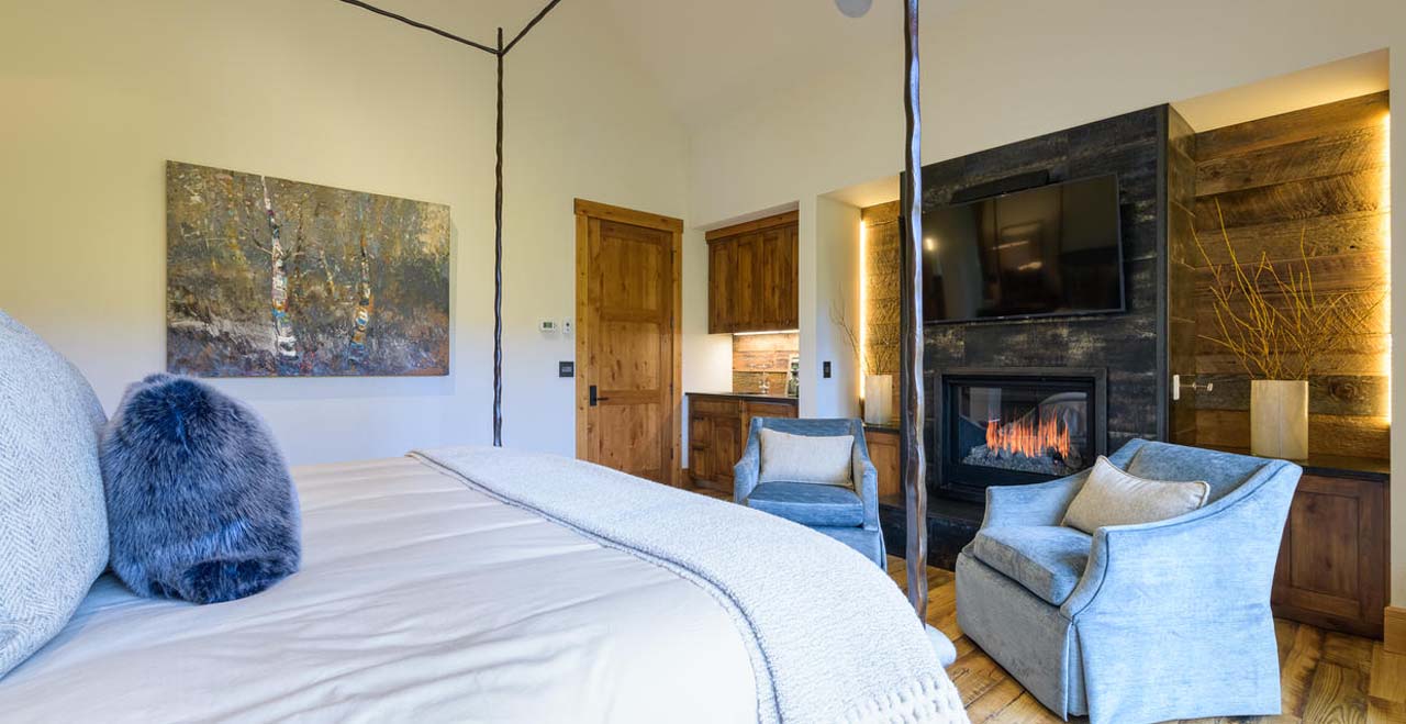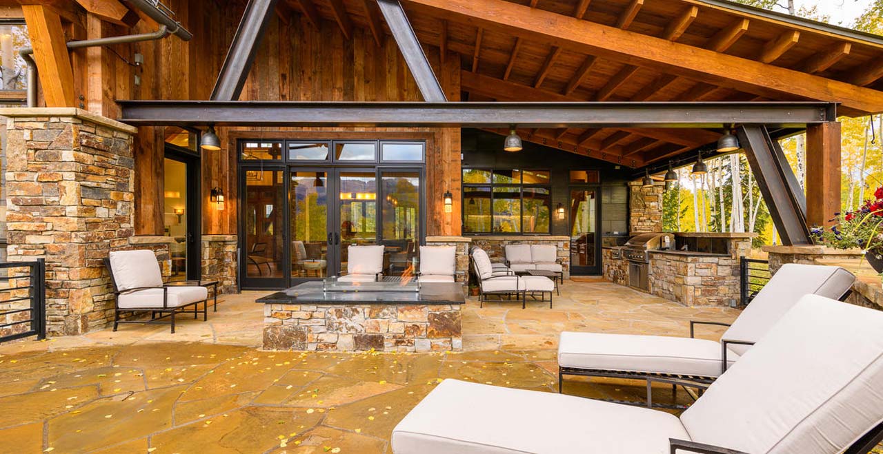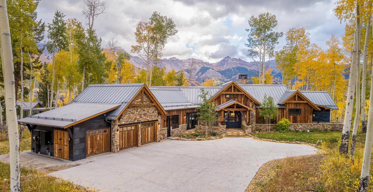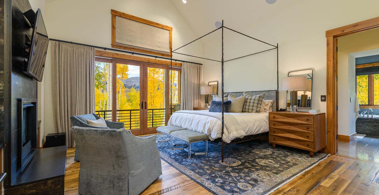 Guests can take in extraordinary views from just about every room in the house. An expansive patio extends from a covered breezeway to an open-air terrace with a fire table that allows for year-round enjoyment. From the outdoor hot tub, guests can look out over the soaring aspens to Telluride’s famous ridgelines. The interior living spaces are perhaps just as breathtaking as the surrounding scenery. Exposed wood beams, chiseled granite, and live-edge furnishings give the space a rustic flair without compromising its refined feel.