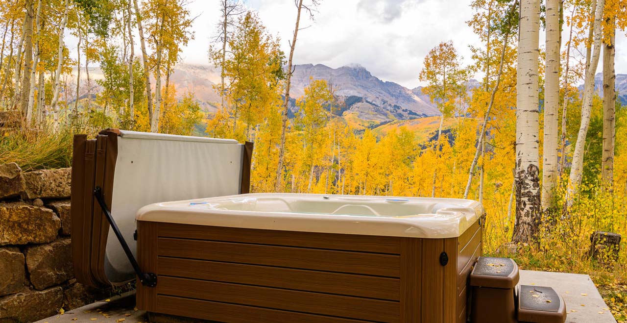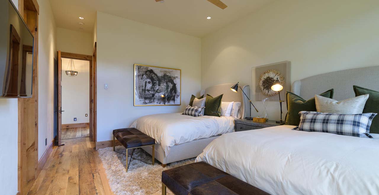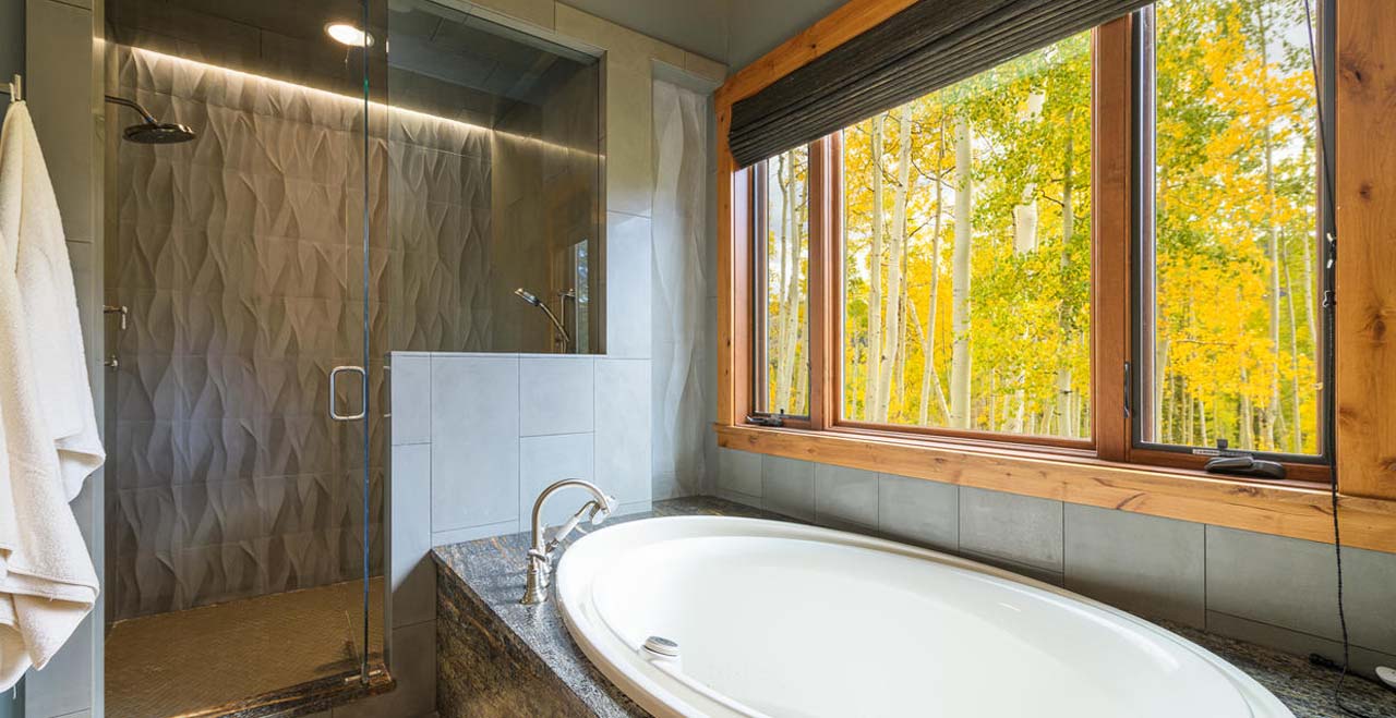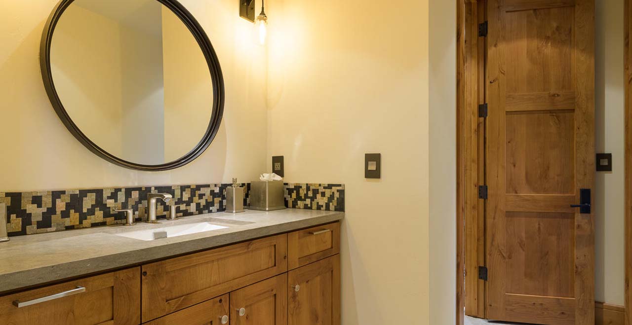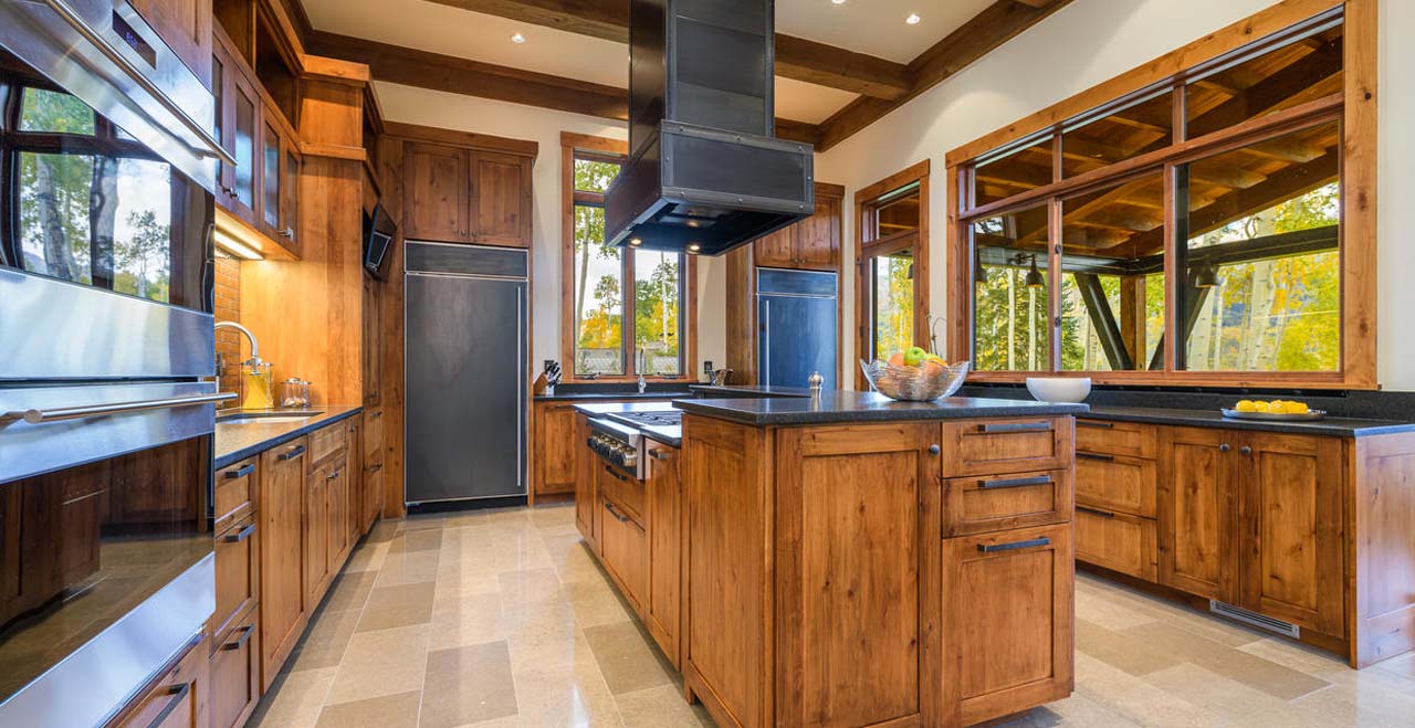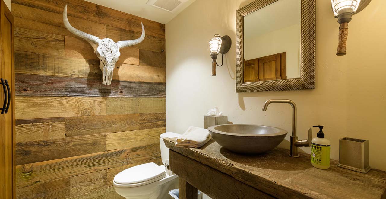 Guests can take in extraordinary views from just about every room in the house. An expansive patio extends from a covered breezeway to an open-air terrace with a fire table that allows for year-round enjoyment. From the outdoor hot tub, guests can look out over the soaring aspens to Telluride’s famous ridgelines. The interior living spaces are perhaps just as breathtaking as the surrounding scenery. Exposed wood beams, chiseled granite, and live-edge furnishings give the space a rustic flair without compromising its refined feel.