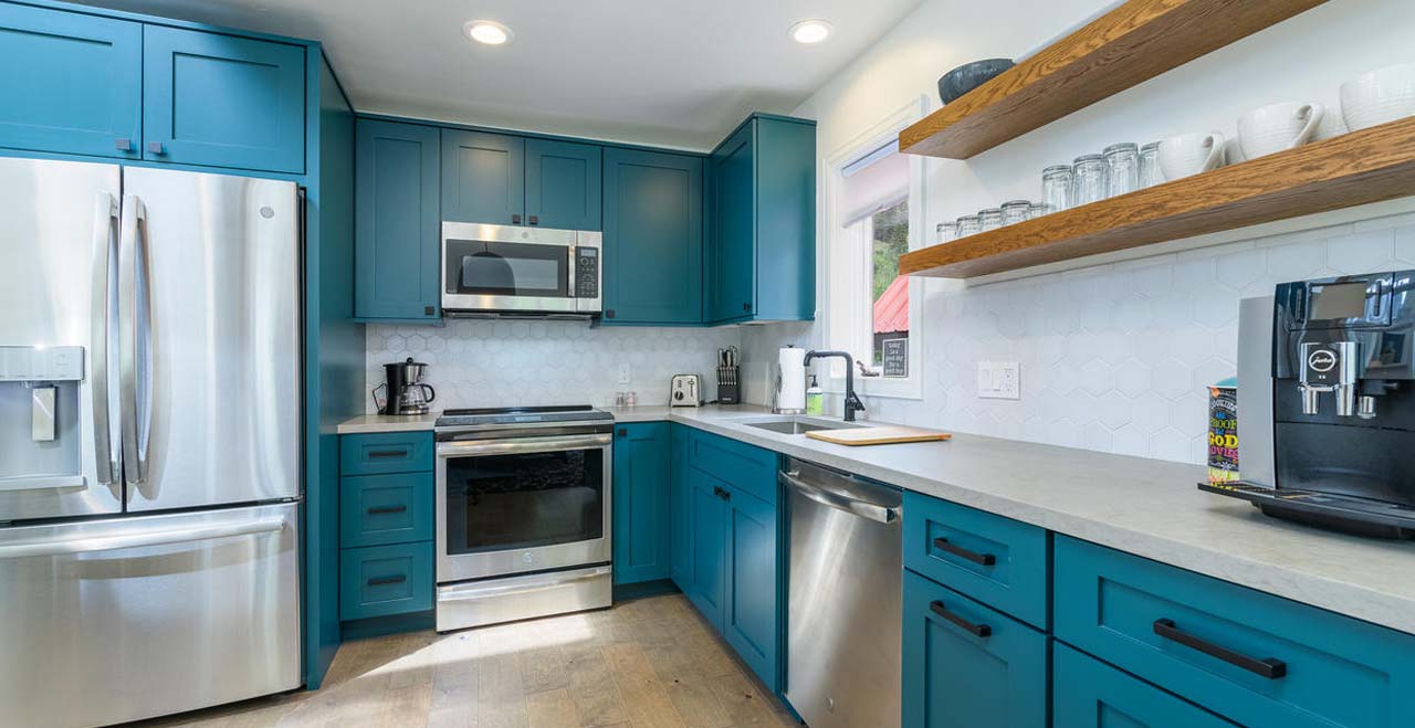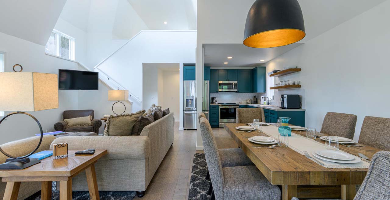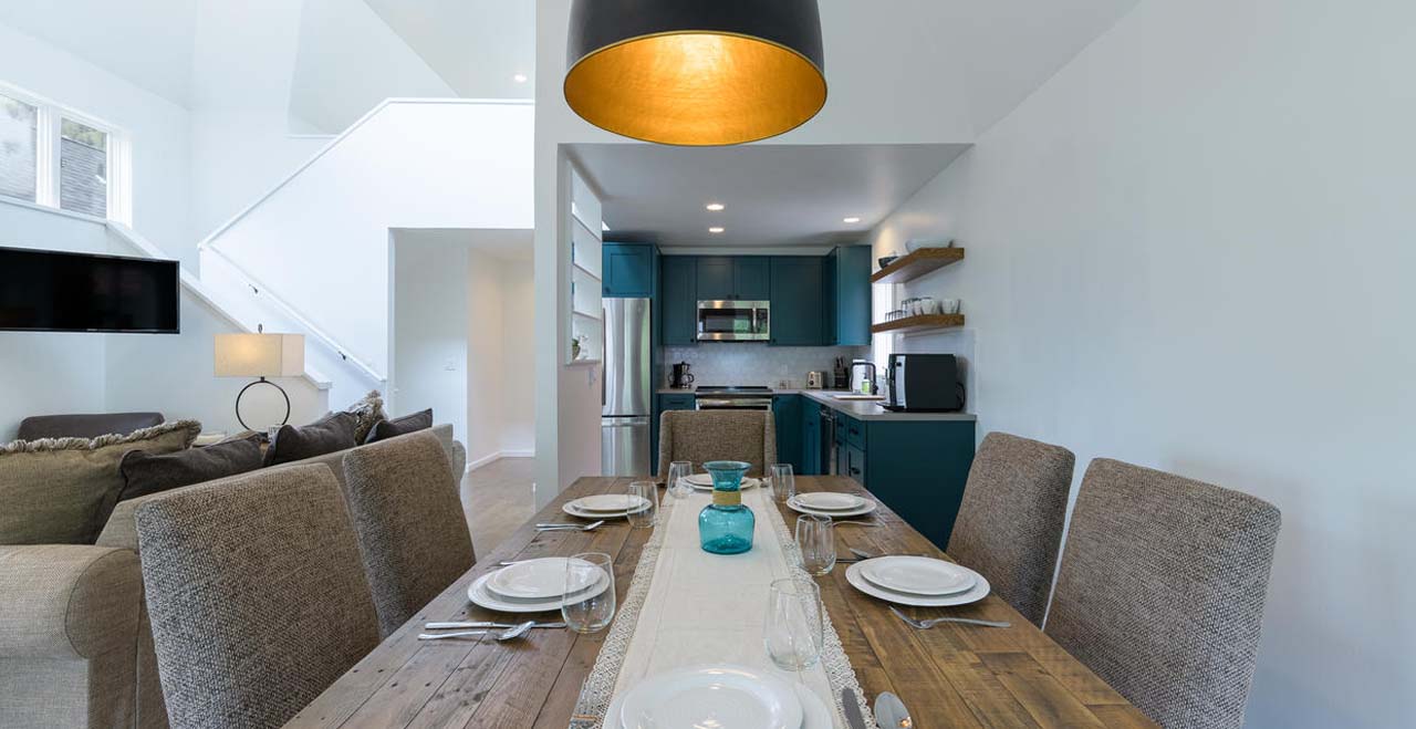 The kitchen features stainless steel appliances and plenty of counter space for cooking, and the dining area has a sturdy butcher block table with seating for six guests.