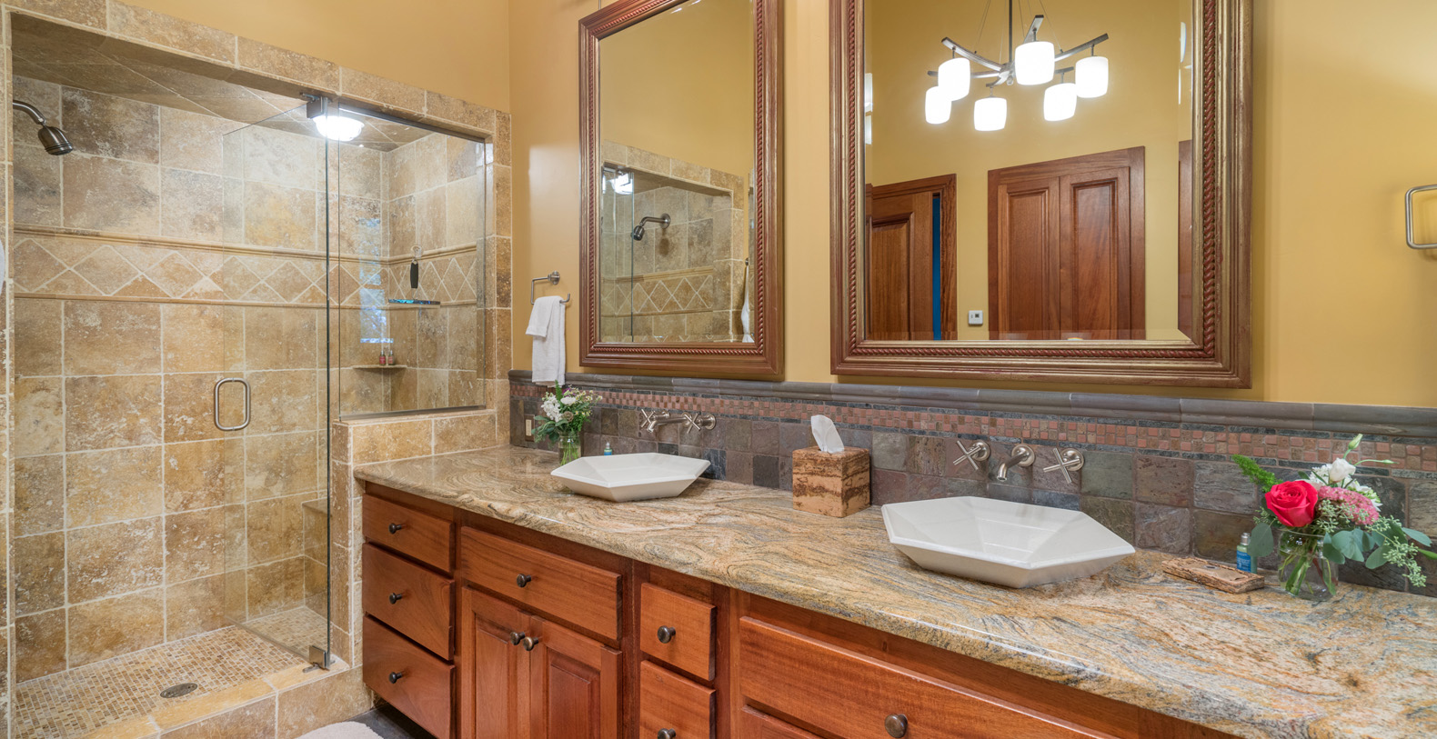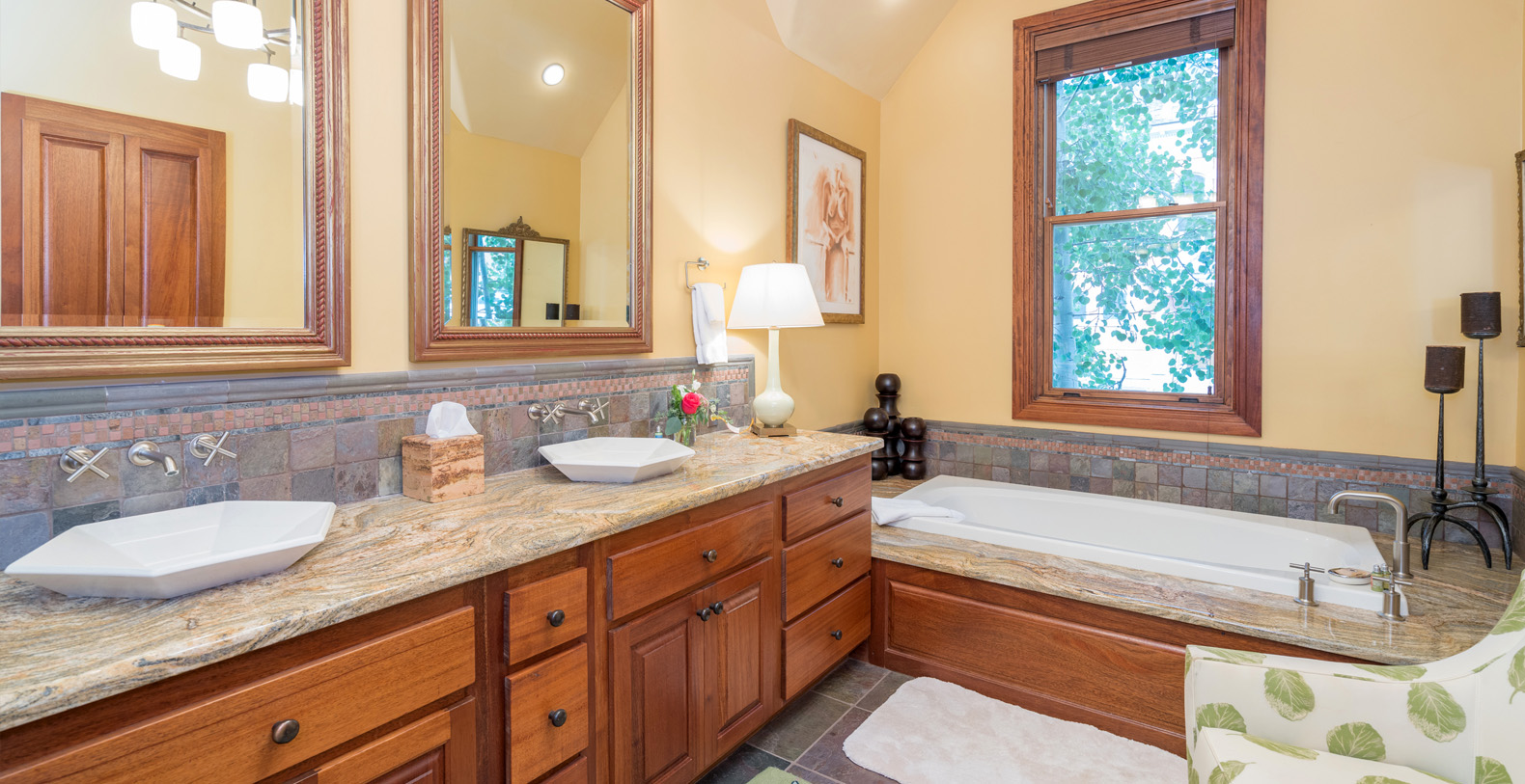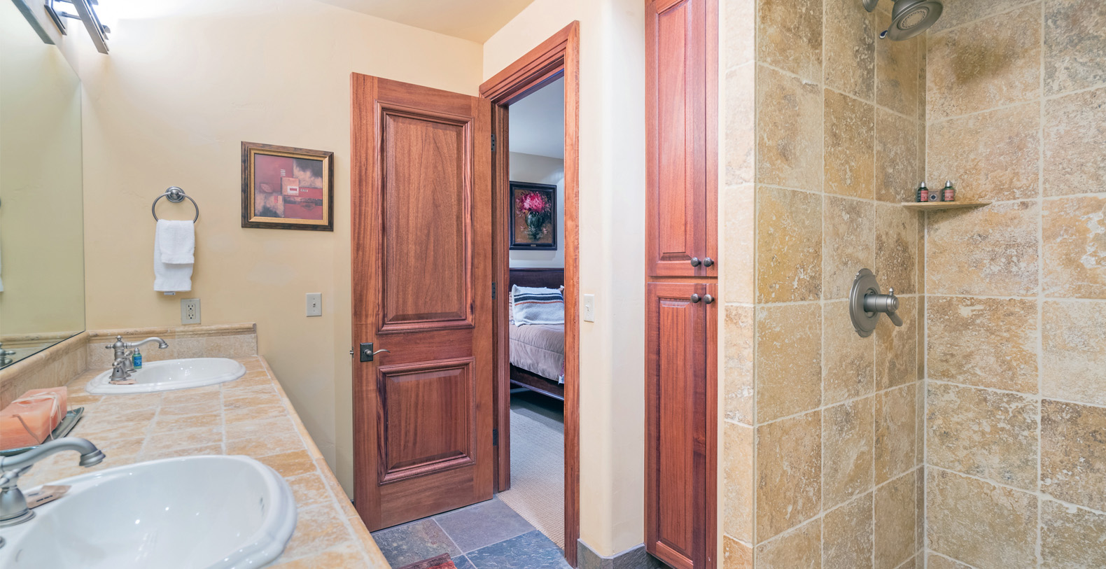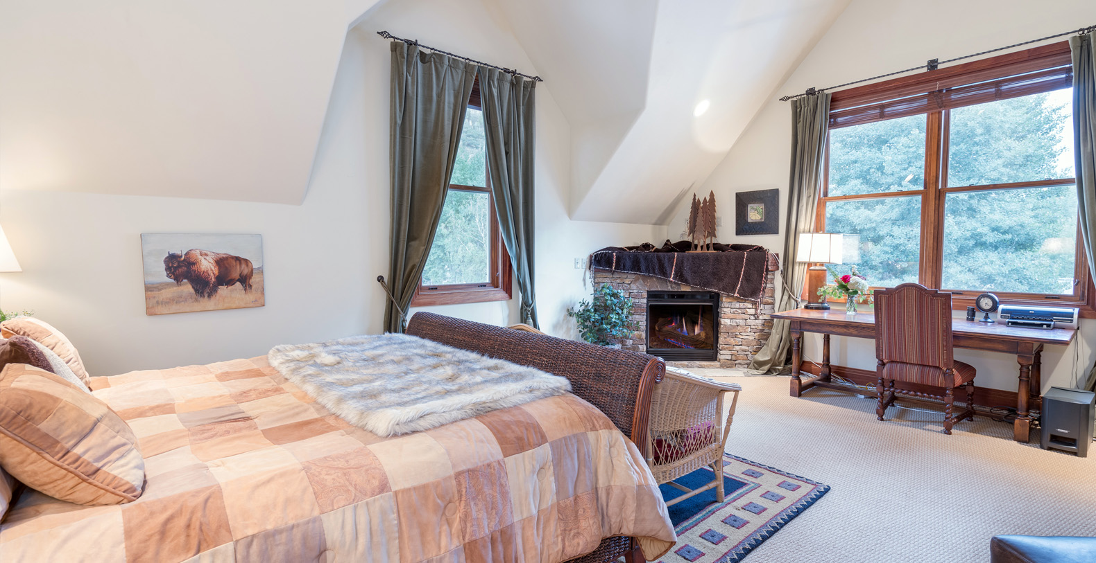 Occupying the entire top floor is the Master Suite, with a king bed, vaulted ceilings and a gas fireplace. There is a large walk-in closet, a desk and a lounge area with TV and comfortable seating. Large east facing windows frame the unfettered view of the Telluride Box Canyon. The expansive master bath features granite counters, double sink, a steam shower and a jetted tub.