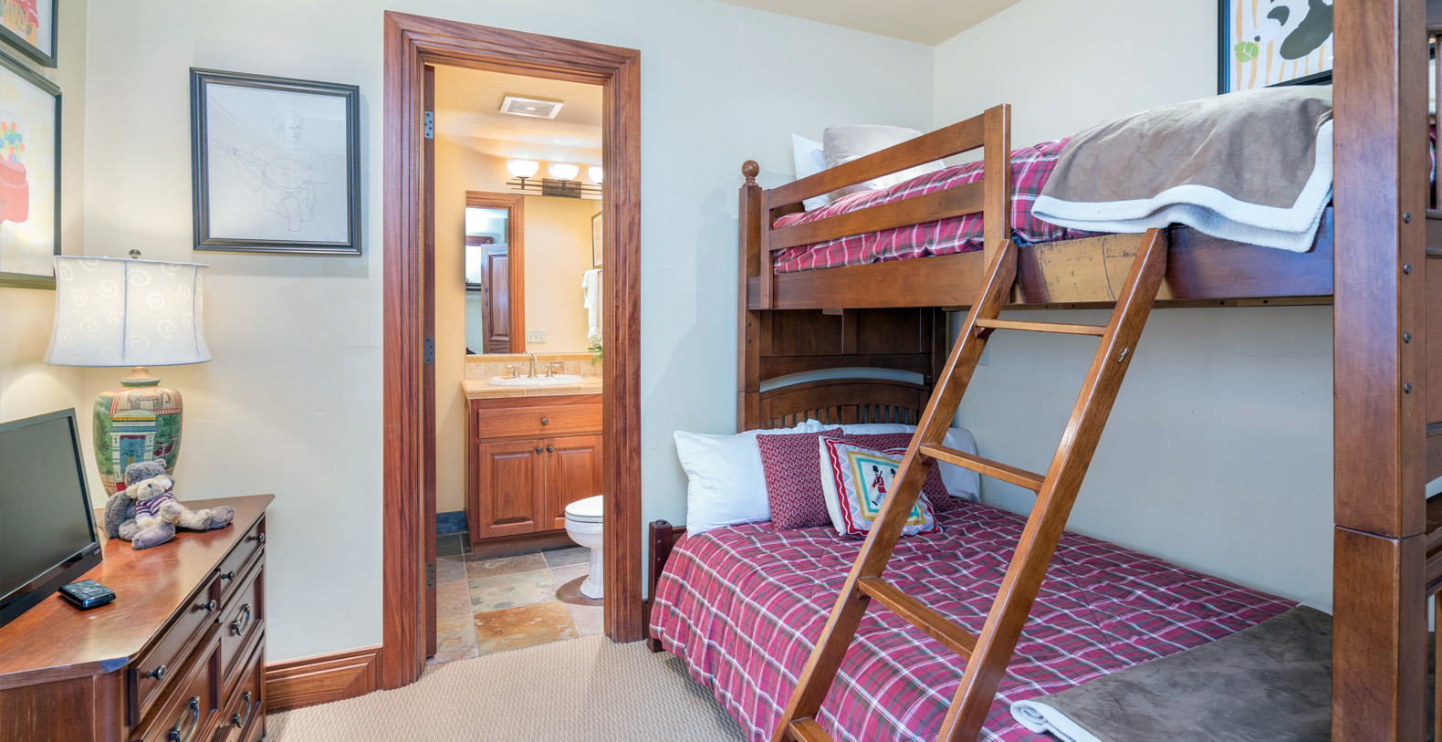 On the lowest floor of this 3-level condominium are two bedrooms. The first bedroom has a queen bed, flat screen TV and en suite bath with shower only. The second bedroom features a captain’s bunk, flat screen TV and en suite bath with shower-tub combo. The private laundry facilities are on this level. There is also a door to the outside from this level with plenty of room for ski and boot storage.