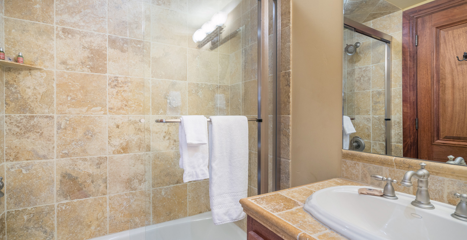 From the front porch you enter this 3-bedroom unit in the main living area. The living room is equipped with a state-of-the-art electronics package, a large TV and lush, enveloping furniture. A native stone fireplace provides warmth and ambiance. Adjoining is the dining room with seating for eight. The open kitchen features granite counter tops and the finest appliances, including a Thermador Professional Range. A convenient half-bath completes this level. The main living level is designed with a spacious layout, providing ample room for the group to gather before or after the day's adventure.