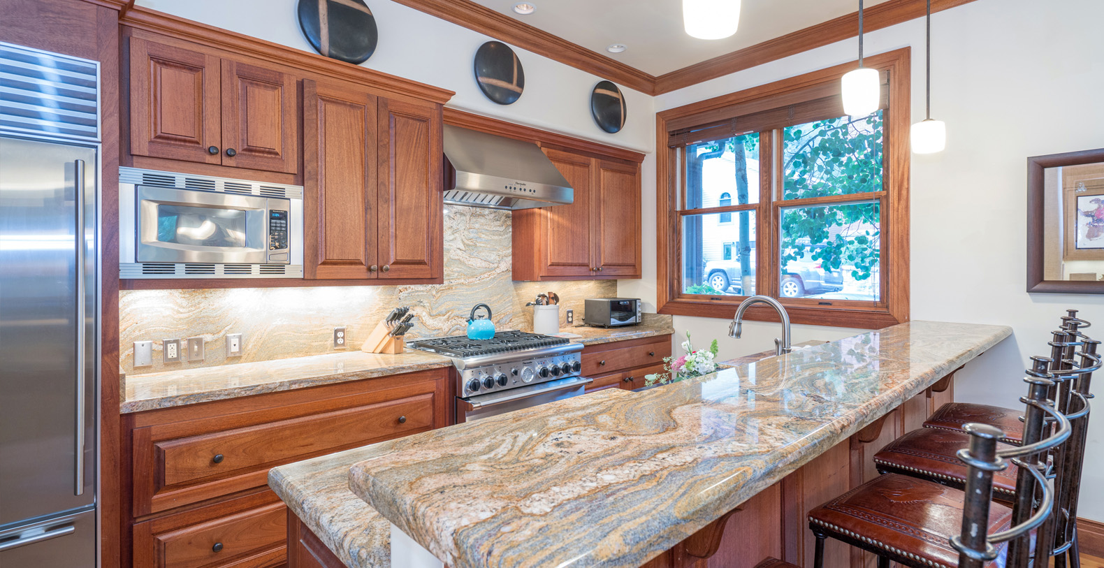 This condominium comes with one off-street parking space and free wireless Internet. There is a gas grill on the front porch of unit #A, which is shared by the other Tres Casa condos. The common outdoor hot tub shared between the three units is located on the west side of the building.