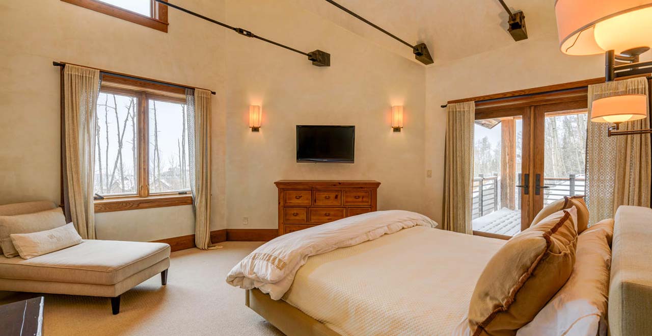 Like the spacious modern kitchen, complete with its island breakfast bar and additional sitting area should you need a rest there too. From there, head to the formal dining area. Large families are welcomed, as the table can comfortably seat 14. Full from your delicious meal? Just head to the TV den and mark your territory before winding down the day. Another way to do that is to head out to your centrally located deck for a soak in the outdoor hot tub. We recommend getting that fire pit going to maximize the effect. And with all this activity happening while you’re awake, a good night’s sleep will double in importance. And everyone will surely get one.