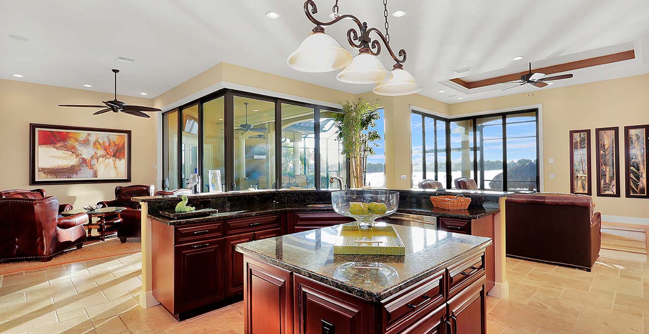 Enjoy the outdoors with an infinity saltwater pool with swim up bar and spa. The covered lanai includes a fully equipped summer kitchen with a BBQ grill, fridge and plenty of outdoor furniture. For additional sunbathing, relax on the large travertine deck along the lake adjacent to a Tiki hut and boat dock with lift.