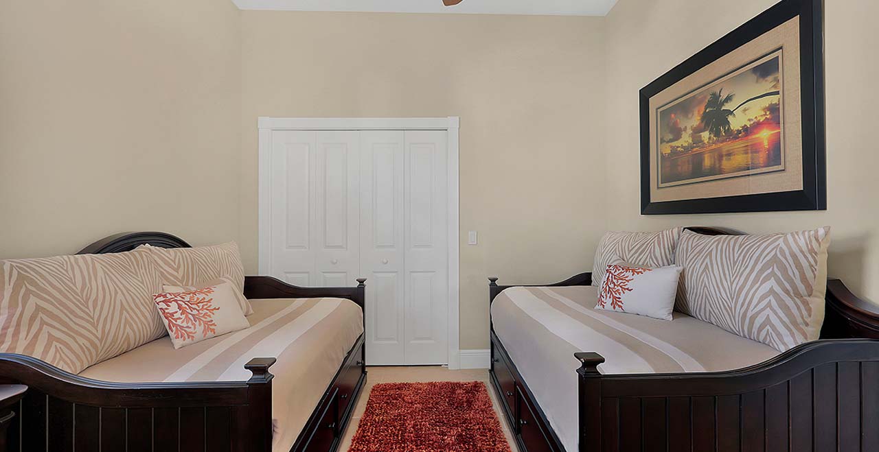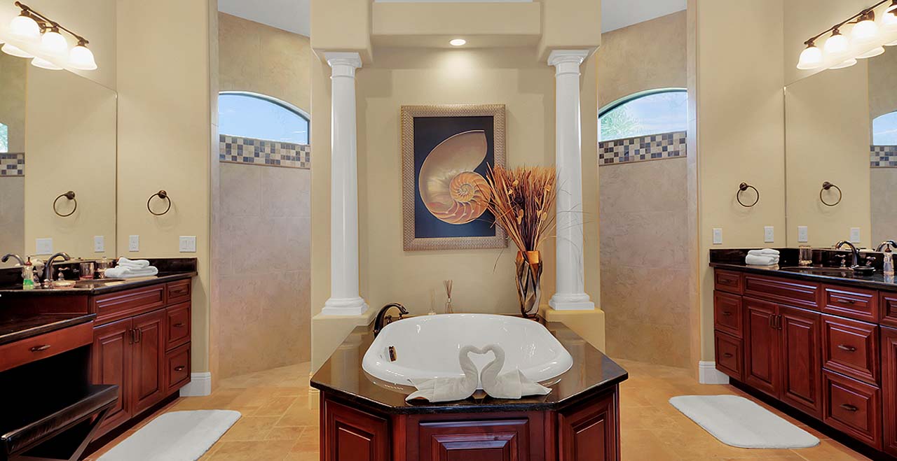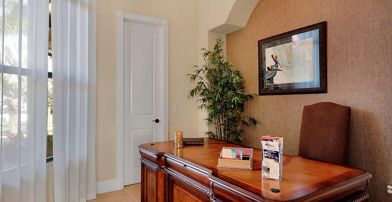 This luxury rental includes a Master and Guest Suite with ensuite bathrooms, walk-in closets, TVs, sound system, outside access and views of Britannia Lake. The two guest bedrooms have 2 twin beds, TVs – one with ensuite bathroom and the other adjacent to the 1st floor bathroom. This home comfortably sleeps 8 guests. The spacious great room offers a family room and gourmet kitchen well equipped with granite countertops, stainless steel appliances, island and breakfast bar. In the family room you can enjoy a 55' flat screen TV, DVD player and 5.1 Dolby surround sound system. The butler’s pantry has a wine fridge and leads to a formal dining room. In case you need to work while on vacation, you have a separate office with a desk, fax machine and free wireless high-speed internet throughout.