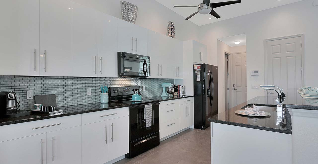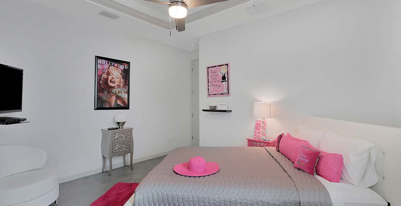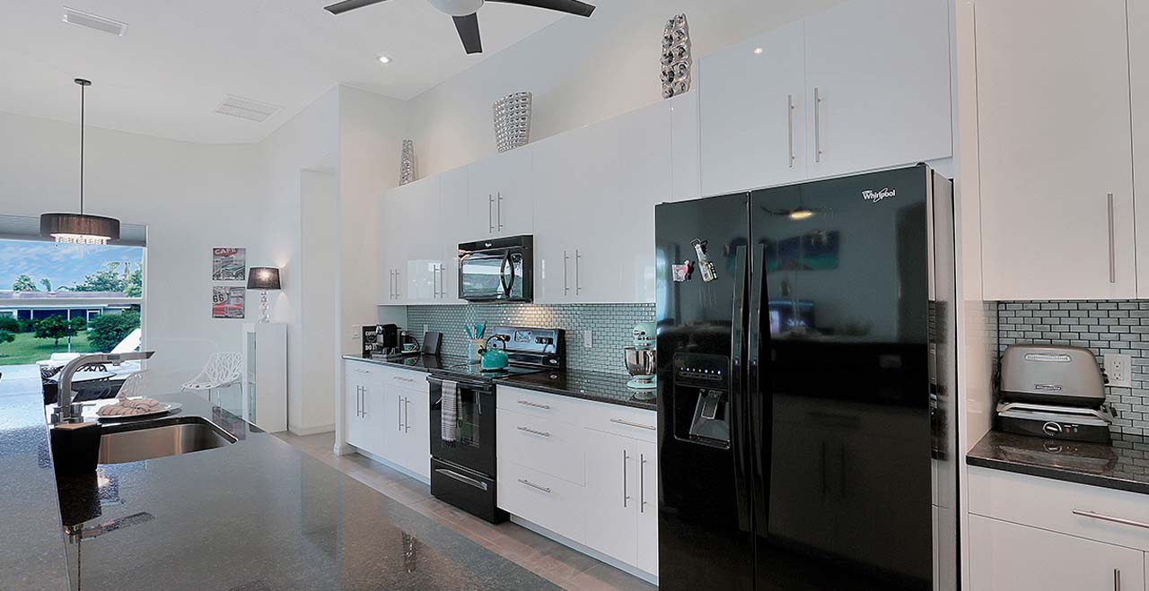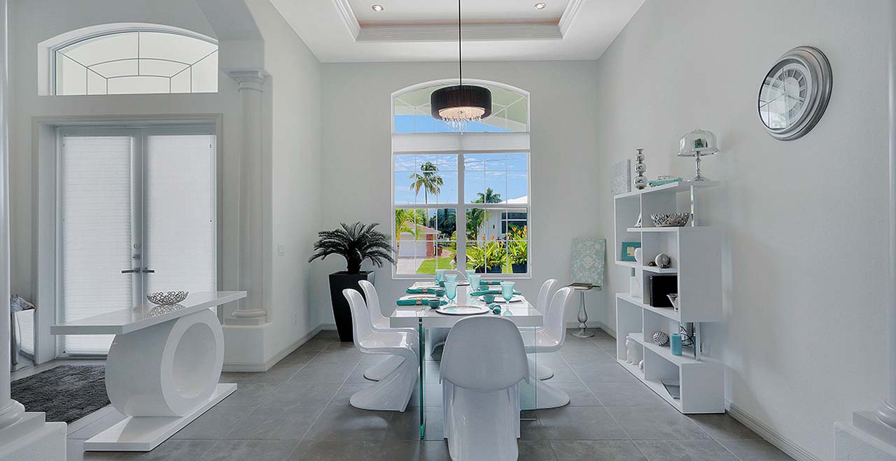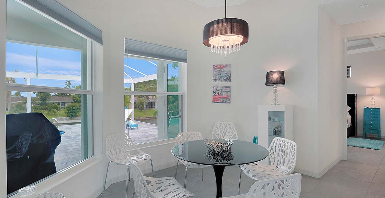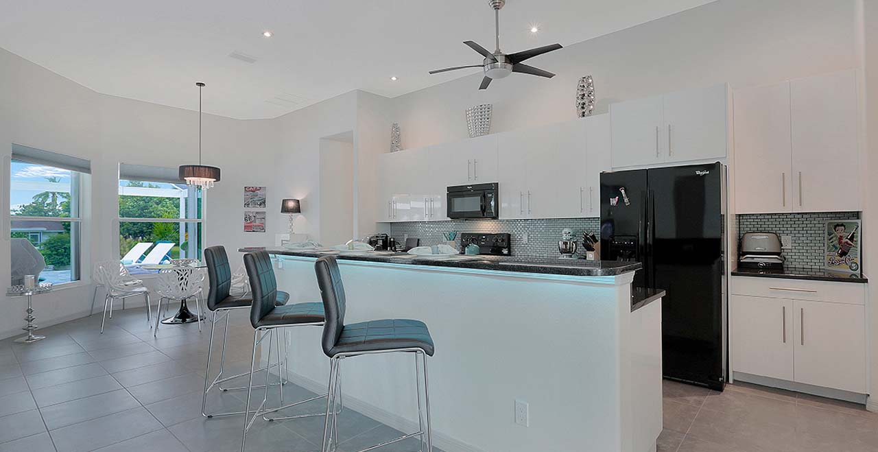 Villa Surf in Cape Coral is a beautiful and new spacious 3 bedroom home is located in the yacht club area only minutes away from the river. It has east exposure and you will have sun all day long on the pool. The home is very well equipped for all your vacation needs. The open American kitchen has granite counters, bar stools and a separate breakfast nook. Kitchen is loaded with high end products as Kitchen Aid and Nespresso. Dining table seats 6 persons. All 3 bedrooms (2 kings, 1 queen) are provided with TV and DVD player and have adjoining bathrooms. The master bath has a walking shower and a tub.