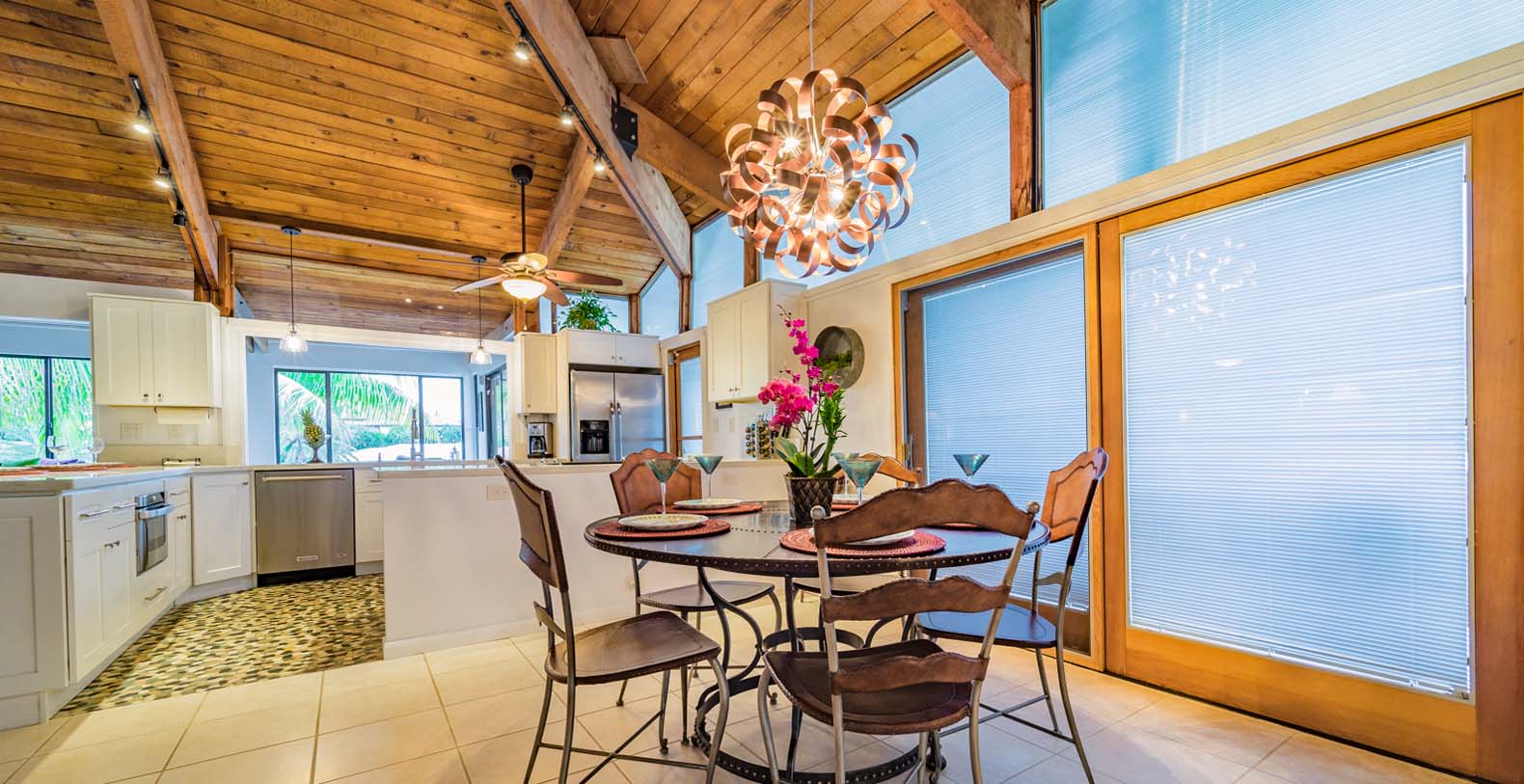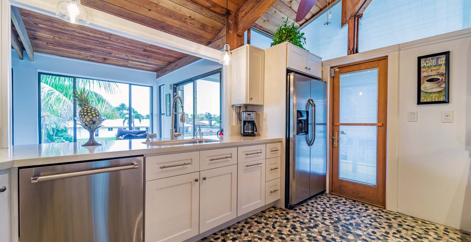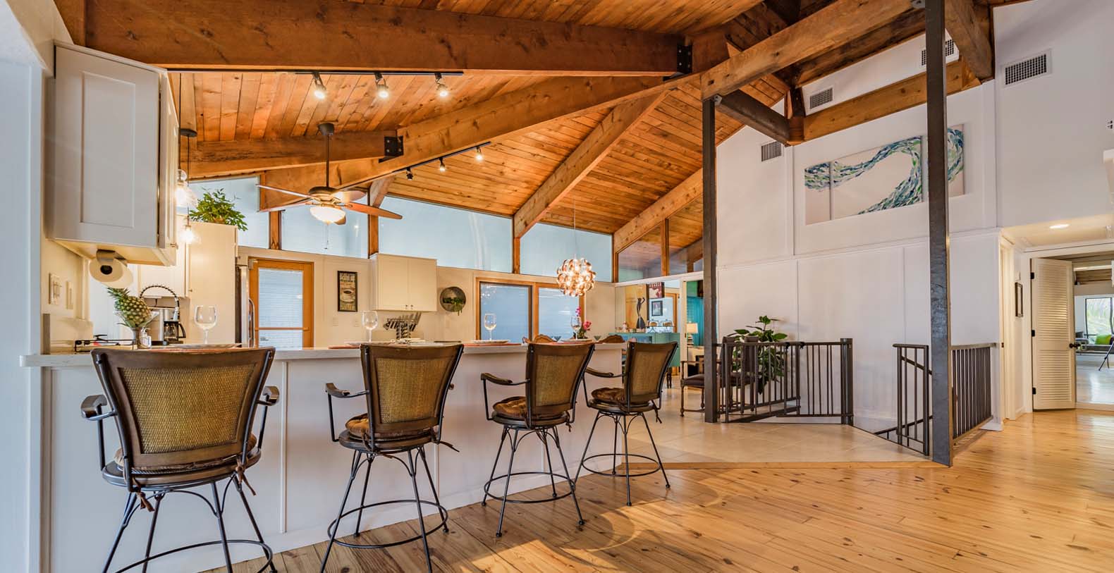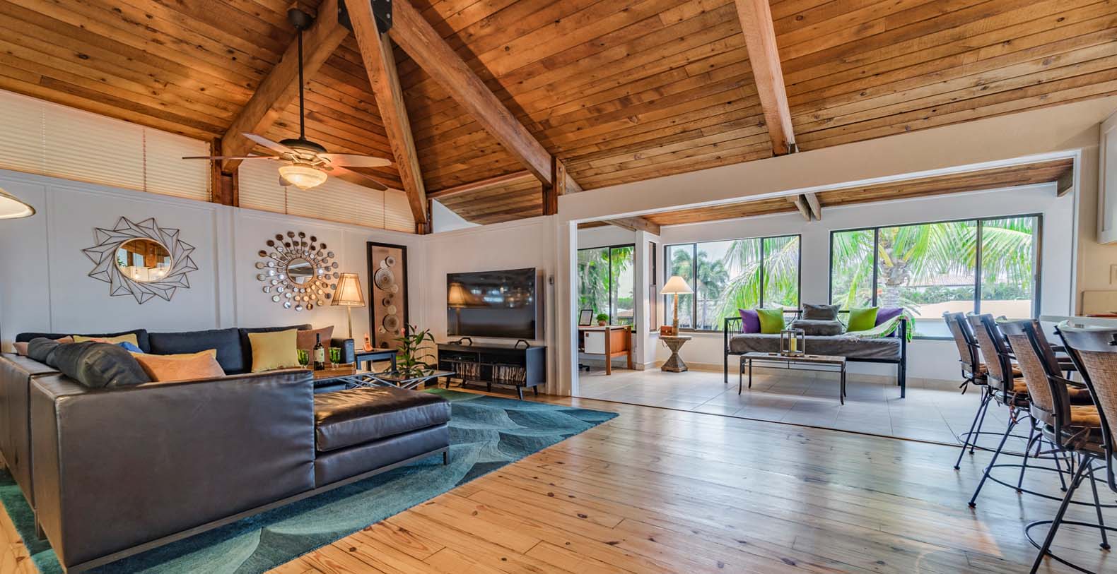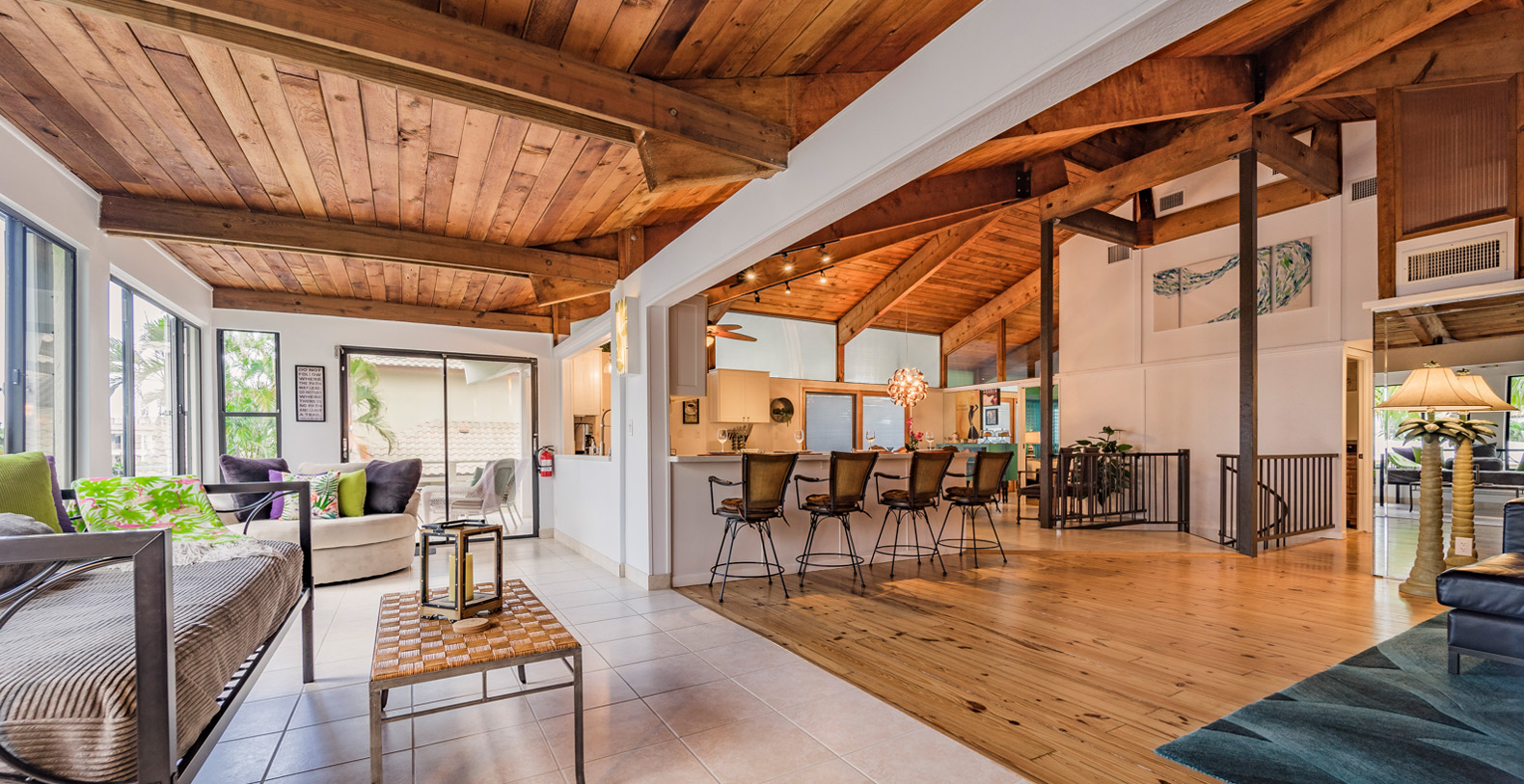 Nautical Dream is a two-level 2,900 sq. ft. house with an internal spiral staircase and dramatic 15 ft. open beam ceilings. Upstairs is a master suite and bathroom, two additional bedrooms that share a bathroom, a new open-space kitchen, dining area, living room with a state-of-the-art 4k 65” curved TV, and Florida room (with a desk and day bed). There is also an outside upper deck. This combination provides a great upstairs area for entertaining and watching the boating action on the Intracoastal.