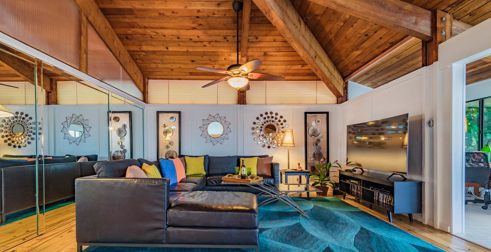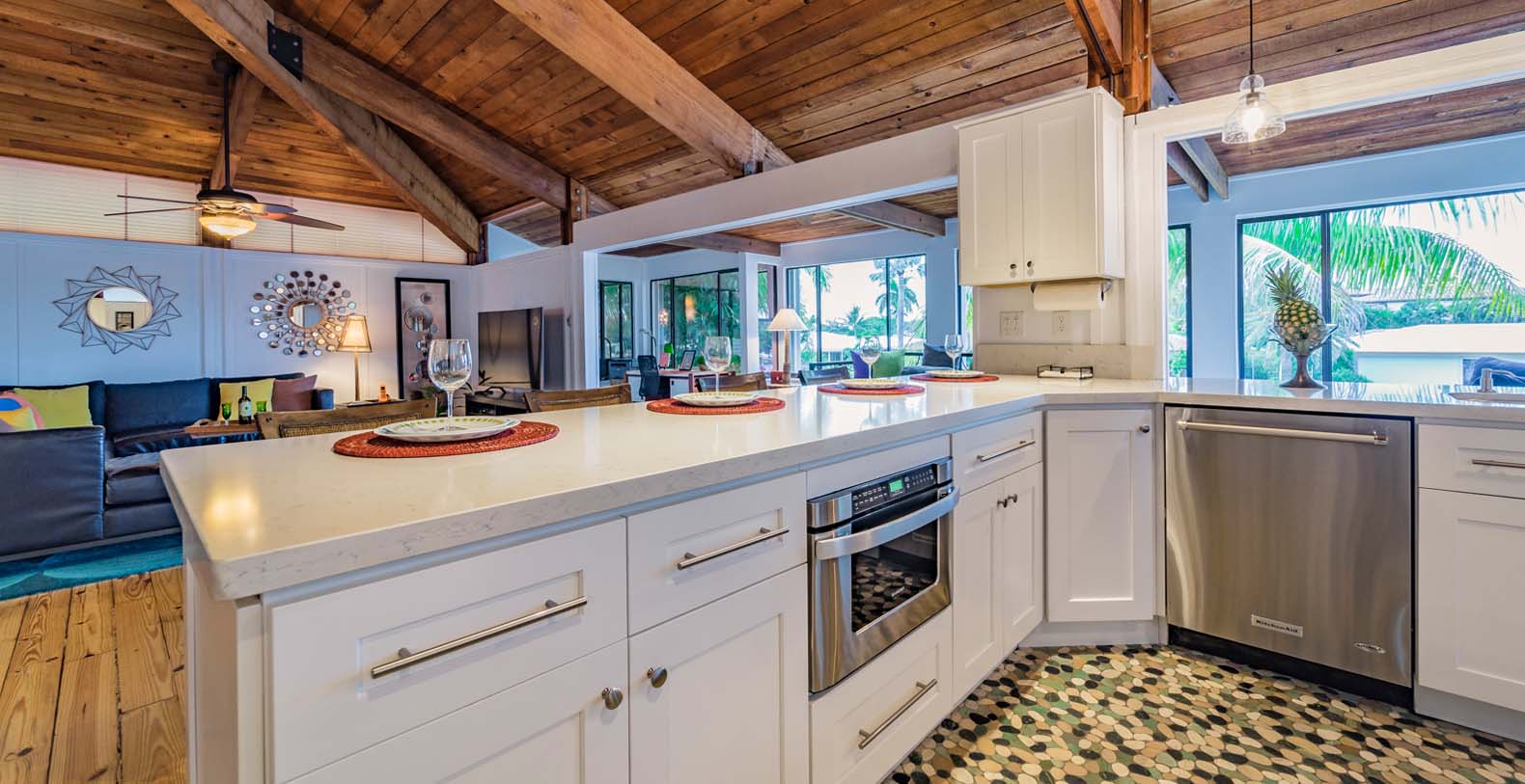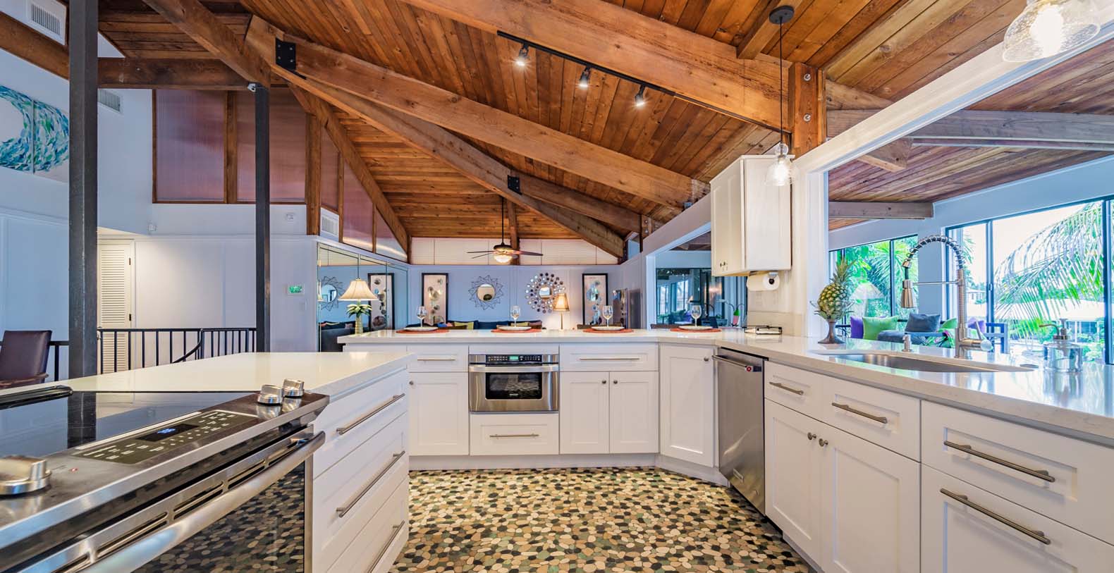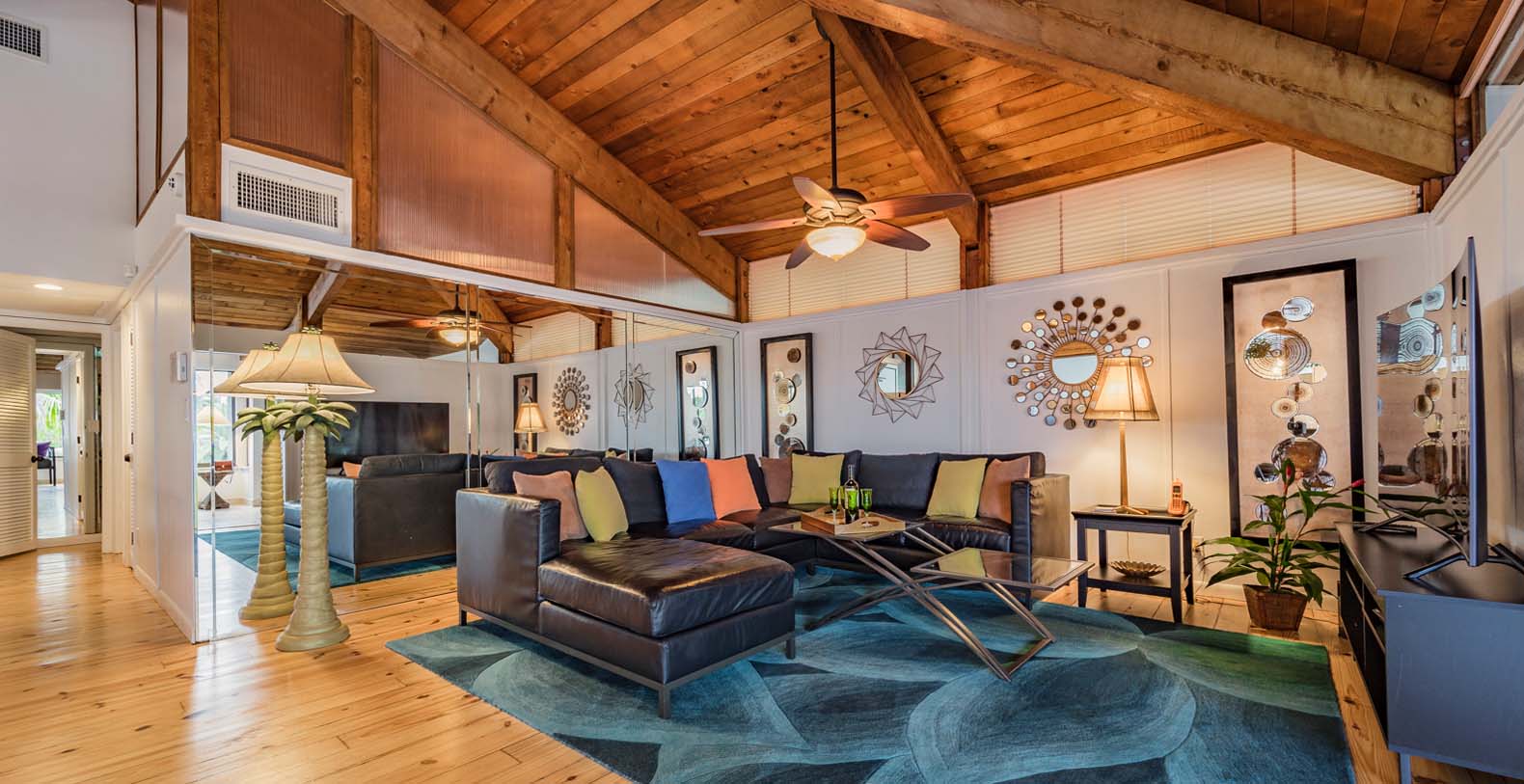 Nautical Dream is a two-level 2,900 sq. ft. house with an internal spiral staircase and dramatic 15 ft. open beam ceilings. Upstairs is a master suite and bathroom, two additional bedrooms that share a bathroom, a new open-space kitchen, dining area, living room with a state-of-the-art 4k 65” curved TV, and Florida room (with a desk and day bed). There is also an outside upper deck. This combination provides a great upstairs area for entertaining and watching the boating action on the Intracoastal.
