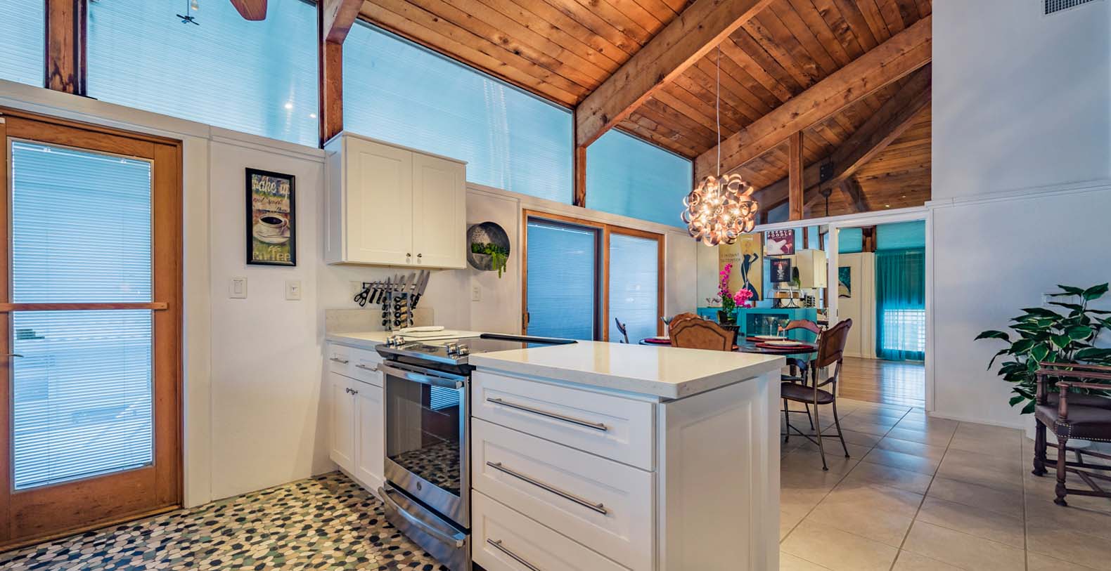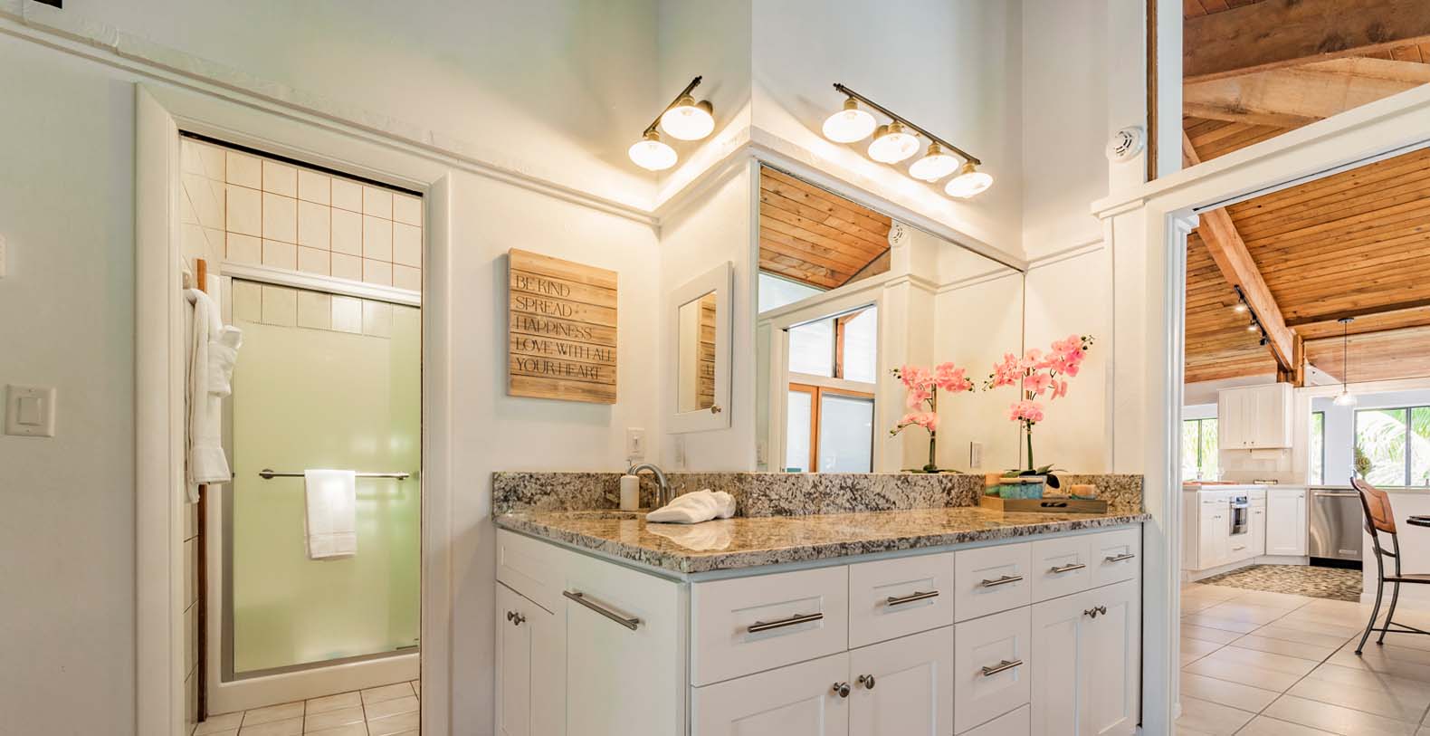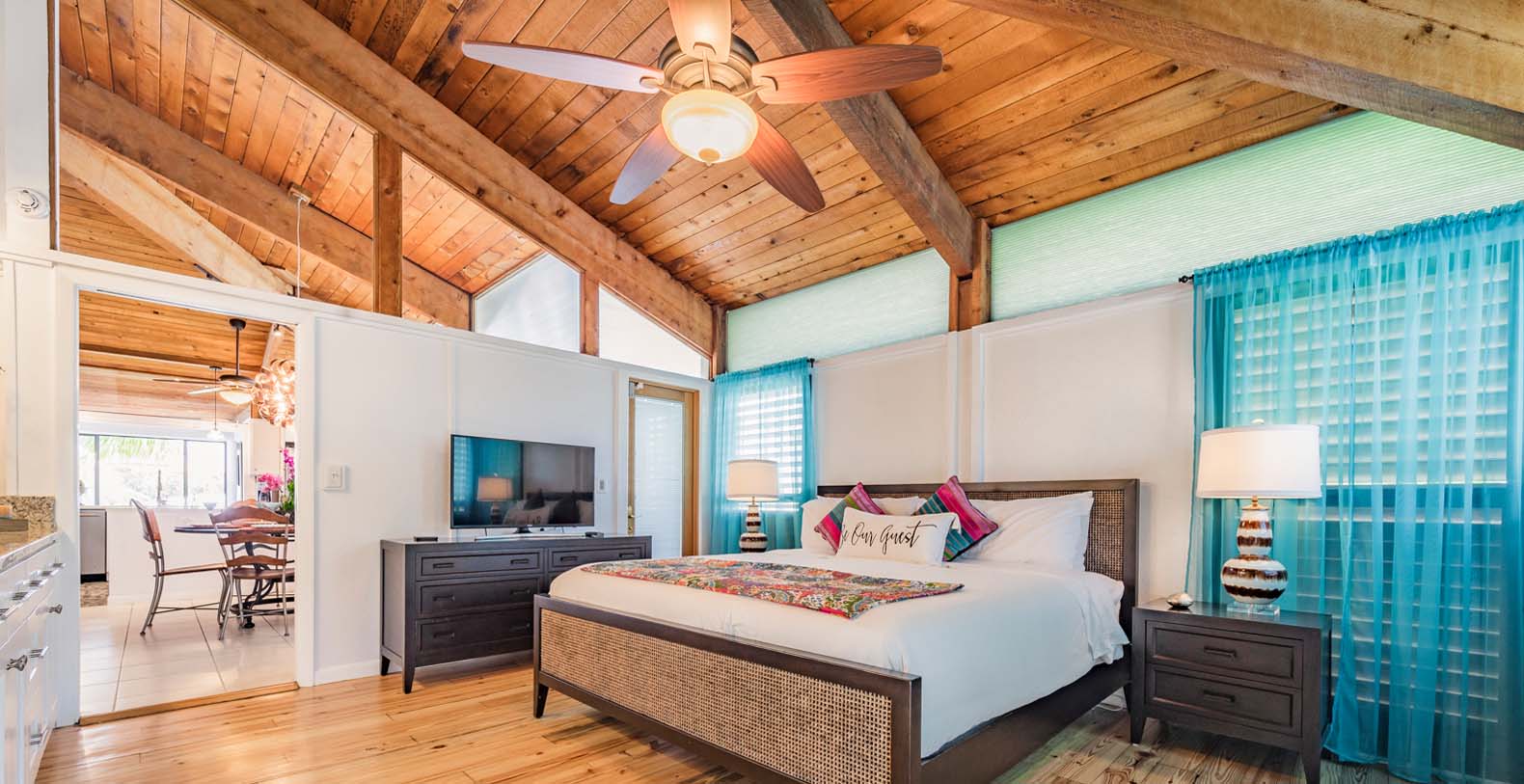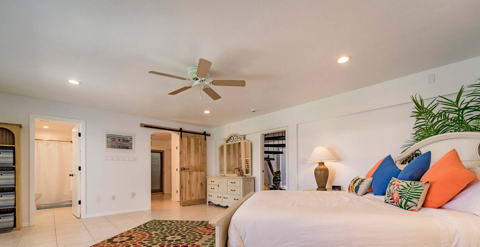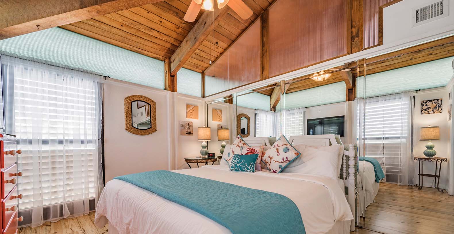 Nautical Dream is a two-level 2,900 sq. ft. house with an internal spiral staircase and dramatic 15 ft. open beam ceilings. Upstairs is a master suite and bathroom, two additional bedrooms that share a bathroom, a new open-space kitchen, dining area, living room with a state-of-the-art 4k 65” curved TV, and Florida room (with a desk and day bed). There is also an outside upper deck. This combination provides a great upstairs area for entertaining and watching the boating action on the Intracoastal.