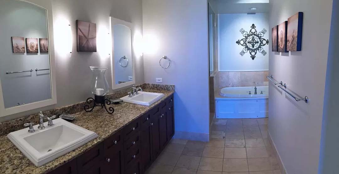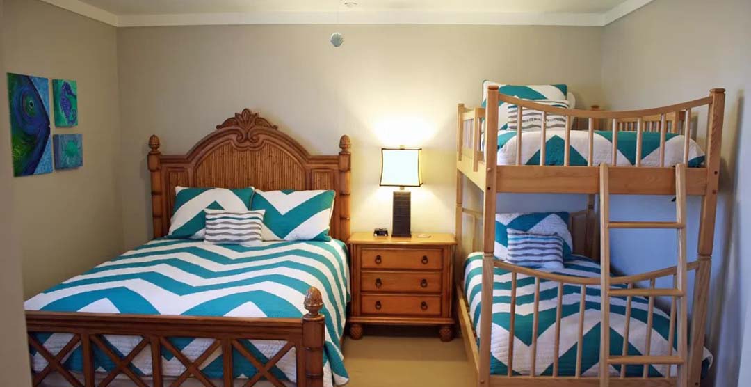 Luxuriate in the grand master bedroom suite with its large king bed, sitting area and adjoining private bath with a Jacuzzi plus a large, marble-and-glass enclosed walk-in shower. Awake to views of the emerald green waters or go out on the porch accessible from your bedroom. The second master, also with a King Bed bed, features a temperpedic-style foam mattress for your sleeping comfort. The bedroom also features a private marble bathroom also offers incredible gulf views and access to the gulf front porch. A third bedroom suite features a queen bed, and a twin bunk bed, to sleep 4 guests comfortably. The third bedroom also features a private marble bathroom.