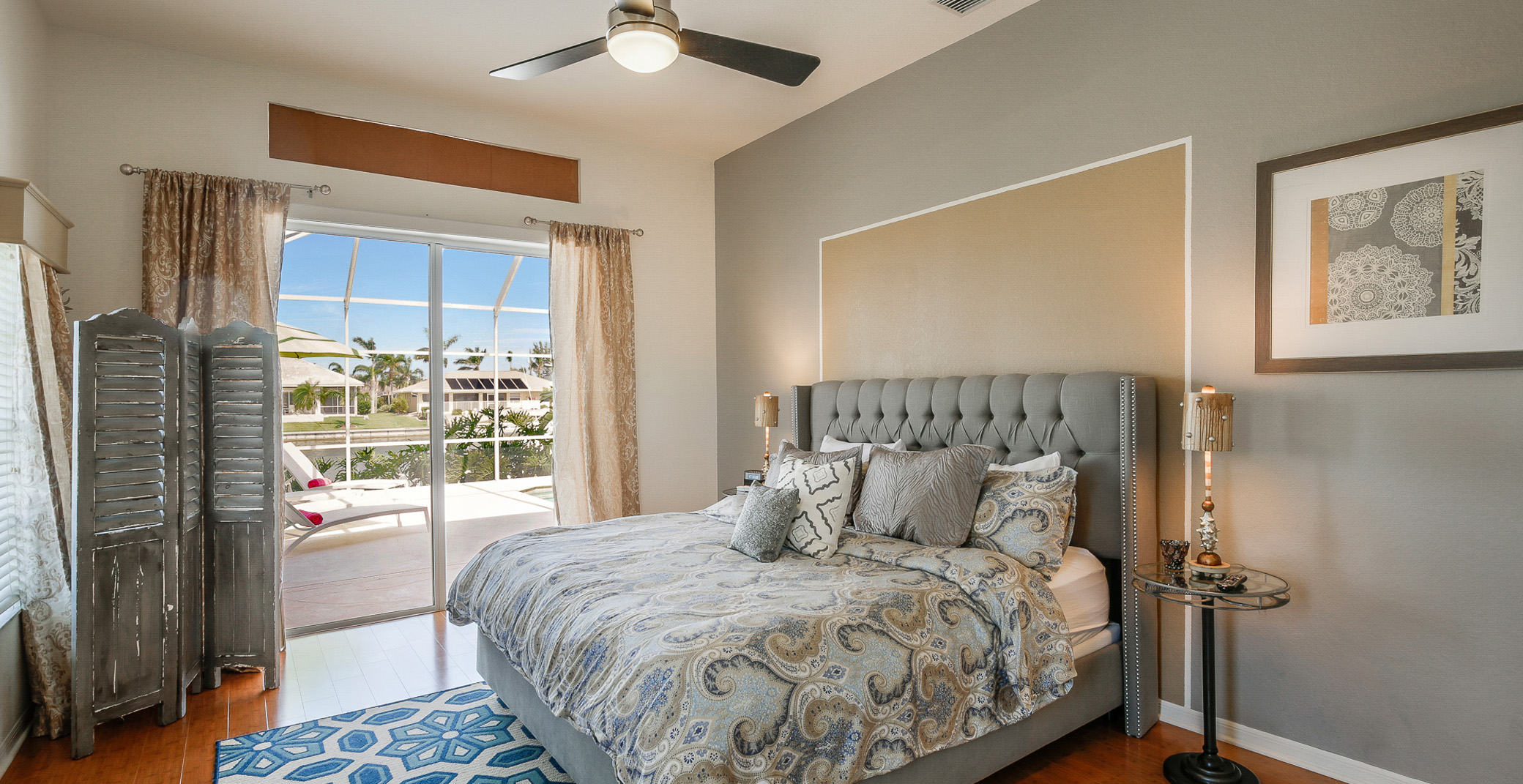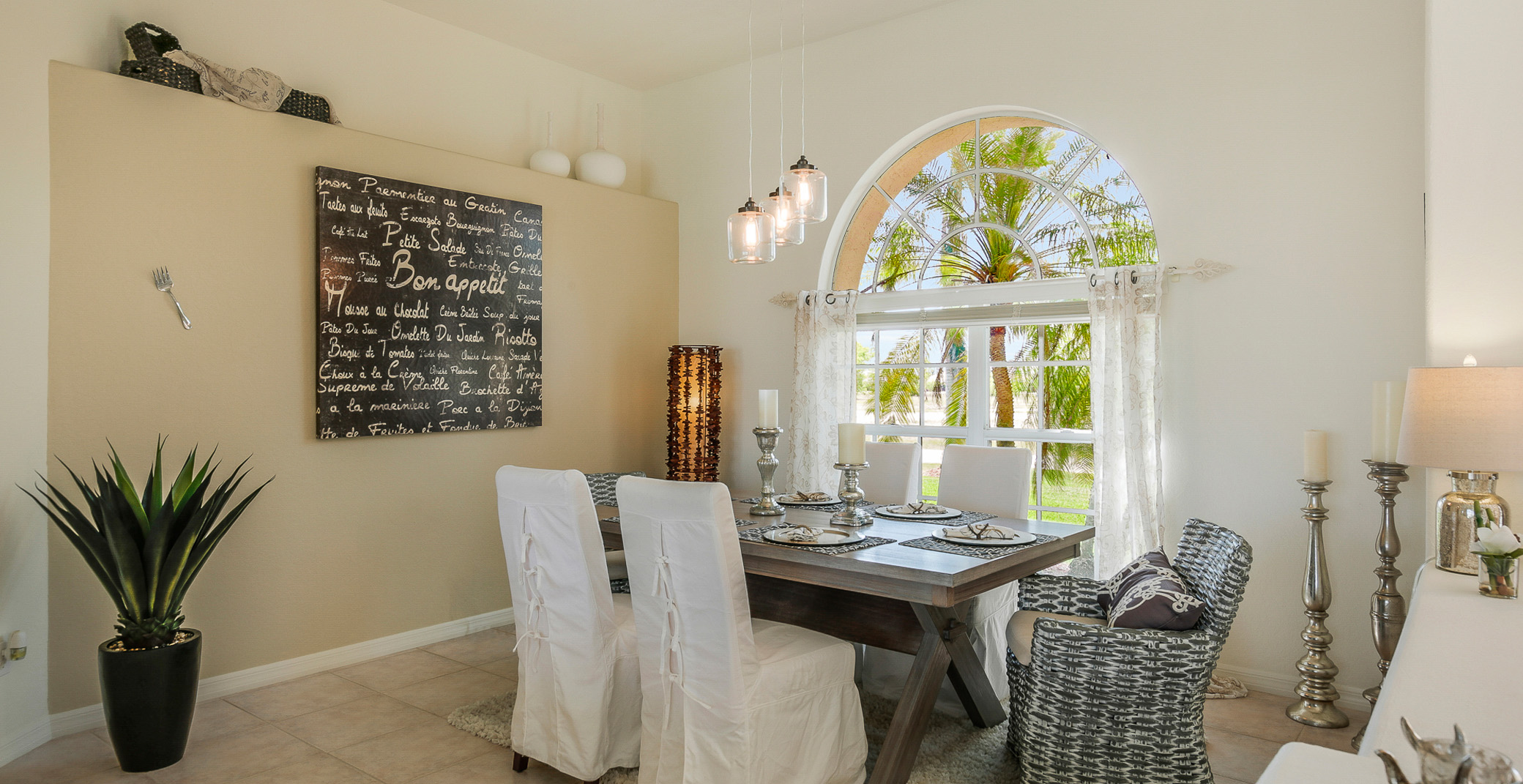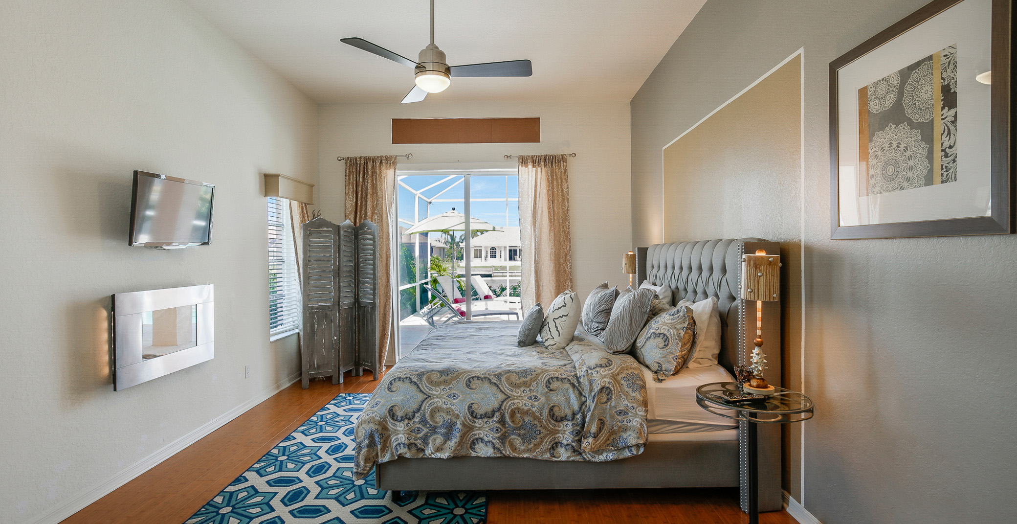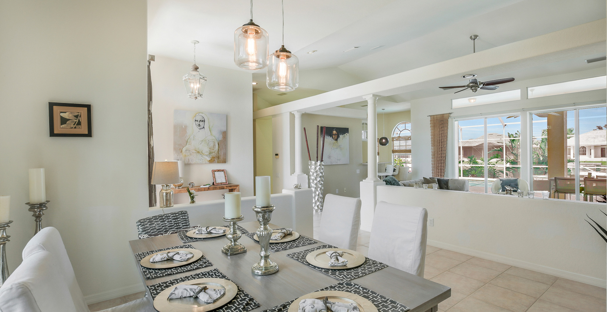 Villa Camila is located in the SW Cape Coral waterfront neighborhood in a quiet and established street with east exposure. The villa has 3 bedrooms (1 king, 2 queens) and 2.5 bathrooms (outdoor shower). All bedrooms have TVs. The kitchen is fully equipped. From the breakfast nook you have a great view onto the pool and the canal. The dining table seats a party of 6.