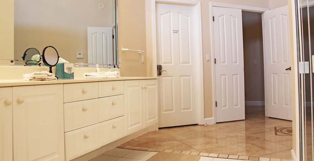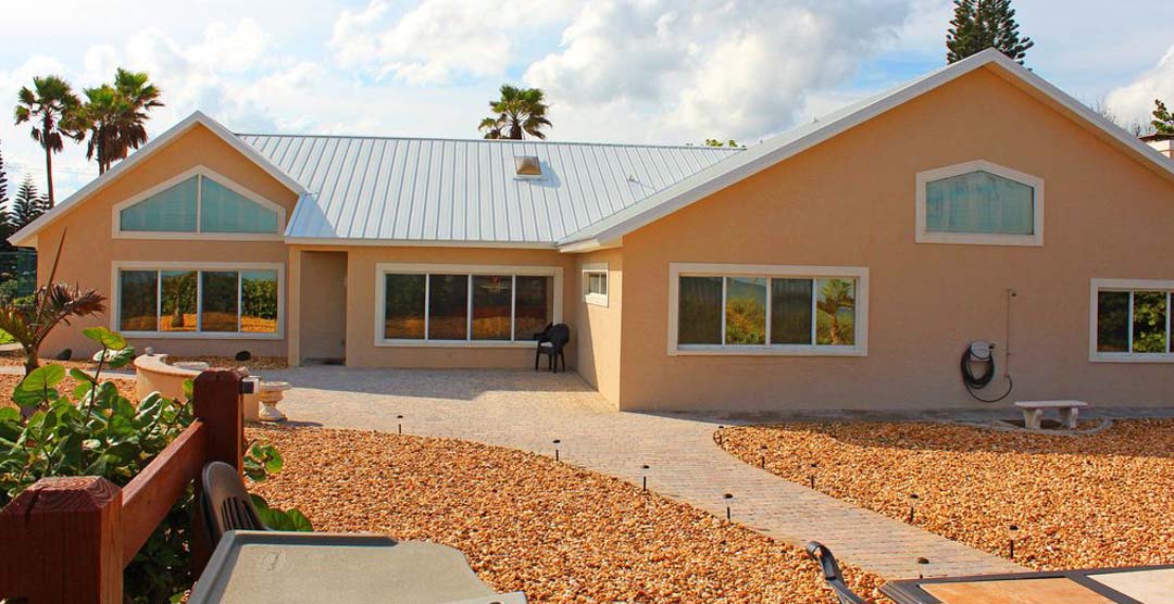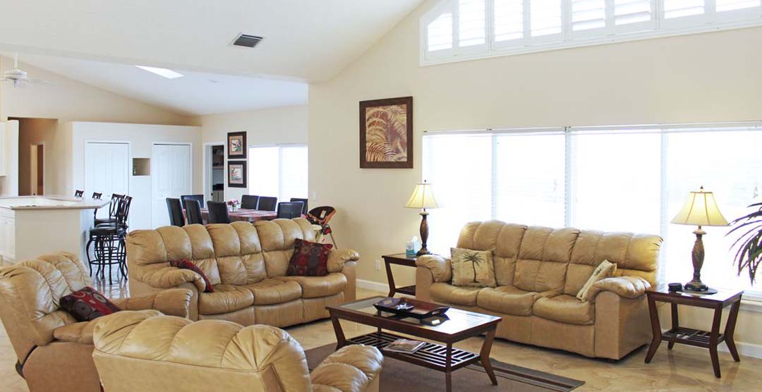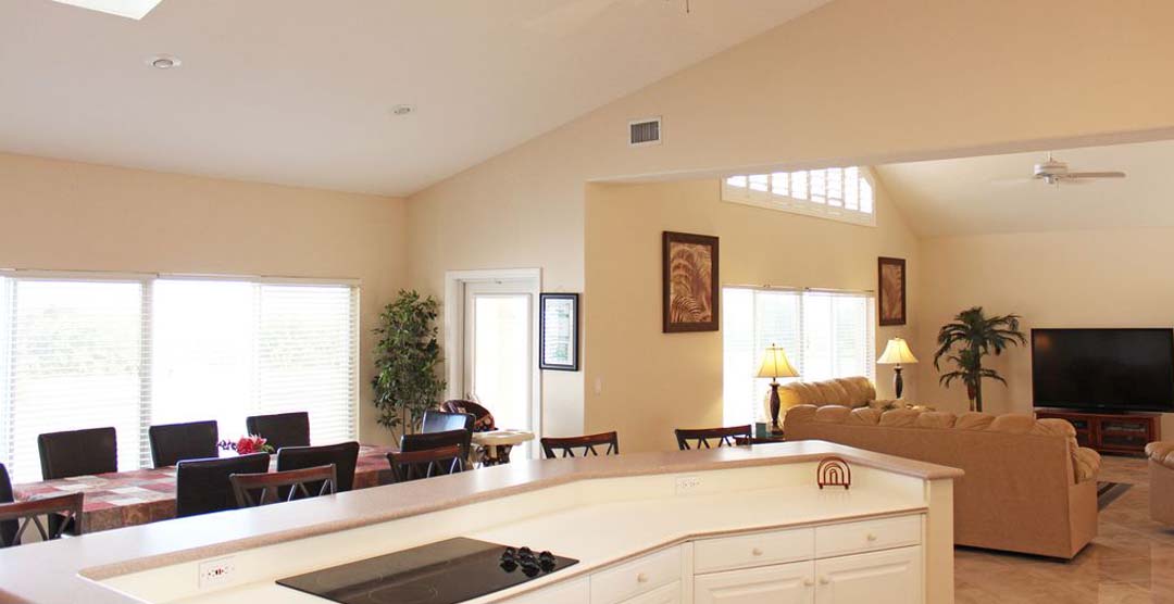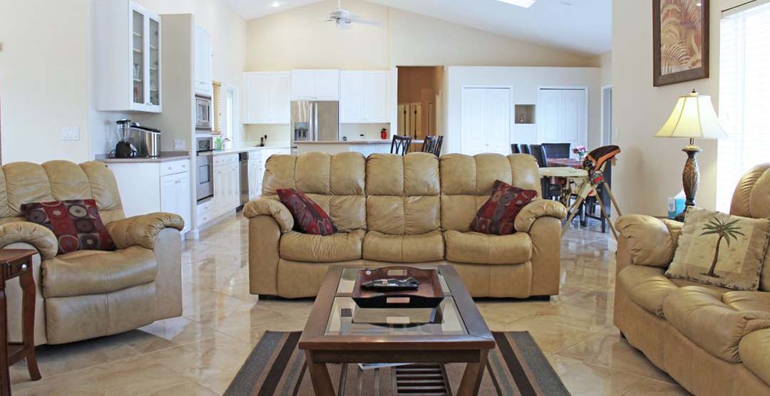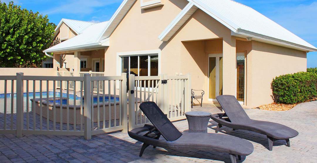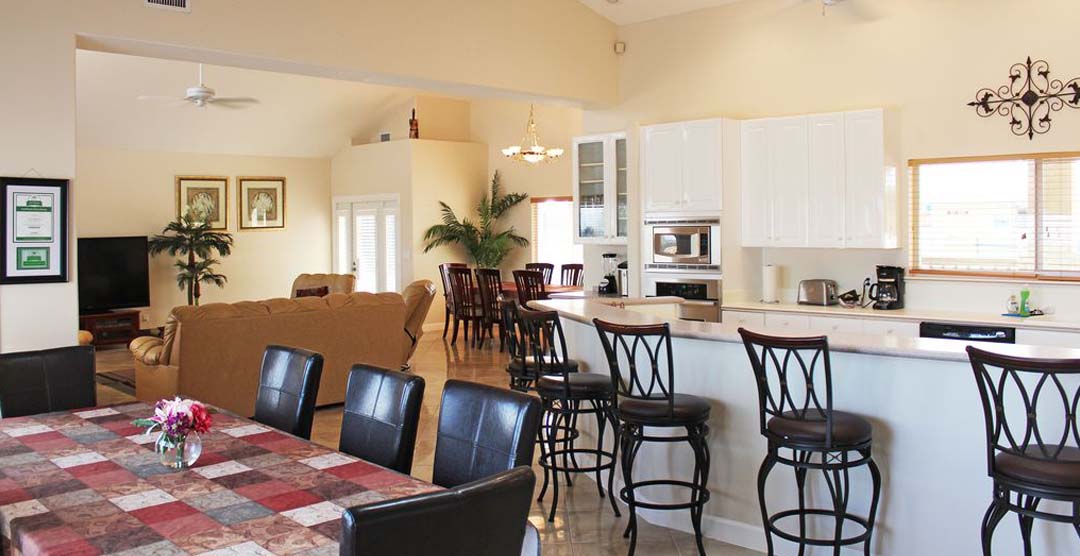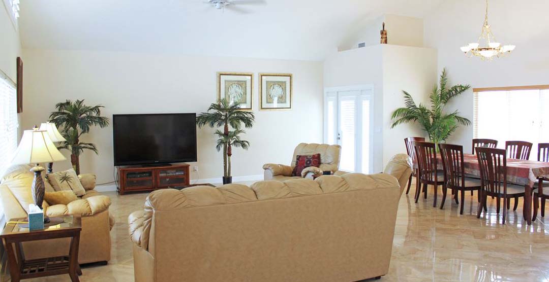 The Beach Dreams boasts 3,200 ft² of living space and sleeps 14 guests total with 1 king-sized bed, 4 queen-sized beds, and 2 queen-sized pull-out sofa beds in the great room. The estate consists of a 4 bedroom, 2.5 bathroom main house, and a 1 bedroom, 1 bathroom guest house. With its professionally landscaped tropical inspired grounds, equipped with a 2-car garage and paved driveway, and parking with enough space for 2 RVs or boats.