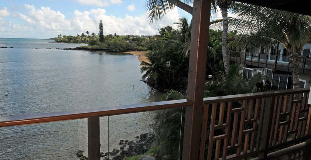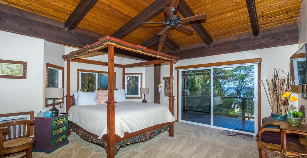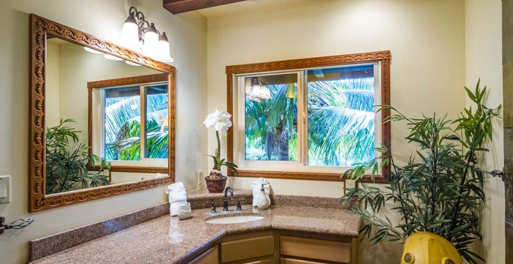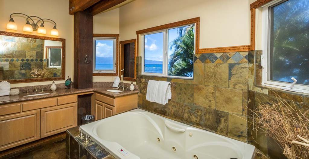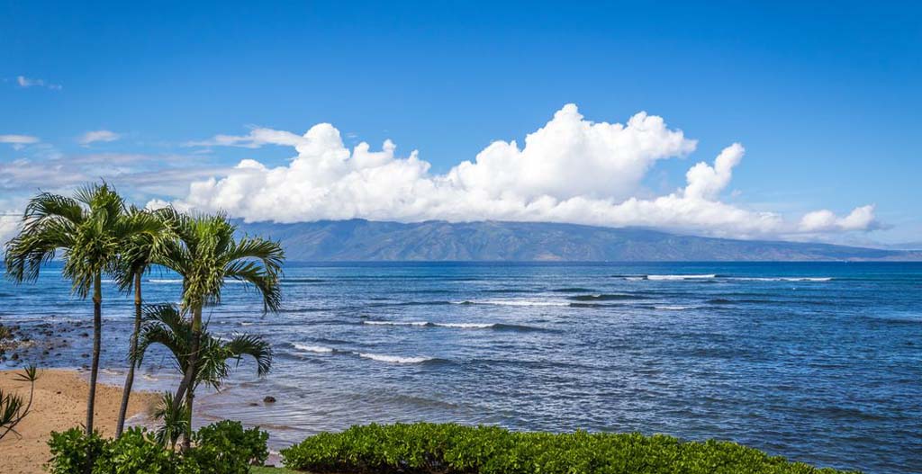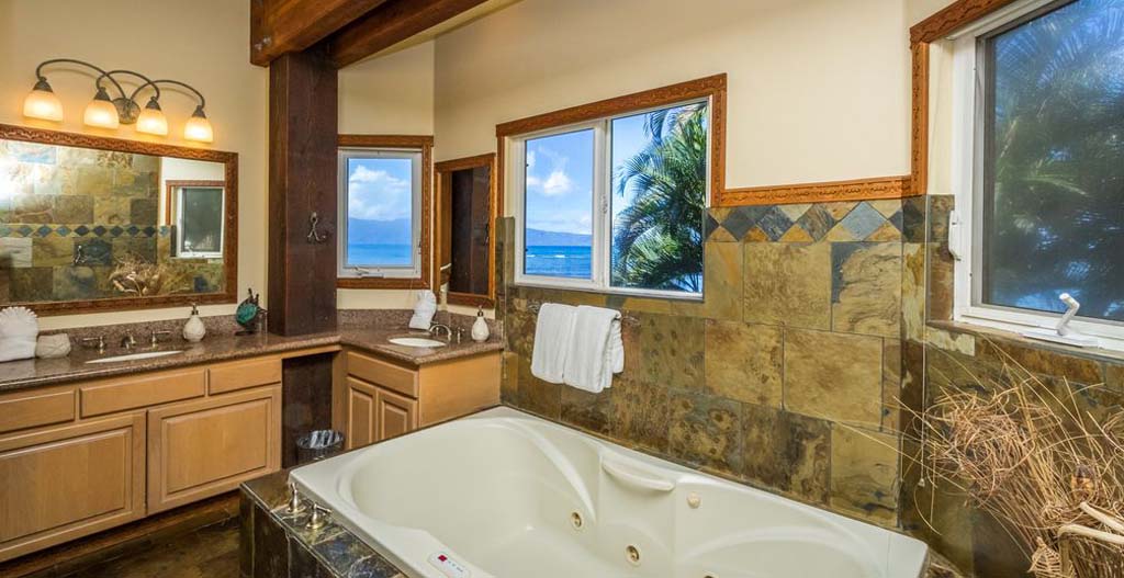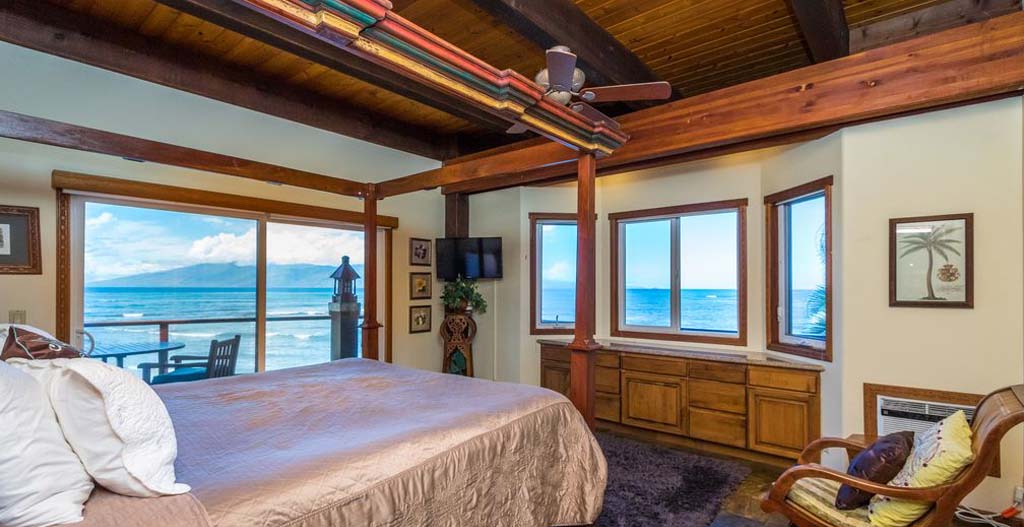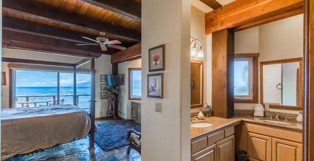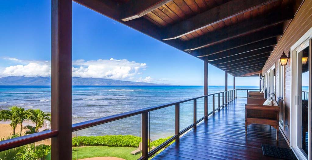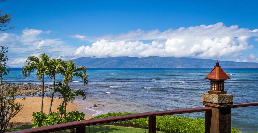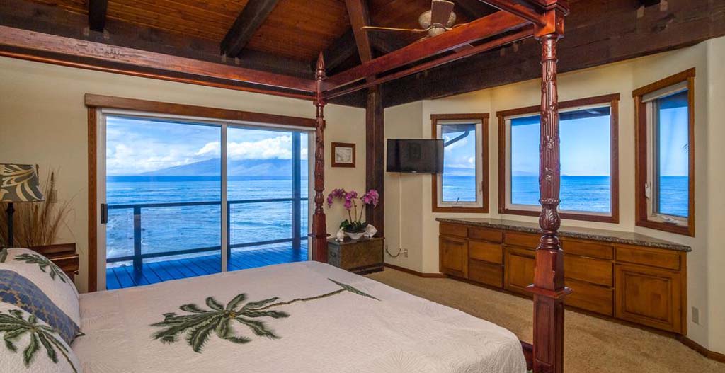 Looking toward the ocean the views from the front of Shambala Dreams stretch from the south shore of the island of Lana'i to Mokuniki just off shore of the north east edge of Moloka'i. These views are not just from the tranquil yard, but even from two stories of glass lined lanais not to mention from the comfort of the king size beds in four of the oceanfront master suites facing west inside the home.