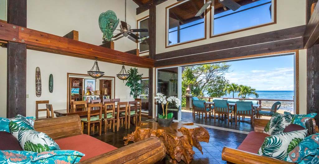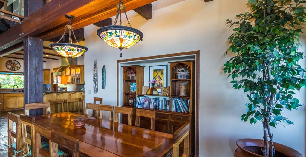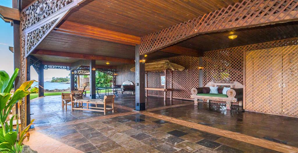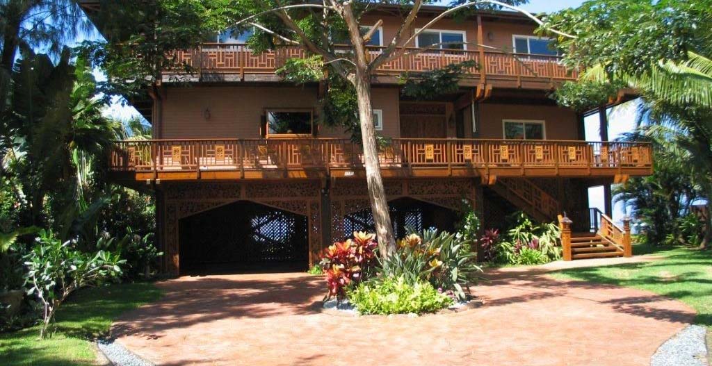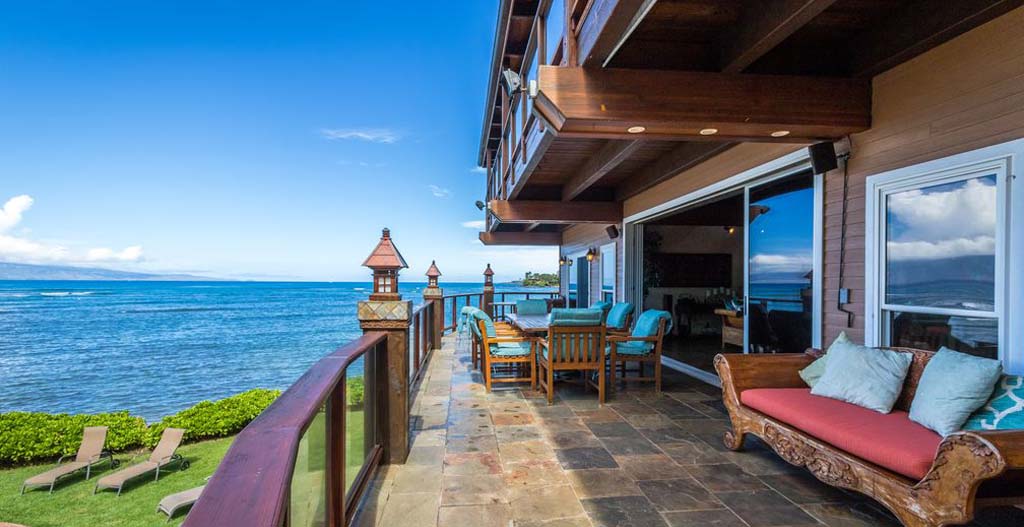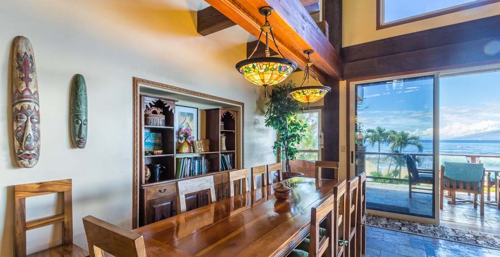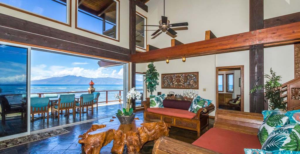 The house itself is centered in the middle of the estate on large poles rising up towards the clouds. As you ascend the stairs and enter you are surrounded with unique architecture adorned in grand details commissioned by Indonesian artisans. Referred to by the locals as "The Bali House", Shambala Dreams is a six bedroom, four and a half bath luxury oceanfront home on the beach in Kahana conveniently positioned between historical Lahaina Town and the exclusive resort area of Kapalua on the west shore of Maui. The open-air and open-floor house was specifically designed to take advantage of the gentle trade wind breezes. The front of the house features a massive retractable floor-to-ceiling glass wall that easily slides away to create a refined indoor/outdoor oceanfront living and dining experience. On the rare occasions when the tradewinds ebb, each bedroom is equipped with their own individual air conditioning units.
