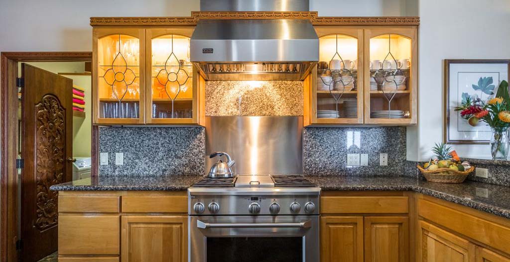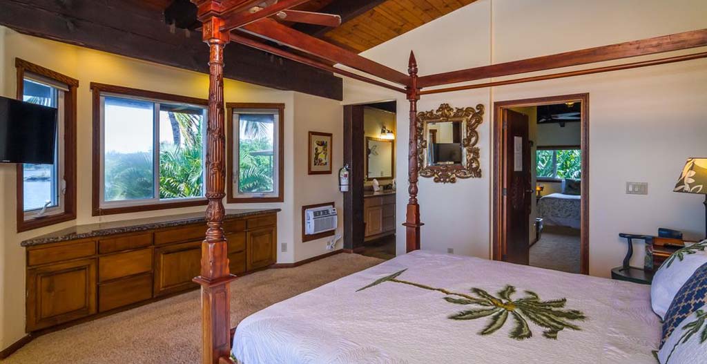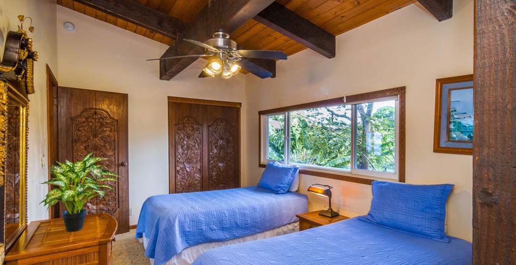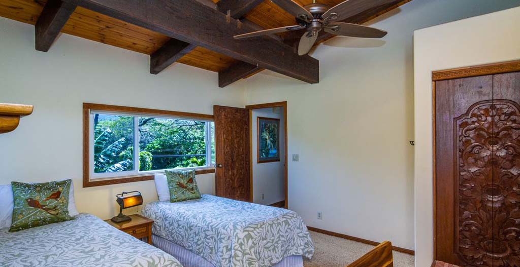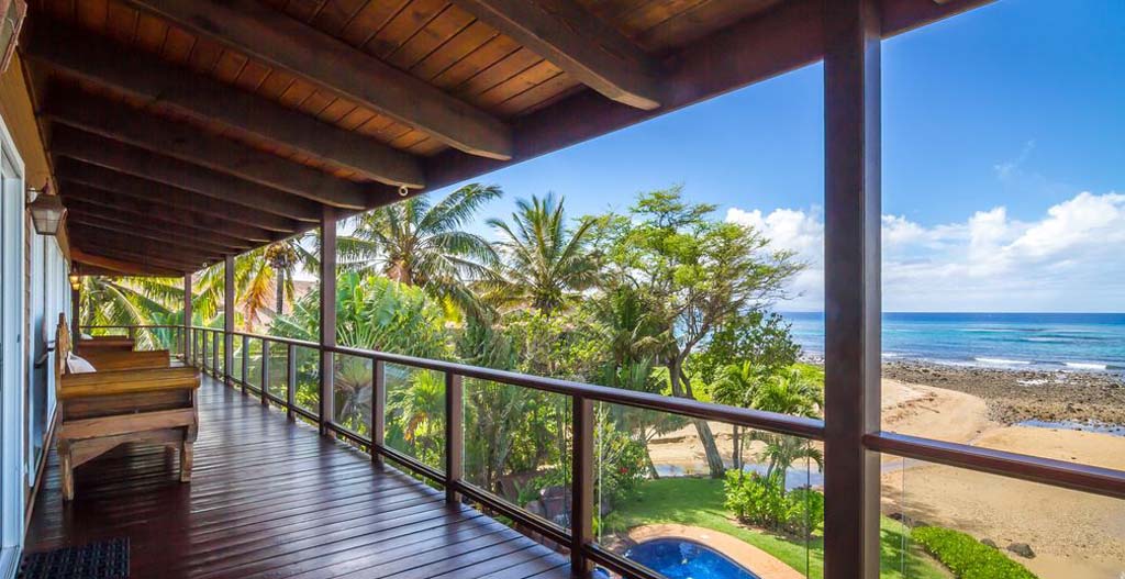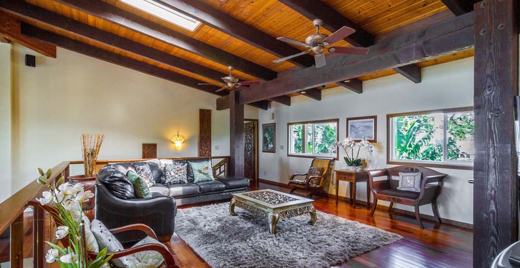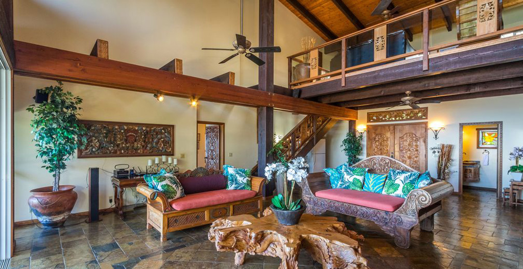 The house itself is centered in the middle of the estate on large poles rising up towards the clouds. As you ascend the stairs and enter you are surrounded with unique architecture adorned in grand details commissioned by Indonesian artisans. Referred to by the locals as "The Bali House", Shambala Dreams is a six bedroom, four and a half bath luxury oceanfront home on the beach in Kahana conveniently positioned between historical Lahaina Town and the exclusive resort area of Kapalua on the west shore of Maui. The open-air and open-floor house was specifically designed to take advantage of the gentle trade wind breezes. The front of the house features a massive retractable floor-to-ceiling glass wall that easily slides away to create a refined indoor/outdoor oceanfront living and dining experience. On the rare occasions when the tradewinds ebb, each bedroom is equipped with their own individual air conditioning units.
