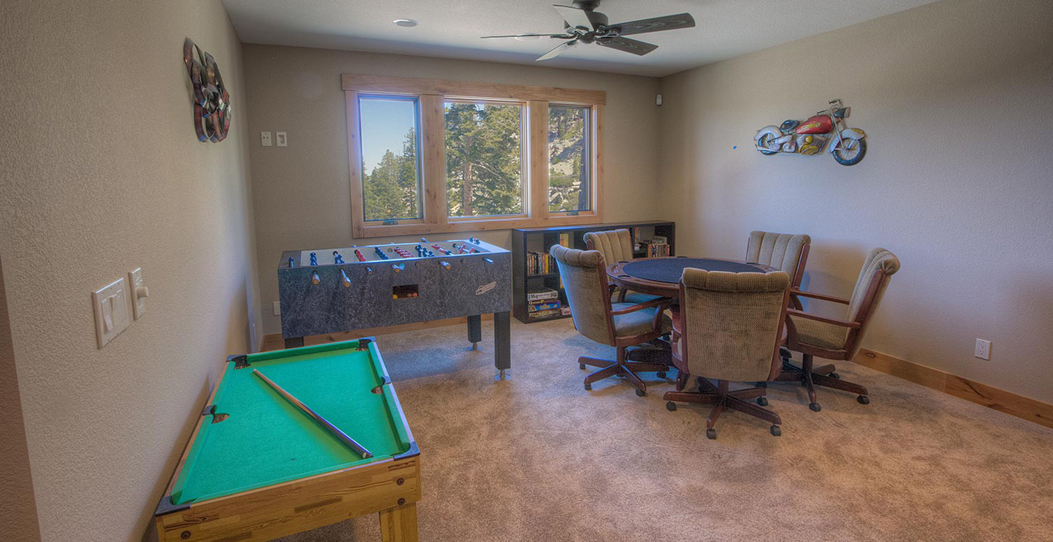 There are 5 bedrooms, 4 bathrooms, plus 2 half bathrooms, a 60" flat screen with wonderful stereo sound, a game room with poker table, foosball, and mini pool table, and skiing just outside! Literally ride to the front door from Heavenly or step out the front door to find the slopes immediately in front of you!
