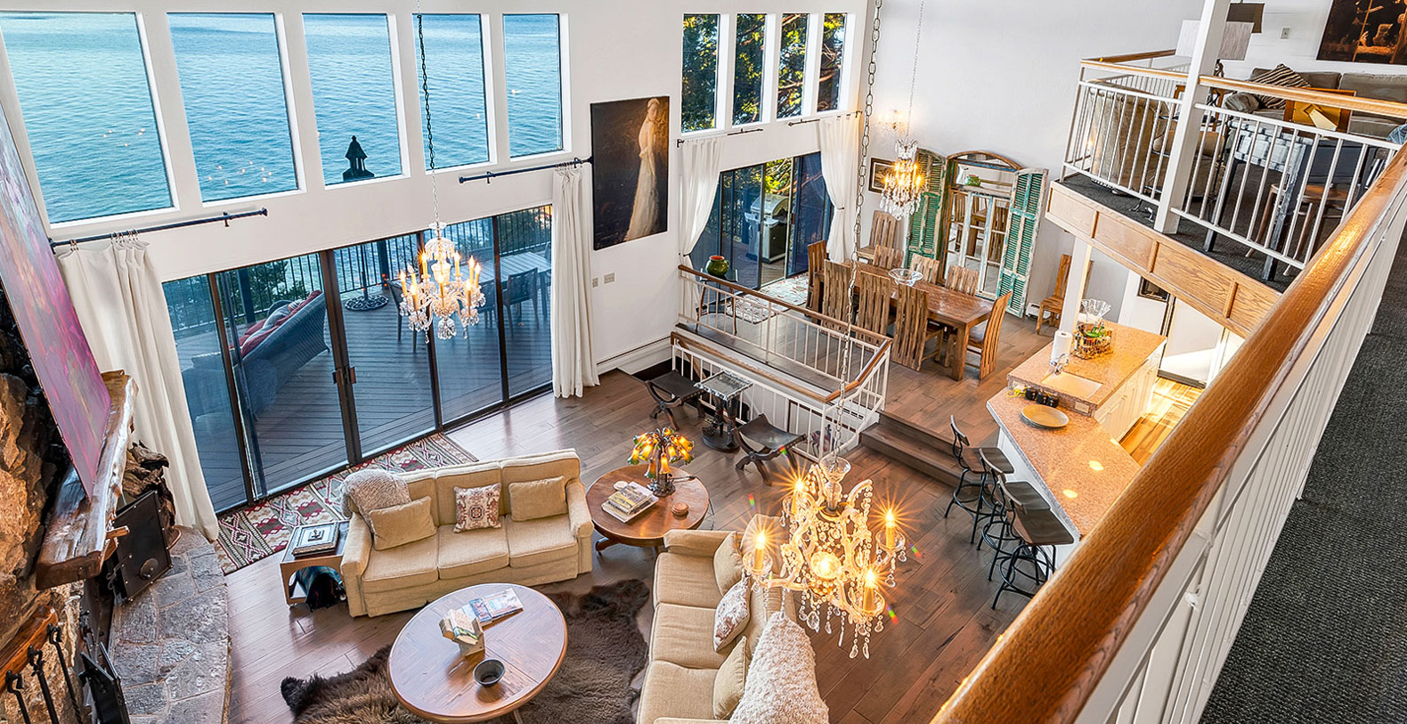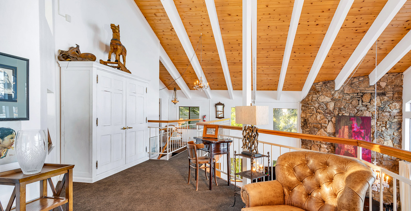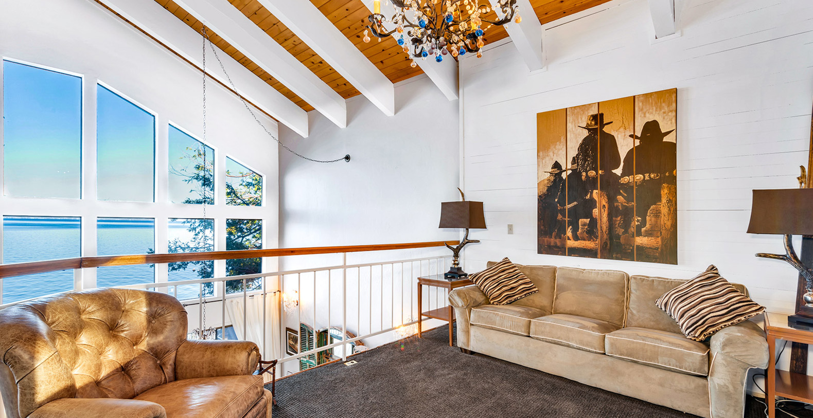 The loft is directly above and behind the main hall and has lake views on par with the main hall. Queen sleeper sofa comfortable seating and relaxing, unique furnishings, decorations and art.