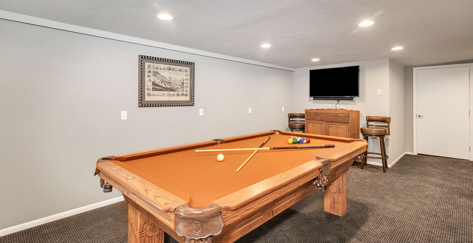 The rec room is accessed off the inside of the garage, for just a short time longer. Truly a man cave with a view, a pool table and large screen tv and stools.