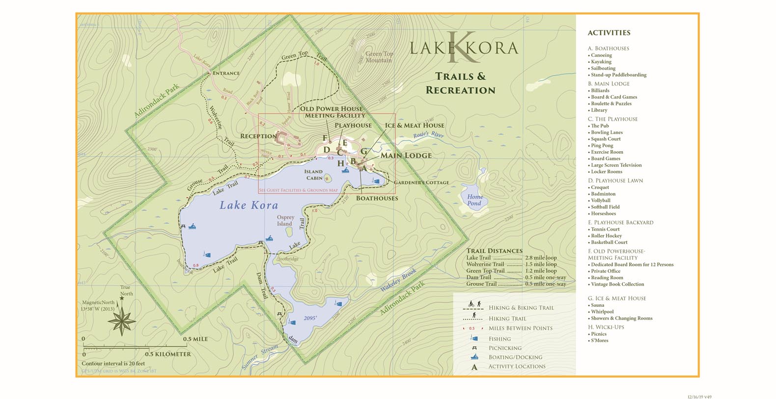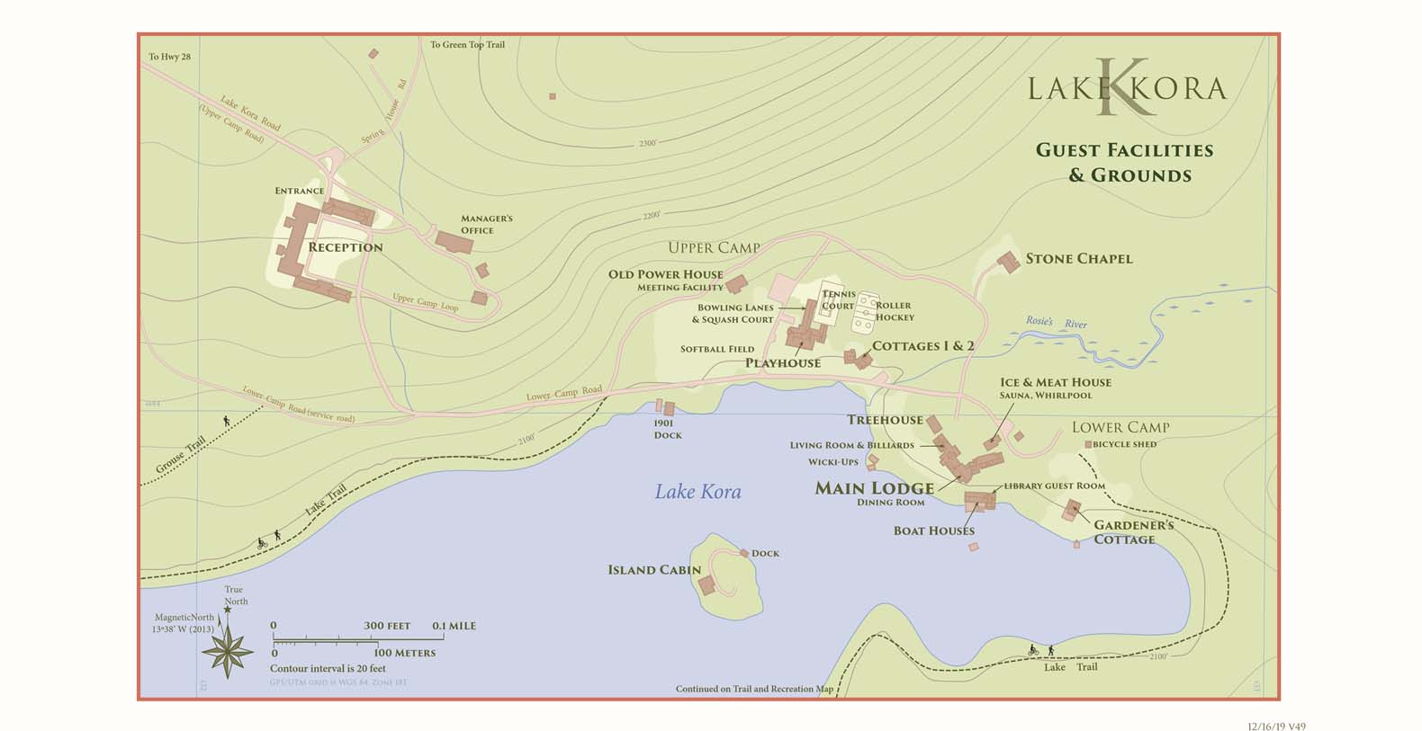 Lake Kora was built in 1898 as Kamp Kill Kare, a magnificent log-and-stone compound on a vast forest preserve, with its own 500-acre lake. It was an exclusive retreat, but soon the site of many grand affairs. Yale and Harvard teams practiced on the softball diamond and the eminent families of the Gilded Age came to dance on the Boathouse docks. No expense was spared on luxury and mountain charm: birch bark writing paper, a Venetian gondola, a floating lantern-lit bridge, and even a dancing black bear. The camp’s heritage bowling alley, tennis and squash courts, vintage board games, billiard, outdoor roller rink, lake activities (swimming, canoeing, kayaking, sailing, paddle boarding, motor boating, electric boating, & fishing), boats and balsam trails are only the beginning. Still in private hands today, the camp has remained astonishingly intact for more than a century.