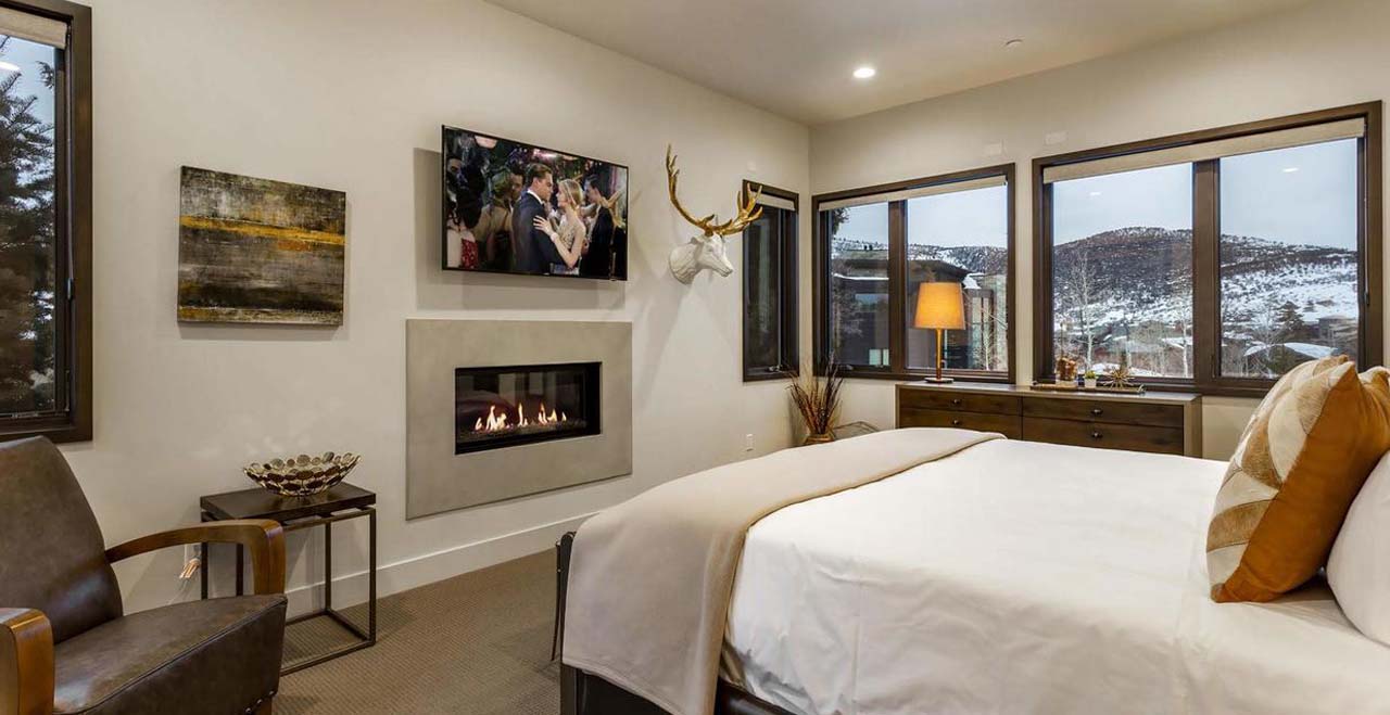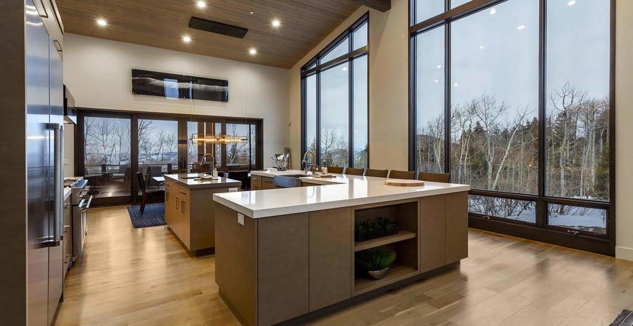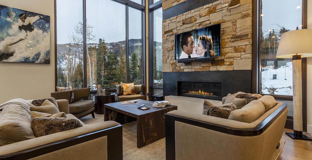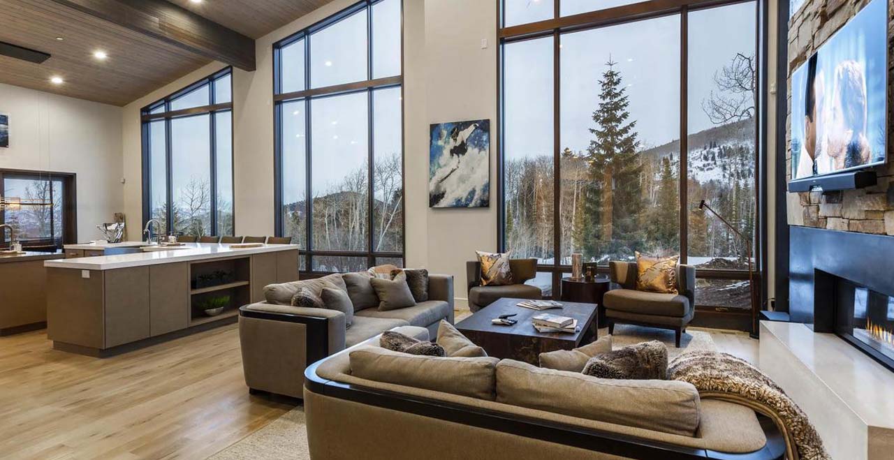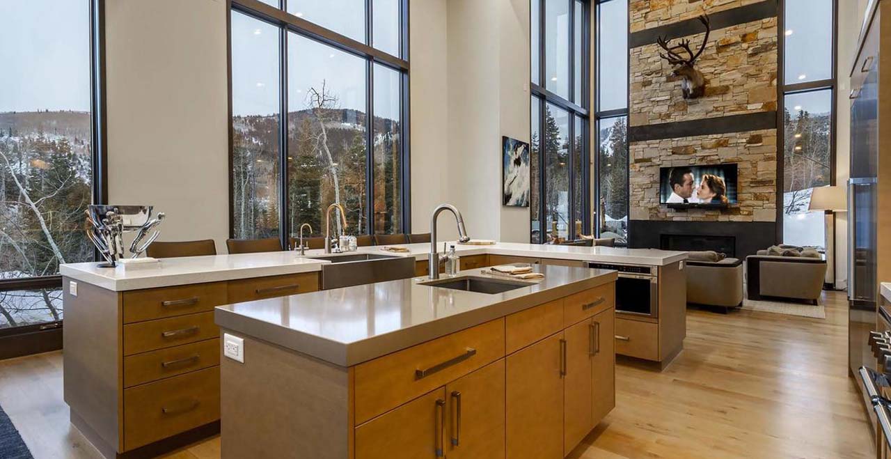 Modern, geometric design produces spacious quarters and living areas. With walls of custom glass surrounding the entire mid-level, the views and atmosphere won't disappoint. The main living area has high ceilings, a stone wall fireplace, an oversized kitchen and floating island equipped with Thermador appliances, boasting modern spacious living. Offering six bedrooms, six bathrooms, and two powder rooms, each bedroom has an attached ensuite and can easily sleep up to 18 people.