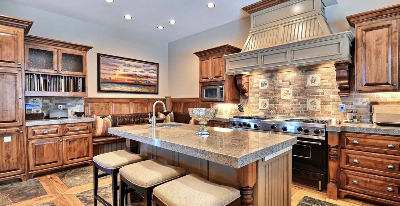 Stone walls with arched walkways separate the great room from the gourmet kitchen and dining area. Seat up to eight guests at the formal dining table, and up to eight more between three stools at the breakfast bar and a roomy “brunch nook” in the kitchen.