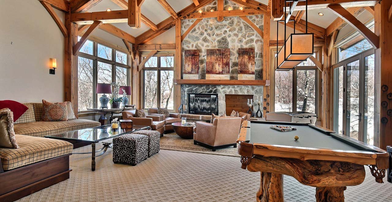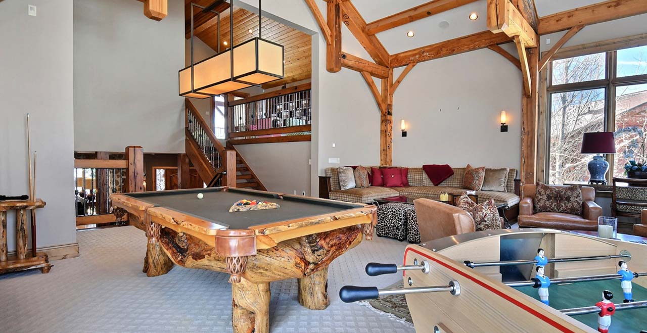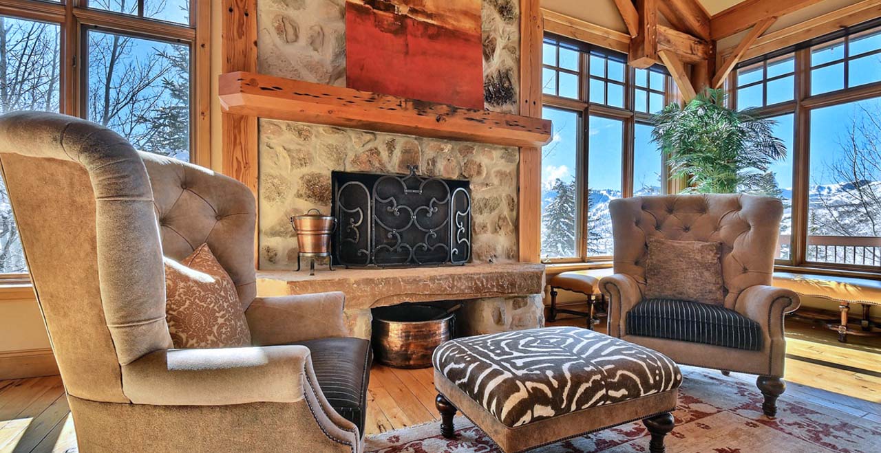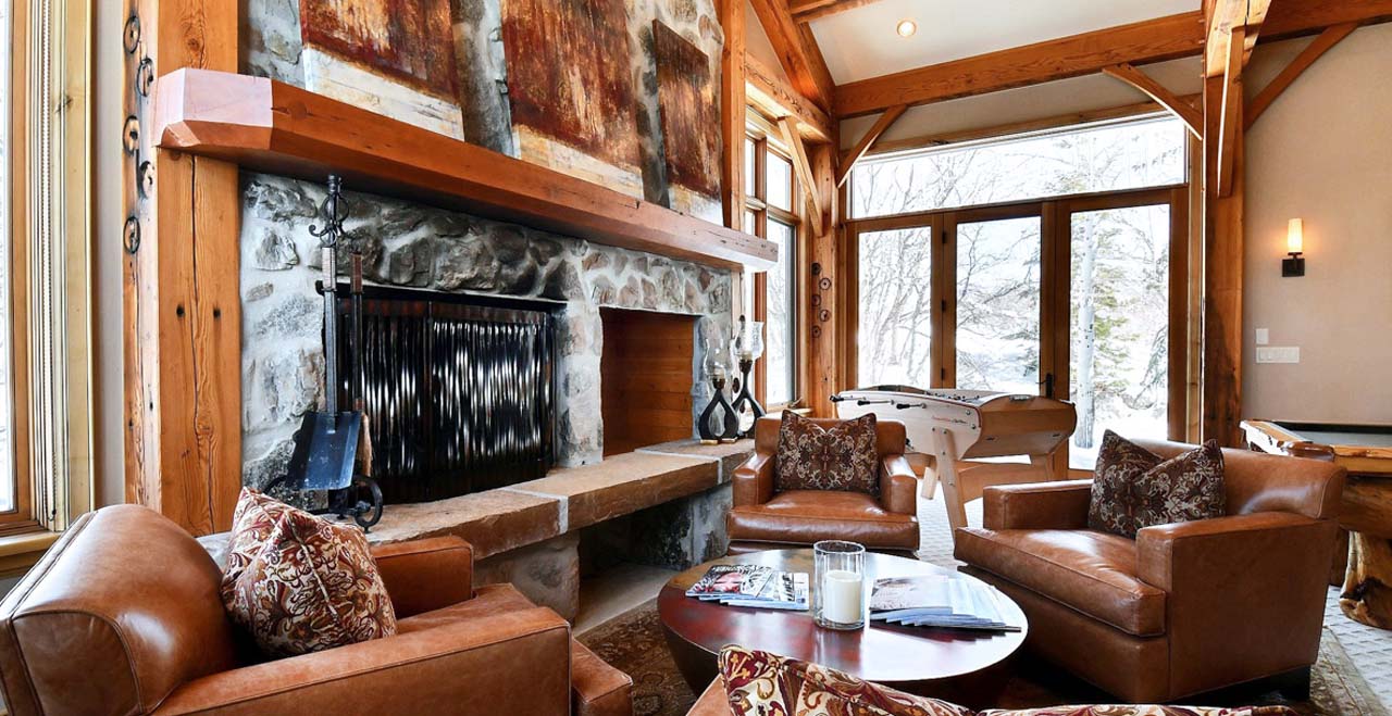 The main level welcomes guests to a sunny great room with three walls of floor-to-ceiling windows, a river-rock fireplace, and two full-length sofas. At one end of the room, two stately armchairs rest by the fireplace with views of the slopes at Snow Park. At the other, an elegant card table invites friendly games of chess.