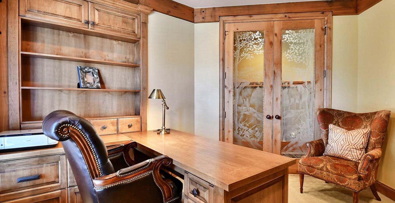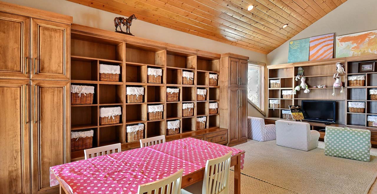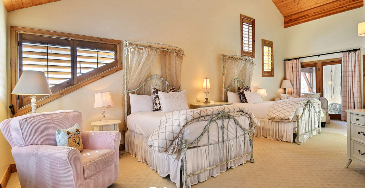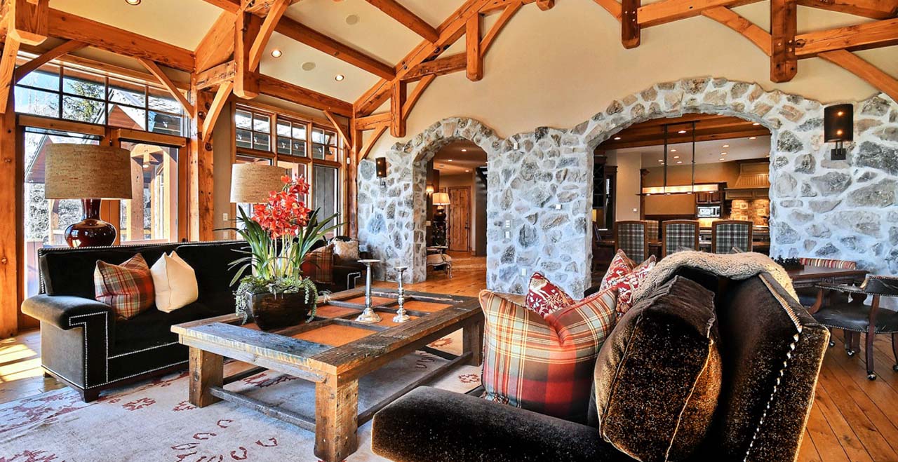 The main level welcomes guests to a sunny great room with three walls of floor-to-ceiling windows, a river-rock fireplace, and two full-length sofas. At one end of the room, two stately armchairs rest by the fireplace with views of the slopes at Snow Park. At the other, an elegant card table invites friendly games of chess.