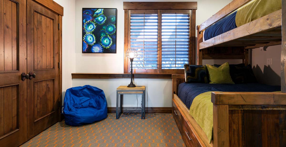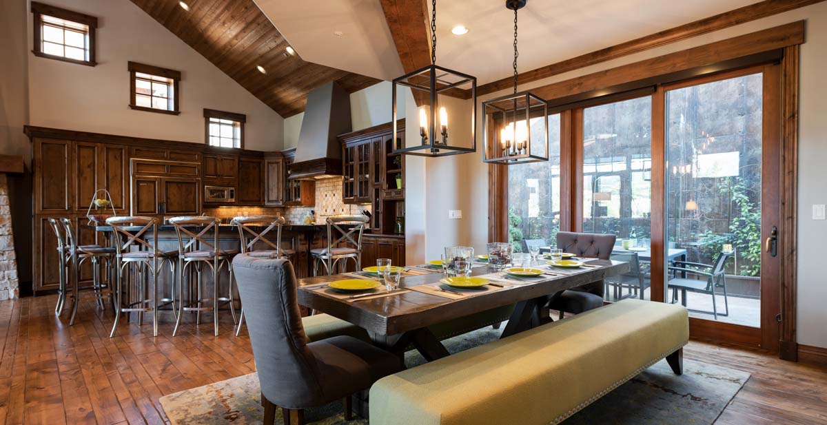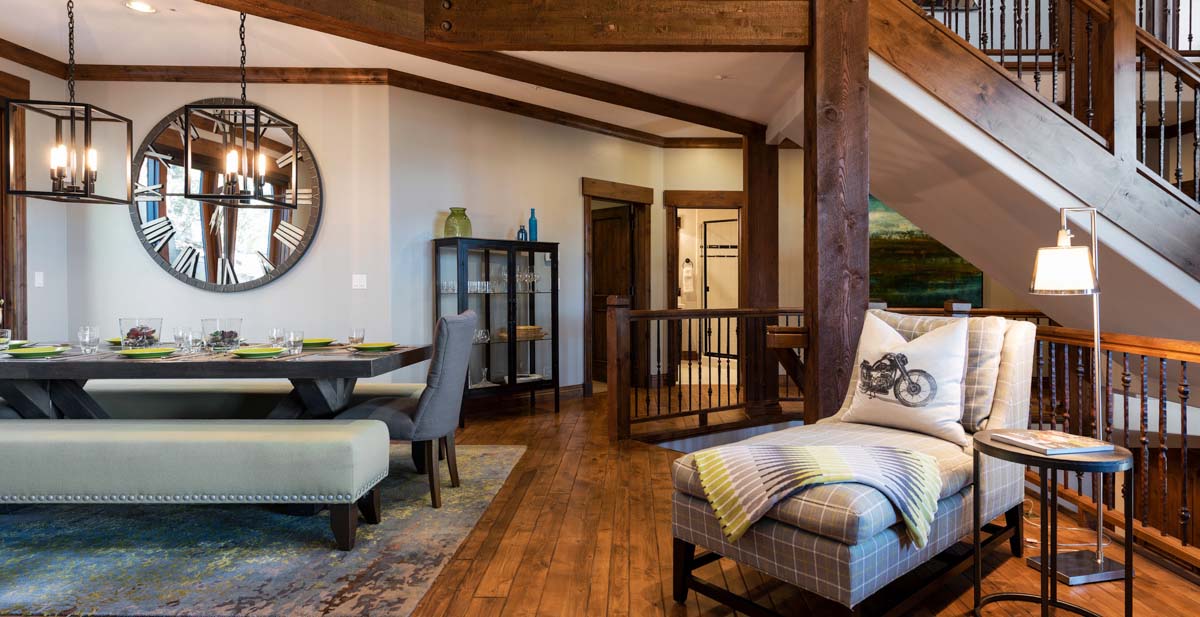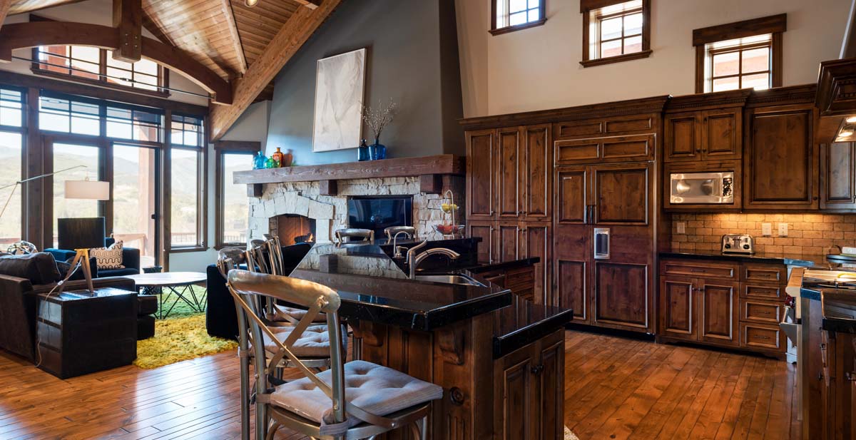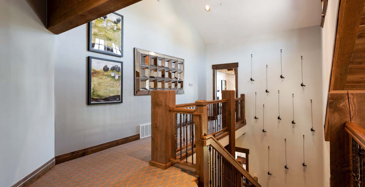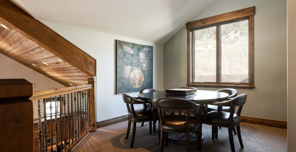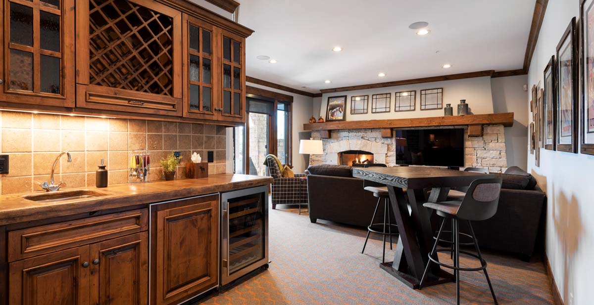 Just beyond this room, a four-seat high-top table and wet bar create a cozy space for apres-ski snacks and hot cocoa.