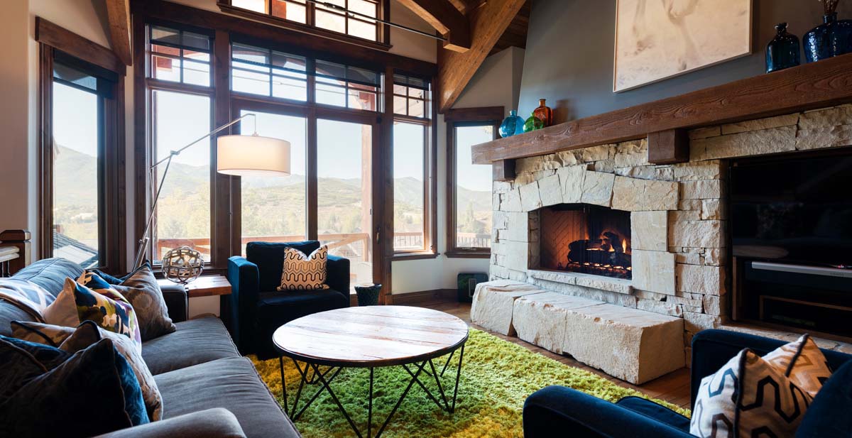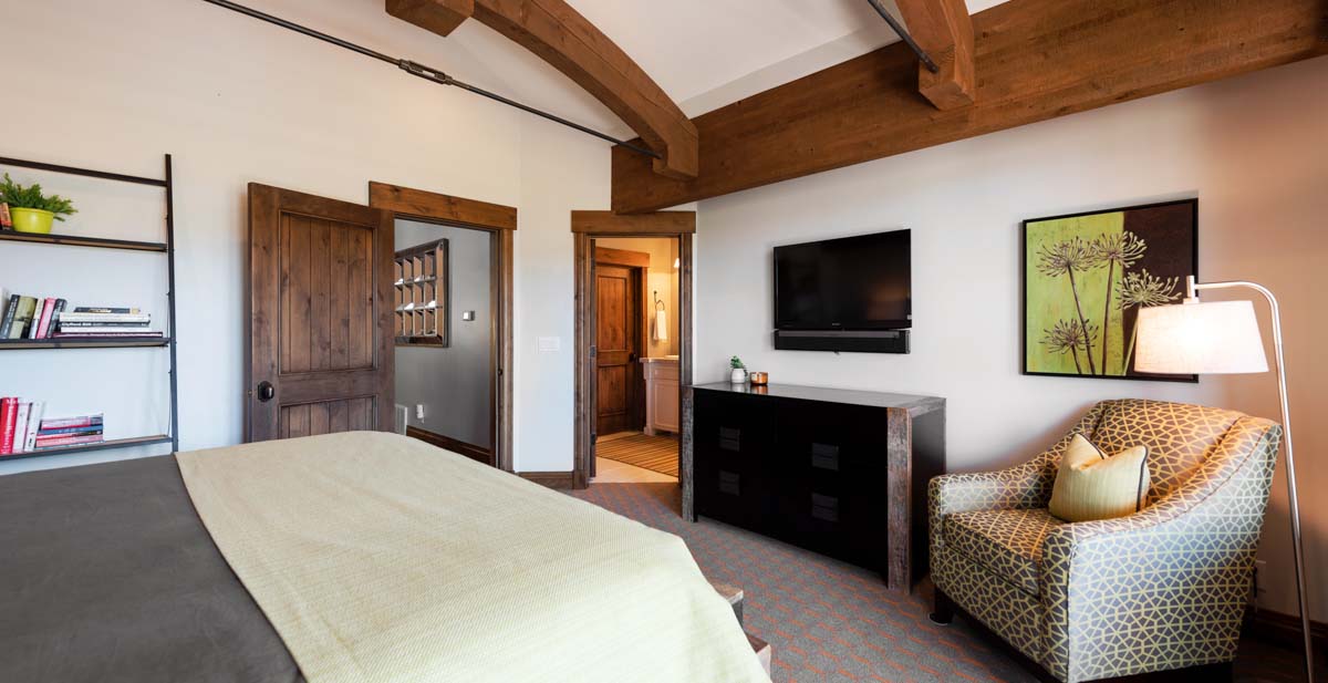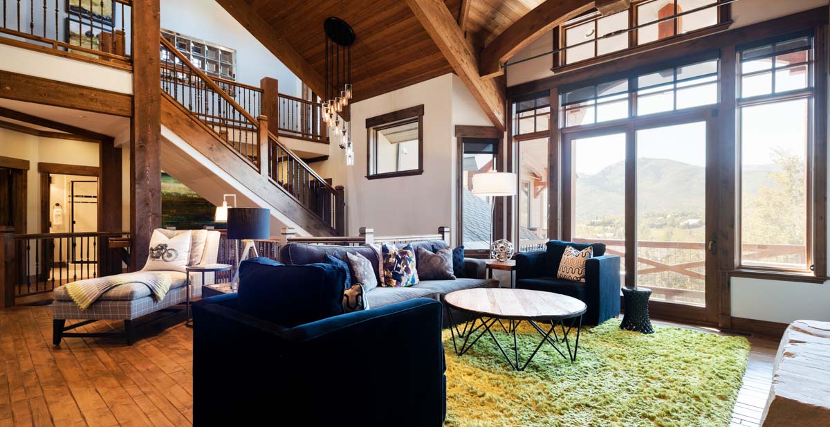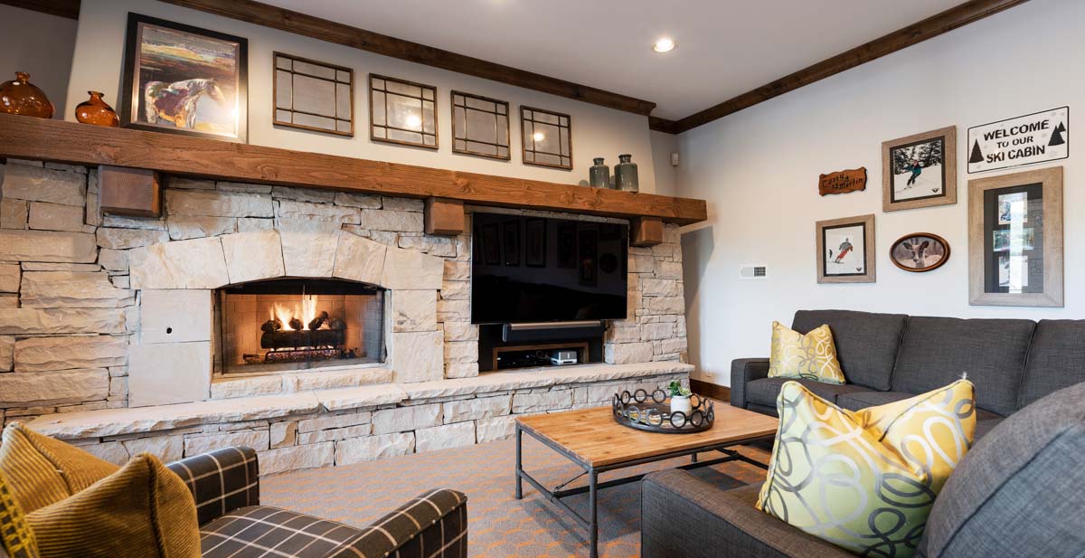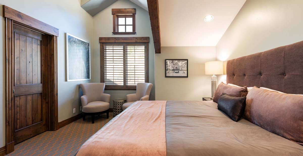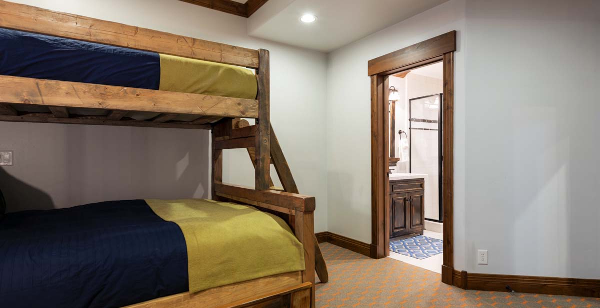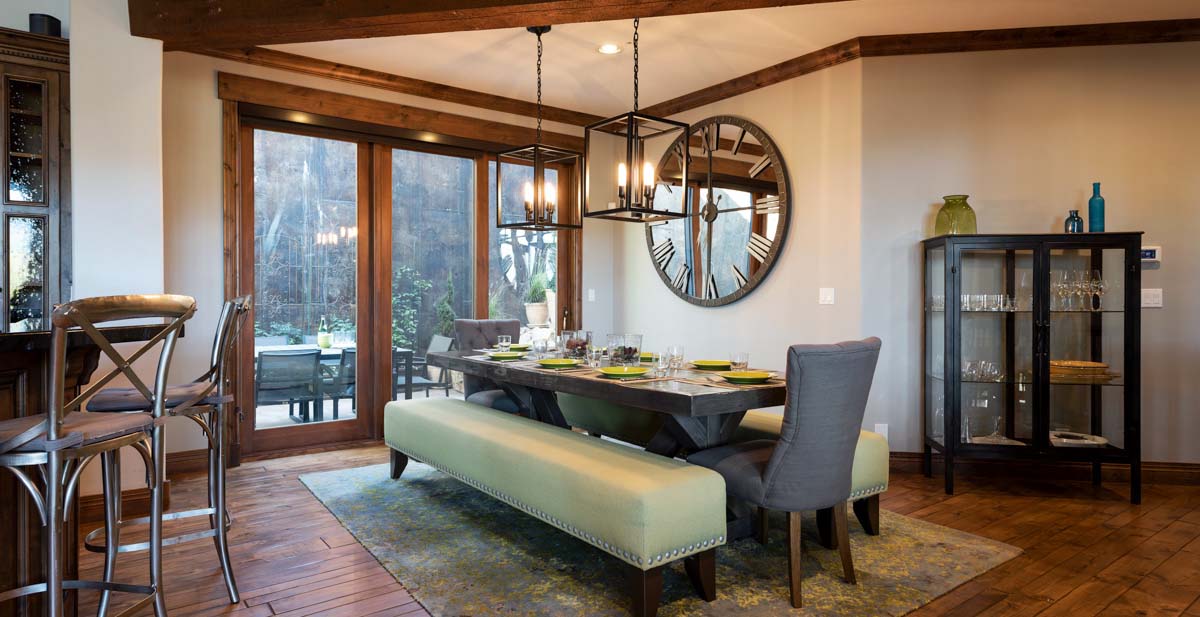 Just beyond this room, a four-seat high-top table and wet bar create a cozy space for apres-ski snacks and hot cocoa.