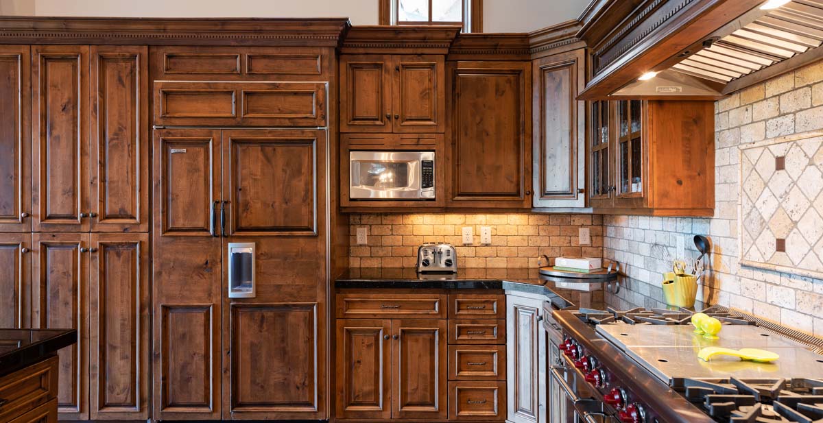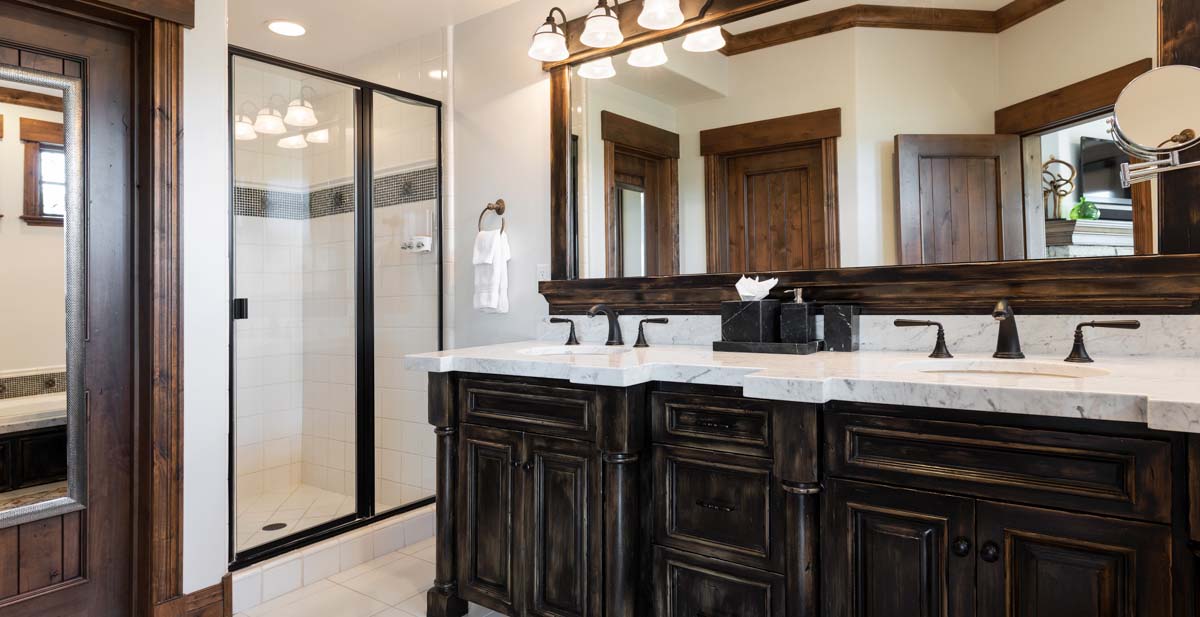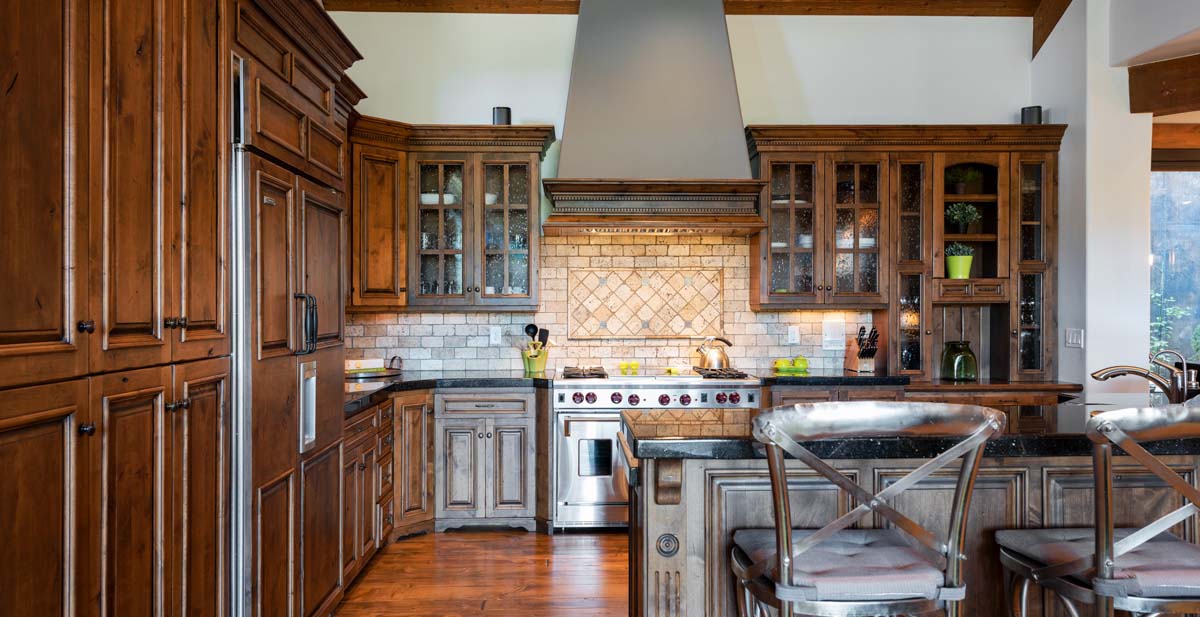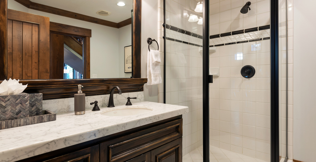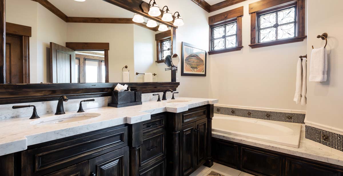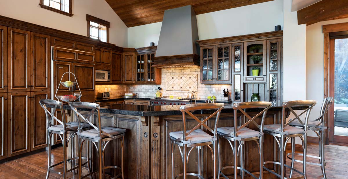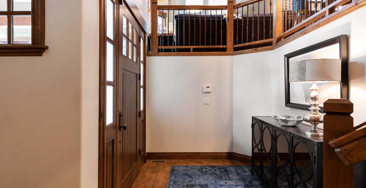 Just beyond this room, a four-seat high-top table and wet bar create a cozy space for apres-ski snacks and hot cocoa.