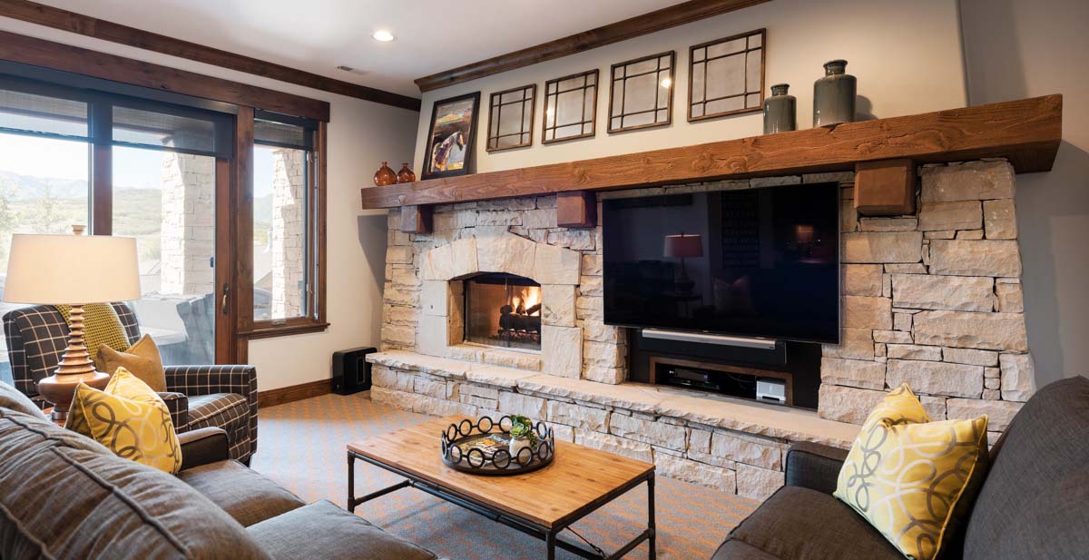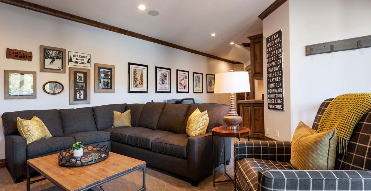 The use of patterns, textures, and colors creates a sophisticated, modern mountain dream home with expansive views. Second Time opens onto a spacious lower-level family room with a sectional queen sleeper sofa and two comfy armchairs facing a gas fireplace and large-screen TV. Glass doors open this room to a private, furnished deck overlooking Park City Mountain with West-facing views for spectacular sunsets.