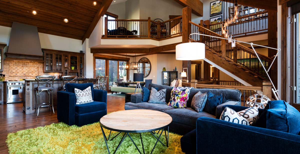 Upstairs, an open floor plan marries the great room, gourmet kitchen and dining area with double-height ceilings, hardwood floors and modern accents in a modern mountain style. In the great room, a shaggy lime accent rug accents a royal blue sofa and twin club chairs with whimsical throw pillows and industrial-inspired art. Get cozy by the grand stone fireplace or settle in to watch a movie on the large-screen TV.