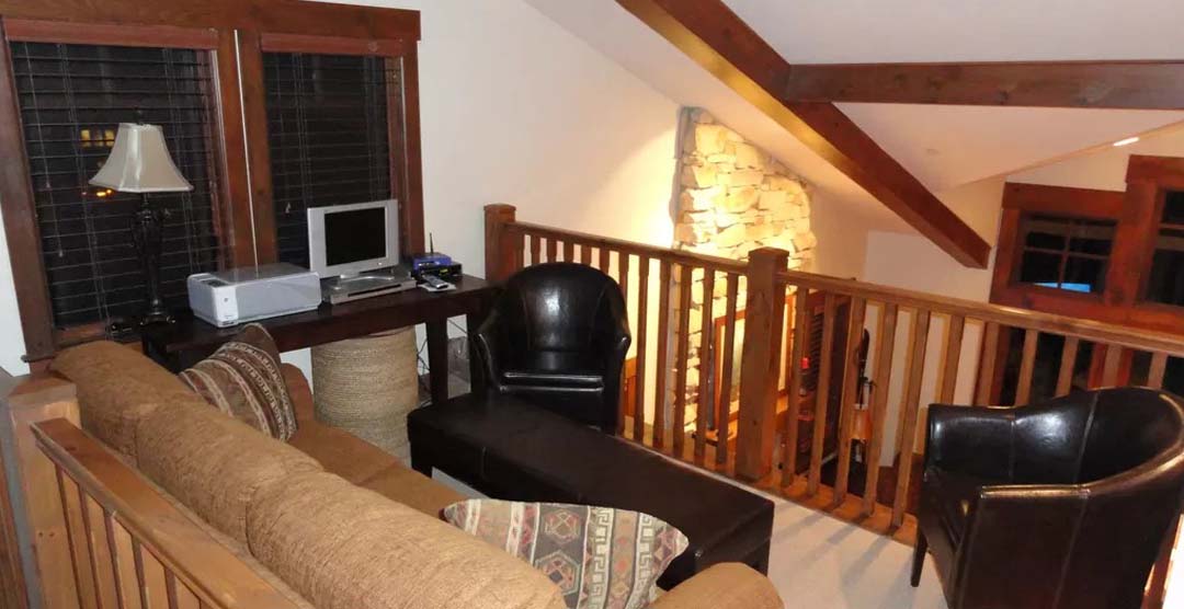 The third bedroom is decorated in Victorian style, with tall 4-poster bed and matching décor. The fourth bedroom is very large and contains two queen sized mountain-style beds, making it ideal for several adults or a number of children. The upstairs loft includes a twin sleeper sofa and writing desk and central open location that facilities its use for kids playroom or ‘king of the mansion’ office space. Wireless internet is provided throughout the chalet.
