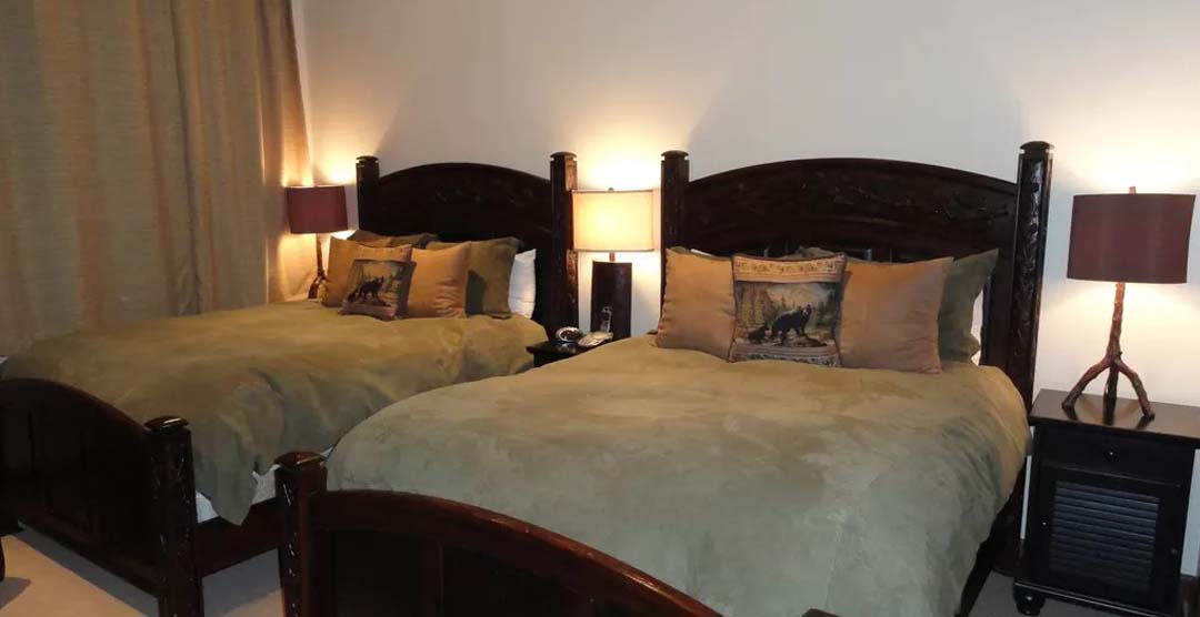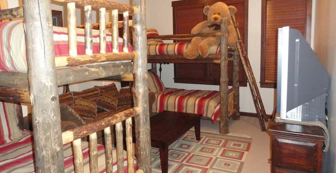 Three bedrooms on the lower floor provide for a variety of sleeping accommodations for every need, with each of the spacious bedroom having their own bathroom and multiple-window down-valley views. The huge second bedroom is designed as a kids room/media room, with two sets of log bunk beds, large mountain sofa which can sleep a 5th person in the room, and a huge 55-inch Sony LCD-projection TV.