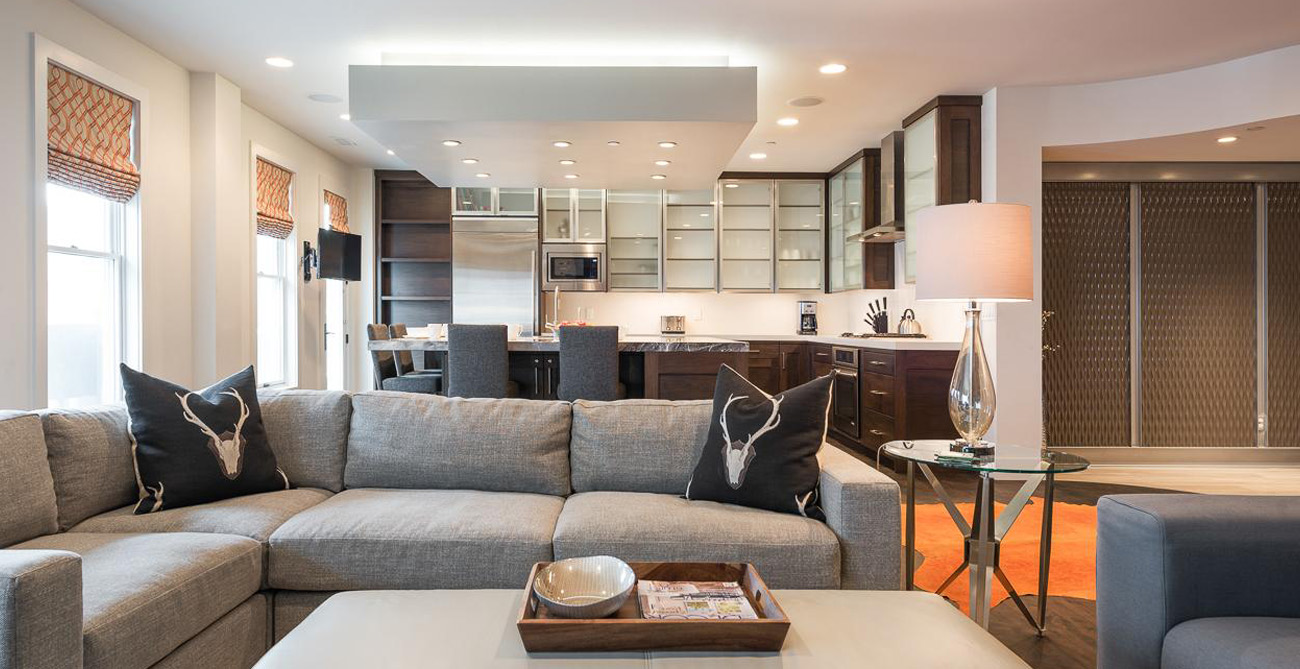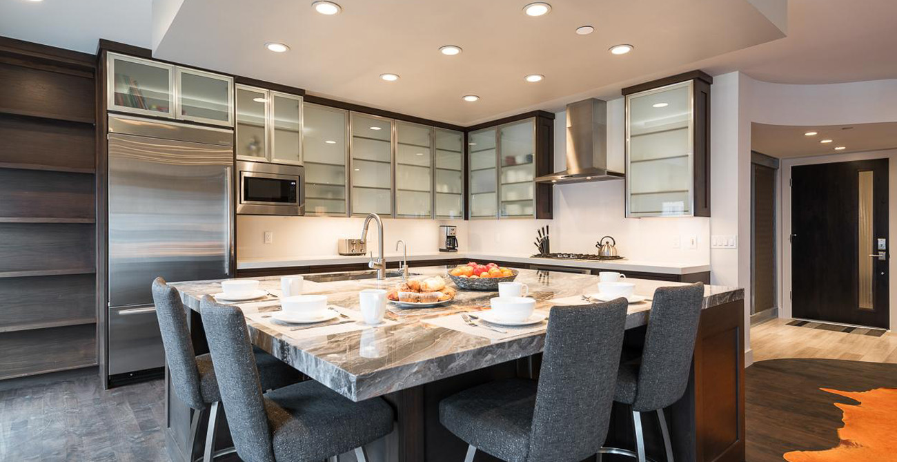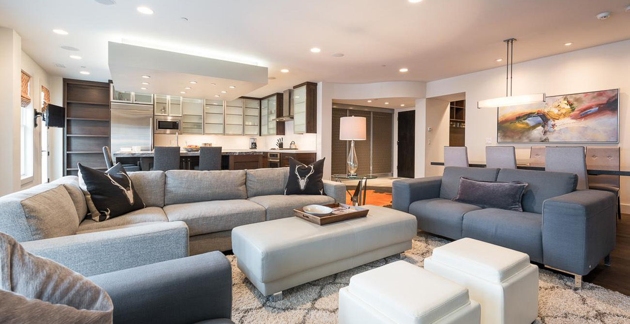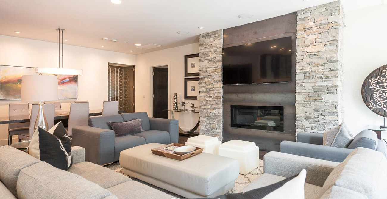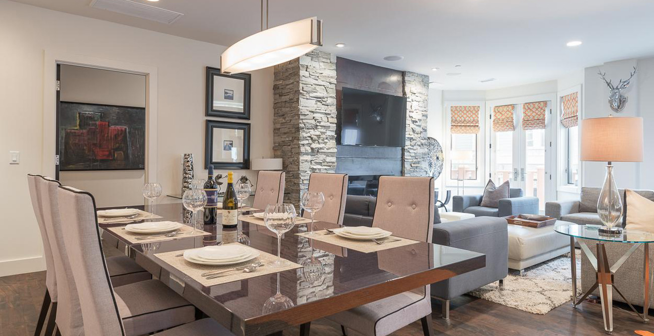 This attractive condo comfortably accommodates 11 guests with its 4 bedrooms and central, open living space. Living, kitchen and dining areas blend into each other, perfect for gatherings or claiming your personal space to relax. The living room furnishings are a balanced mix of style and function with clean lines and natural textures. Ample seating means guests can curl up next to the fireplace on the sprawling sectional after a long day on the slopes or comfortably lounge and converse during a catered social gathering.