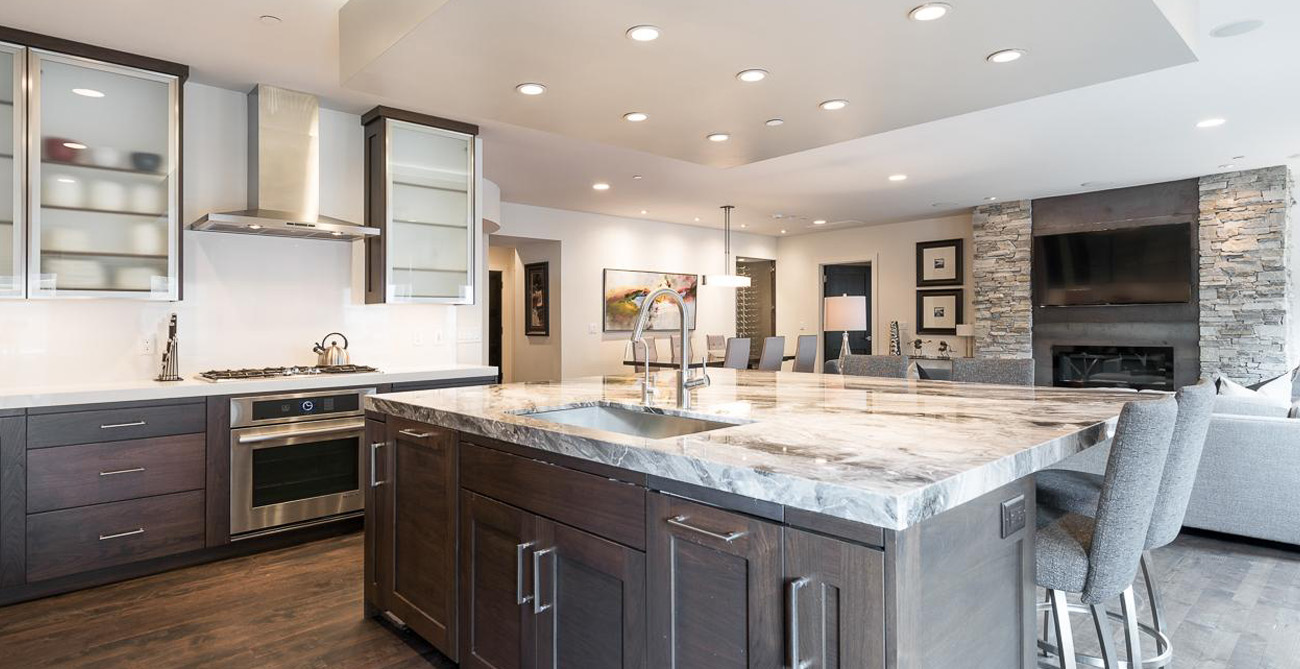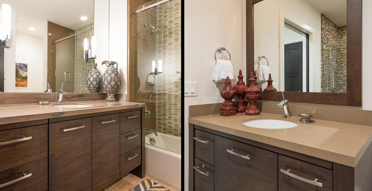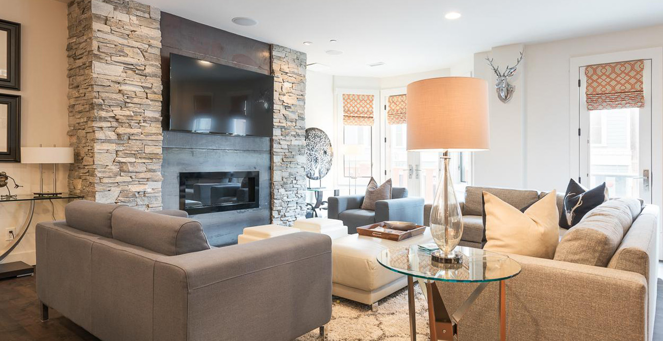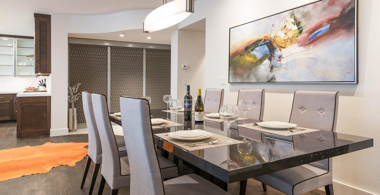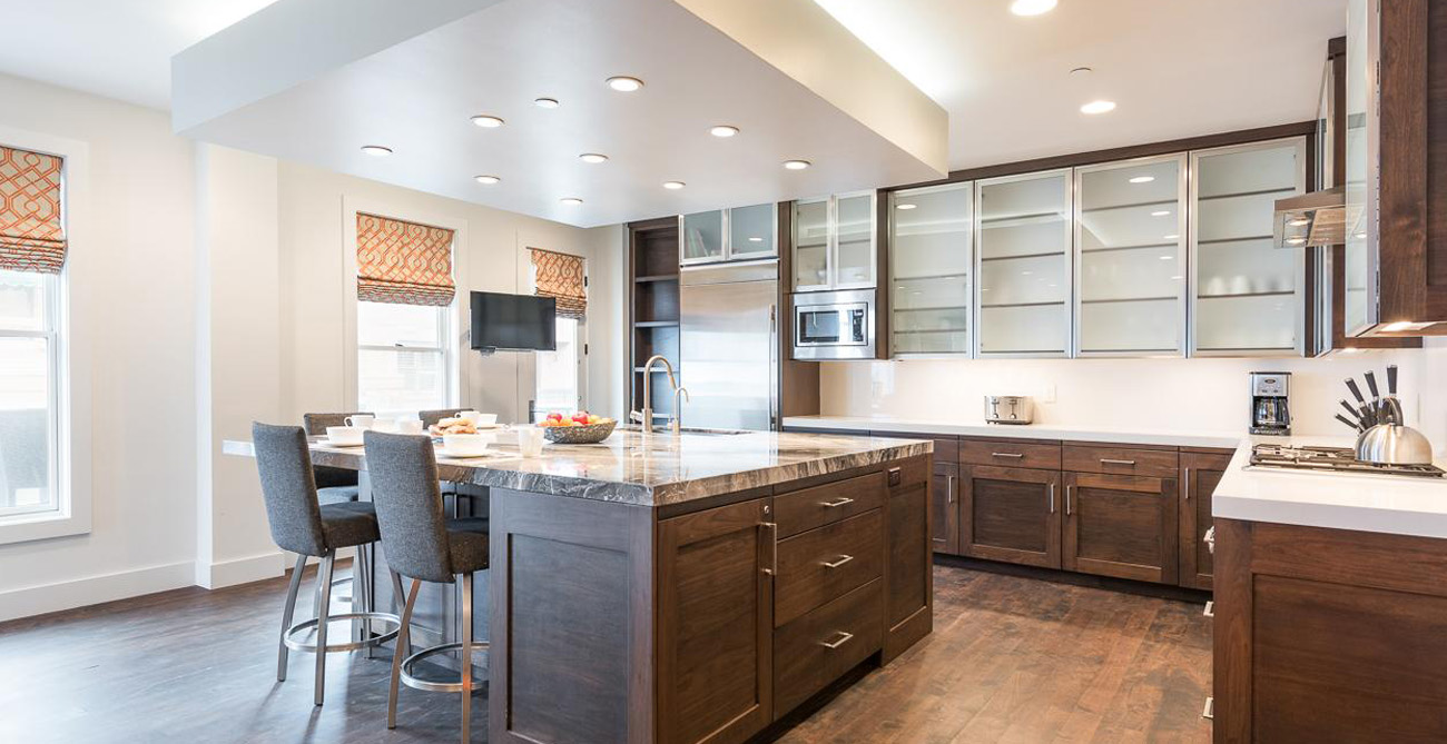 This attractive condo comfortably accommodates 11 guests with its 4 bedrooms and central, open living space. Living, kitchen and dining areas blend into each other, perfect for gatherings or claiming your personal space to relax. The living room furnishings are a balanced mix of style and function with clean lines and natural textures. Ample seating means guests can curl up next to the fireplace on the sprawling sectional after a long day on the slopes or comfortably lounge and converse during a catered social gathering.