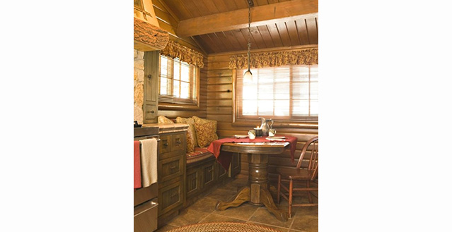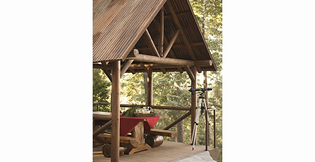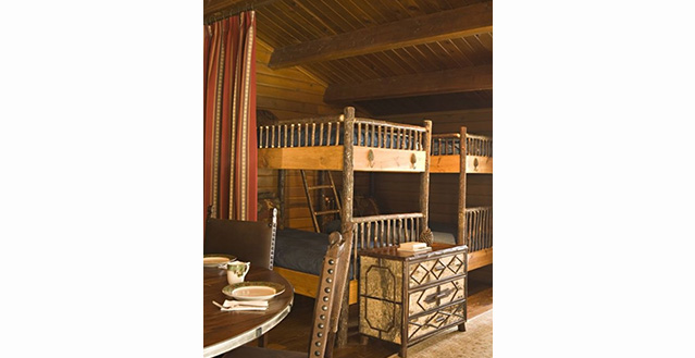 The Guest Lodge (sleeps 9) is a real log building consisting of three rooms; great-room, kitchen/dinette, and gender-neutral bathroom with two private stalls, a private shower and two sinks. The great-room has a fireplace and seating area, with a flat-screen TV (cable and DVD), Wi-Fi, and i-Pod dock. Next to the seating area is a unique bunk bed with a double mattress below with standard twin bunk above. In the center of the room there is a large round dining table that seats 8 people. At the far end, there are three 3 bunks (sleeps 6), which can be screened from the great-room with a large privacy curtain. The kitchen/dinette is fully stocked. The outdoor patio has a fantastic view of the lake, and contains a gas grill, and outdoor fireplace, covered eating area and luxury seating.