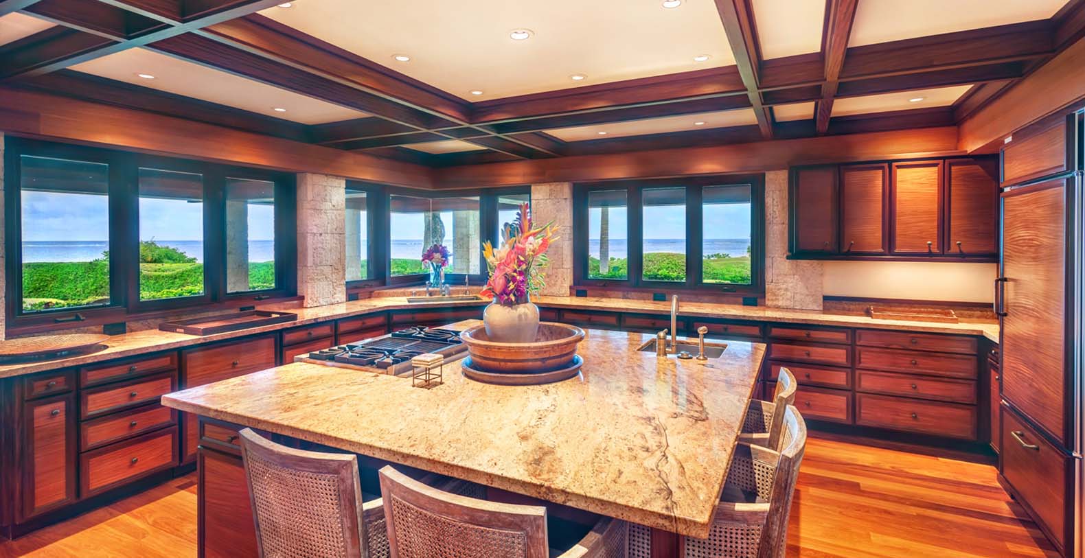 The large kitchen is great for the food enthusiast, or a private chef to prepare a meal to be enjoyed on the outdoor dining table just off the kitchen.