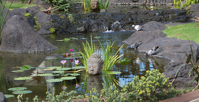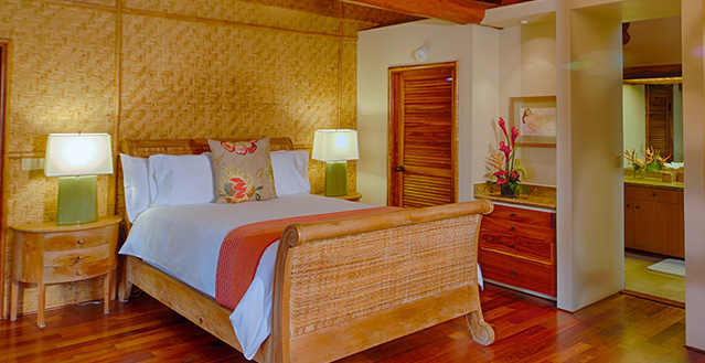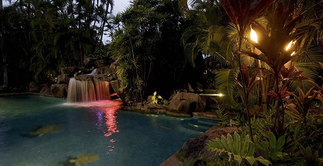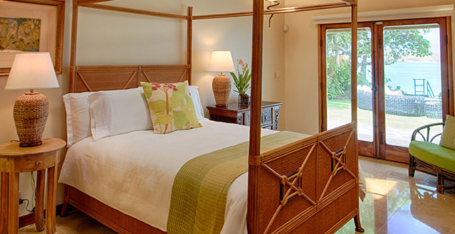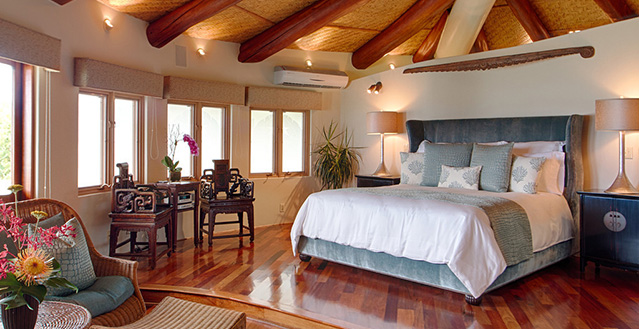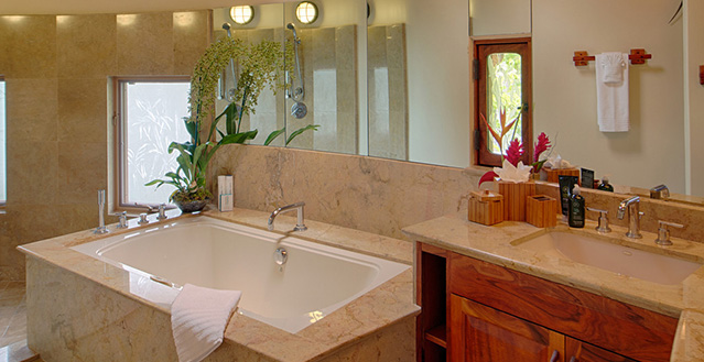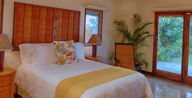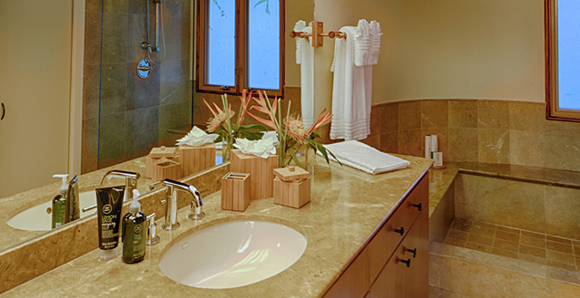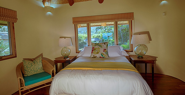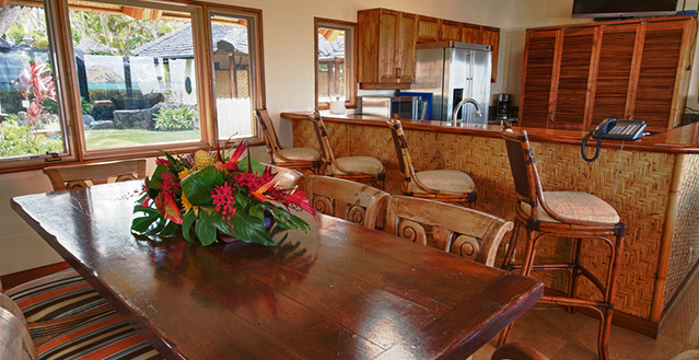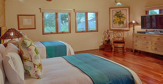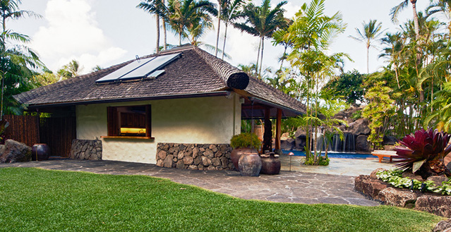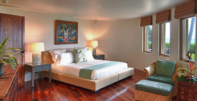 Architect, Carey Smoot, created a small Hawaiian-style village compromised of 7 separate structures. The main living bungalow features the living room, kitchen, half bath, two master suites each with a queen size bed and full bath. The Boat House has a downstairs aquatic center and full bath; upstairs there is an entertainment area, bedroom with two queen beds (one in loft area) and one half bath. The Entertainment Pavilion offers an auxiliary kitchen, bar and open air living areas. The Guest House has two bedrooms each with a queen size bed and a half bath. The Bath House features a Japanese "Furo" (bath) shower and sauna. The Pool Cabana includes a large entertainment area, 2 full baths, swimming pool with waterfall and a hot tub. The seventh bungalow or the optional "Carriage House or Staff Quarters" consists of two bedrooms and two bathrooms located above the garage. The estate may be rented as a 5 bedroom/10 bath, or as a 7 bedroom/12 bath with the addition of the 2 bedroom/2 bath carriage house. In total, the estate provides 7 queen beds and 1 queen futon.