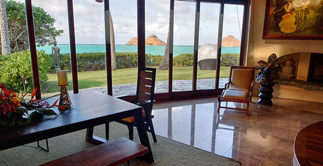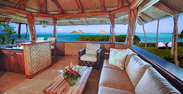 The estate includes a two-bedroom guesthouse, a Japanese bathhouse with a furo bath and sauna, dining and kitchen pavilion with a charming open entertainment bar, pool cabana with waterfall and secluded hot tub, staff quarters/carriage house, and a garage with wine cellar and storage rooms. Located in lovely Lanikai, overlooking the Mokulua Islands, featuring 230 ft. of white sand beach, this 1.3 acre Polynesian Village lies amidst a tropical paradise of native foliage and trees loaded with scrumptious fruit. Complete with daily maid service, this fantastic vacation property leaves nothing to be desired.