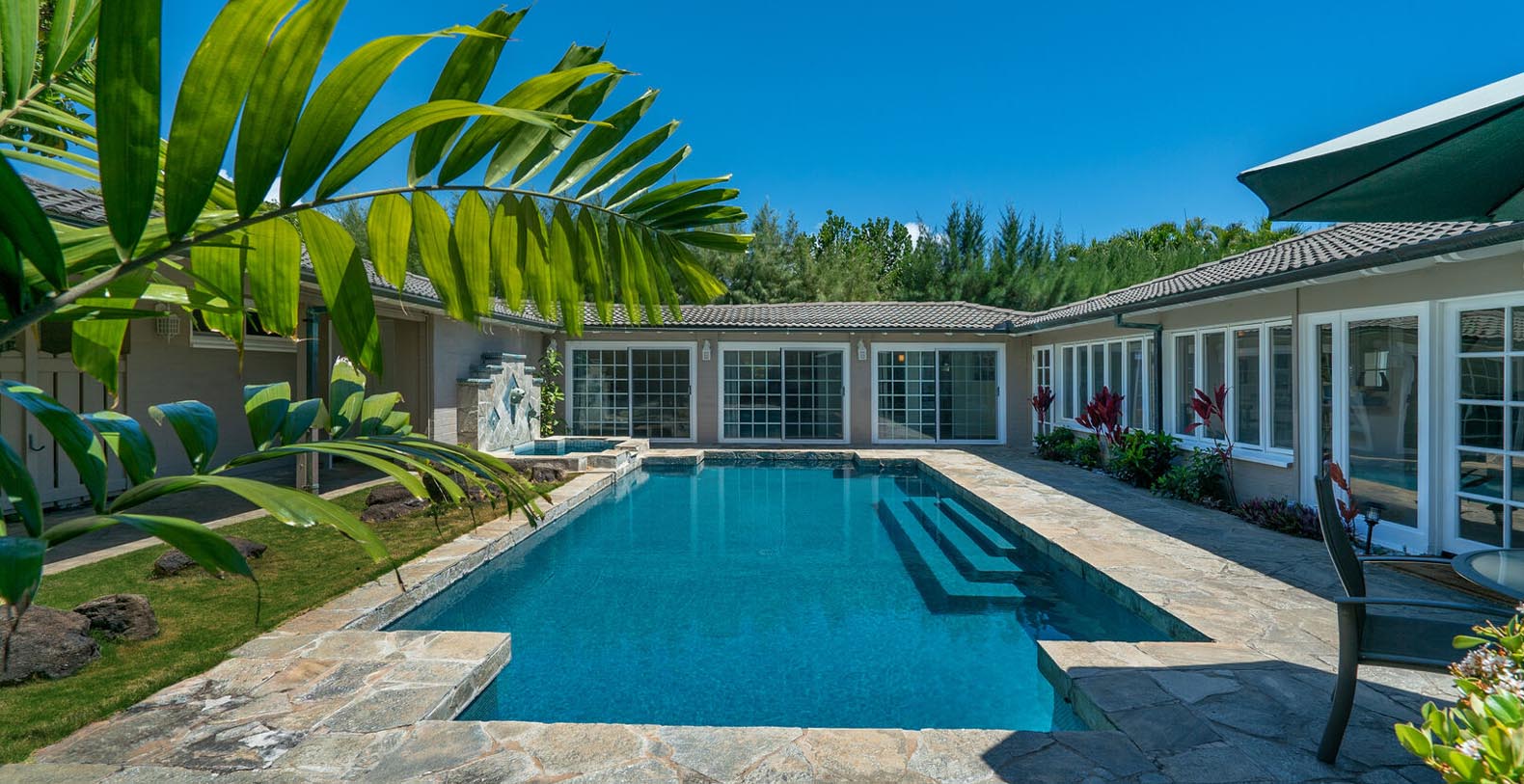 Step back in time and experience a peaceful, private Hawaiian lifestyle at this one of a kind beach house located on a million dollar beach front lot. This home has over 3,100 spacious square feet of living space. The 6 bedrooms surround the large courtyard with a private pool, creating a very unique layout.