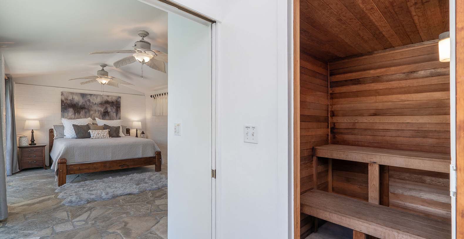 Two of the 6 bedrooms are connected to the main living quarters while the rest have private locking doors leading from the room to the courtyard and then into the main portion of the home. This gives the ultimate indoor/outdoor living experience. Bedrooms 3 and 4 share a Jack and Jill bathroom while bedroom 5 boosts the largest space and where the dry sauna is located. The smallest of the rooms is bedroom 6 with a queen bed. This room can also be converted into an office space upon request for those looking for a private location in the home to work.