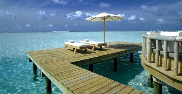 Sea level sundecks with sun loungers offering direct access into the crystal clear coral gardens and amazing marine life