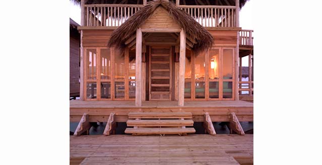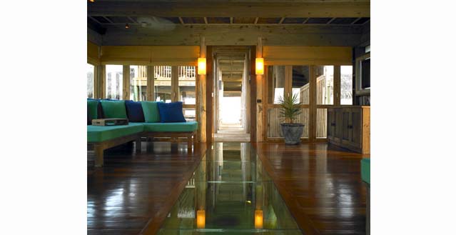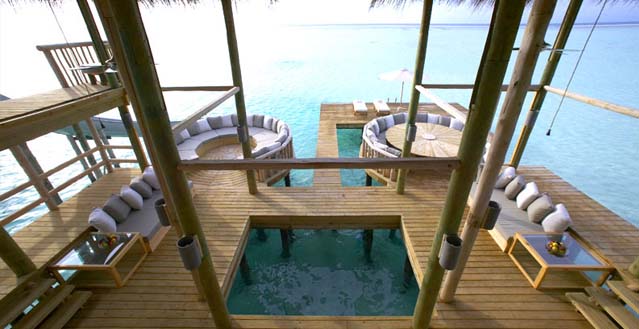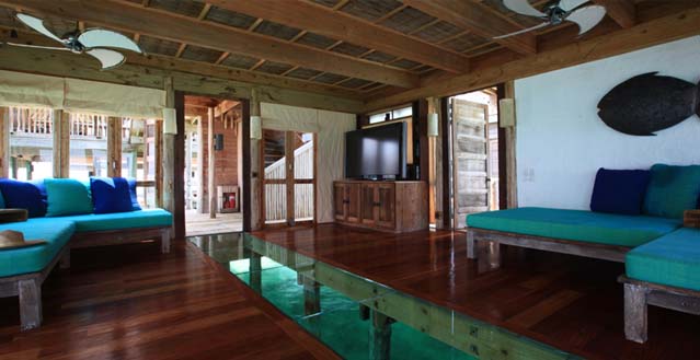 A large central open plan living area with sea garden, natural coral pool, surrounding viewing/ sun decks, dining area, writing desk and daybeds
