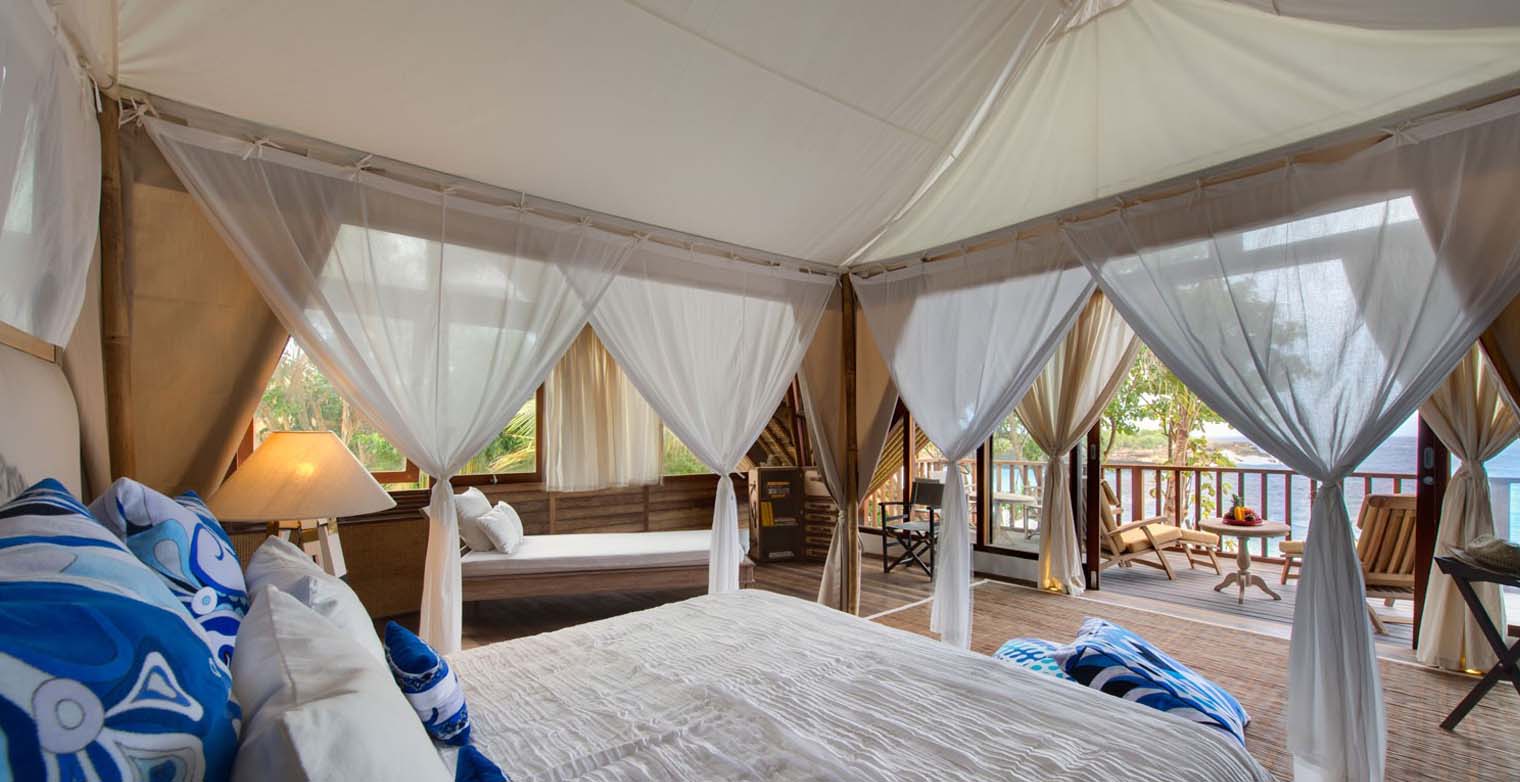 There’s a sense of space and freedom in the contemporary interiors, with comfortable sofas and tables crafted from reclaimed limed teakwood set before walls of glass framing the sea view beyond the deck. Accenting the neutral colour palette of creams and greys are couture designer touches and decorative flourishes supporting the glamour travel theme – vintage Louis Vuitton monogram steamer trunks; Prada, Tods, Aigner, and various other designer luggage, and lavishly illustrated coffee table books on exotic destinations, culture, art and architecture. Amplifying the luxury safari look is canvas and leather furniture from the Esprite Nomade collection, including their renowned bespoke tents that float over Voyage’s supremely comfortable beds.